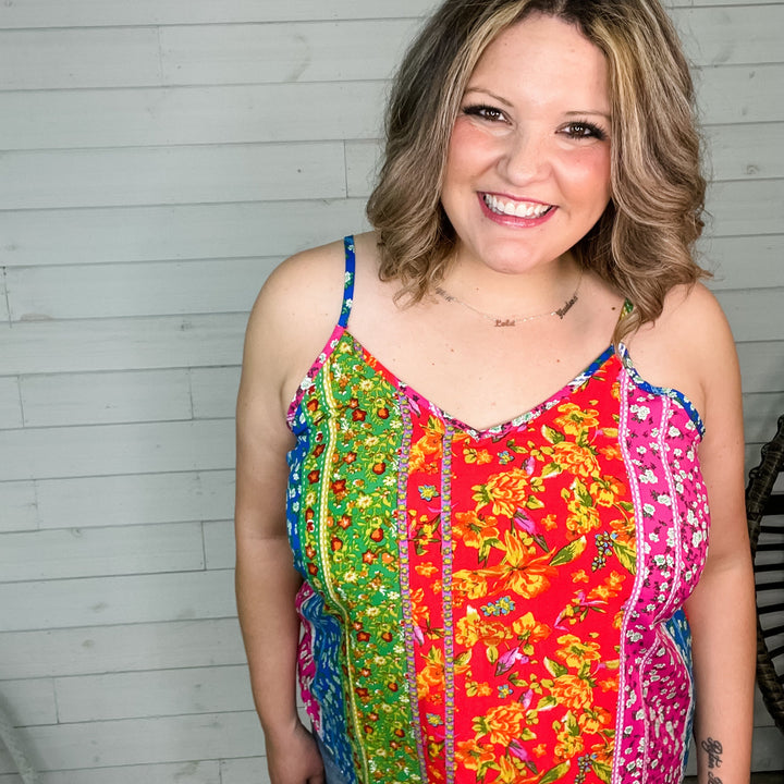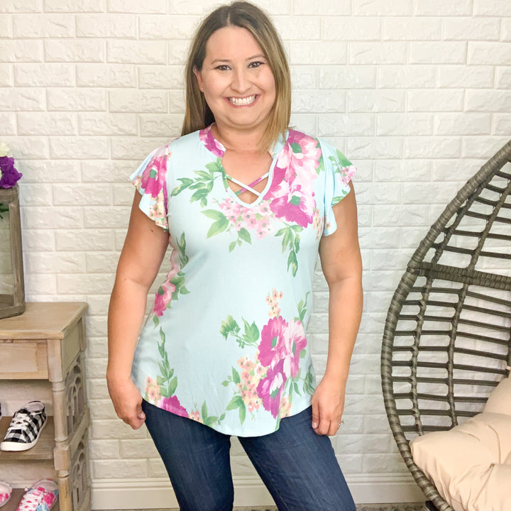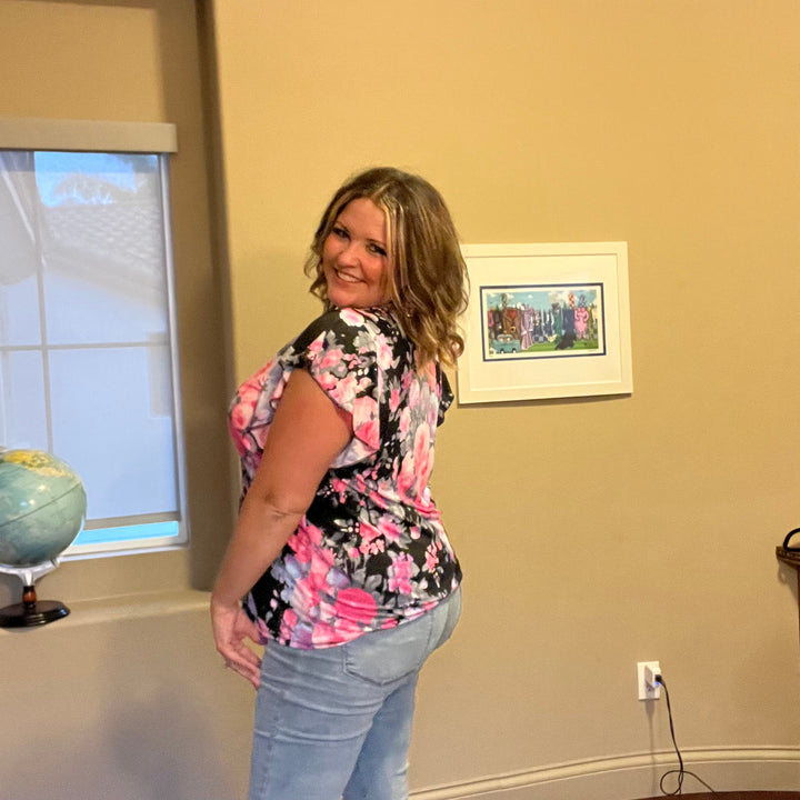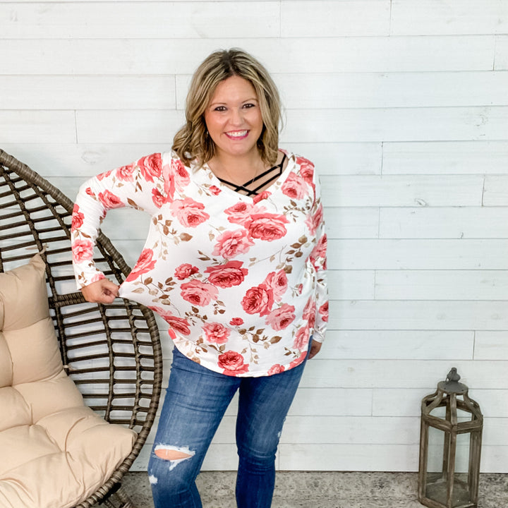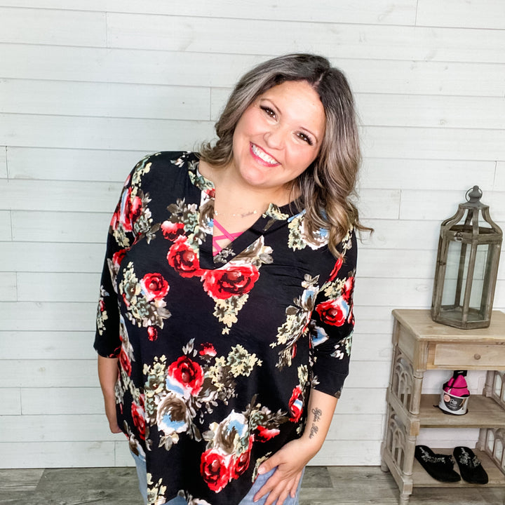 "Tawny" 3/4 Sleeve Floral V Neck Shark Bite Hem