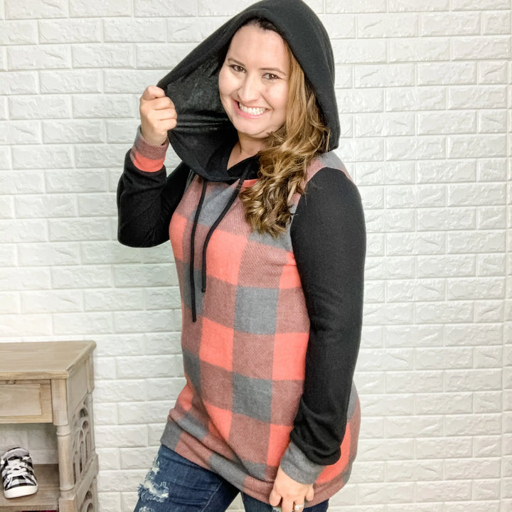 "Rosemary" Buffalo Plaid Hoodie (Solid Sleeve & Hood)