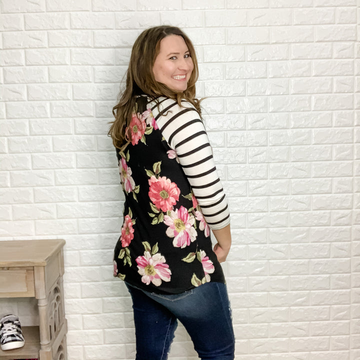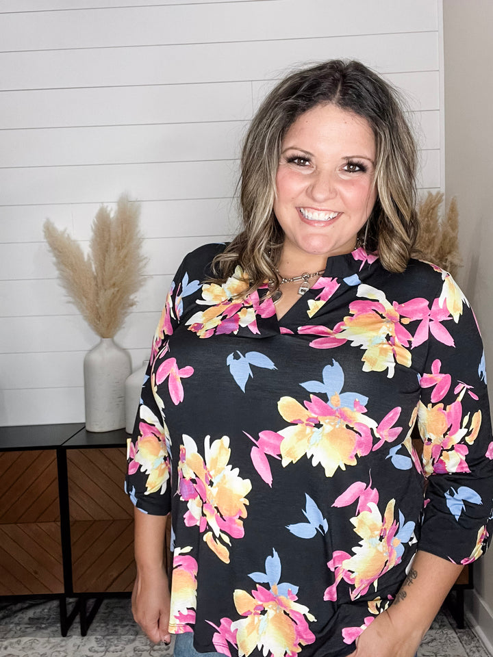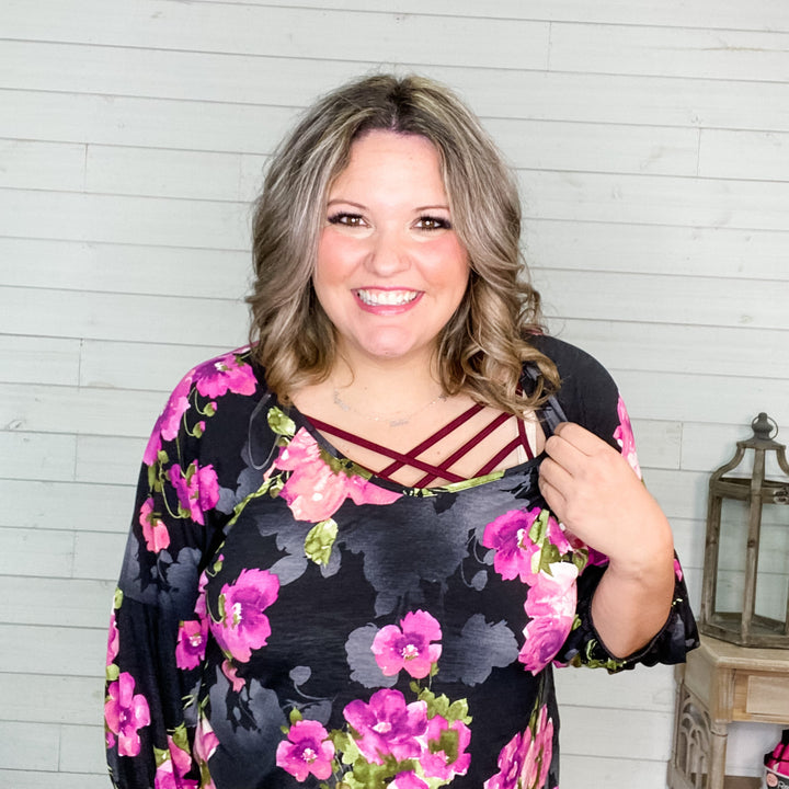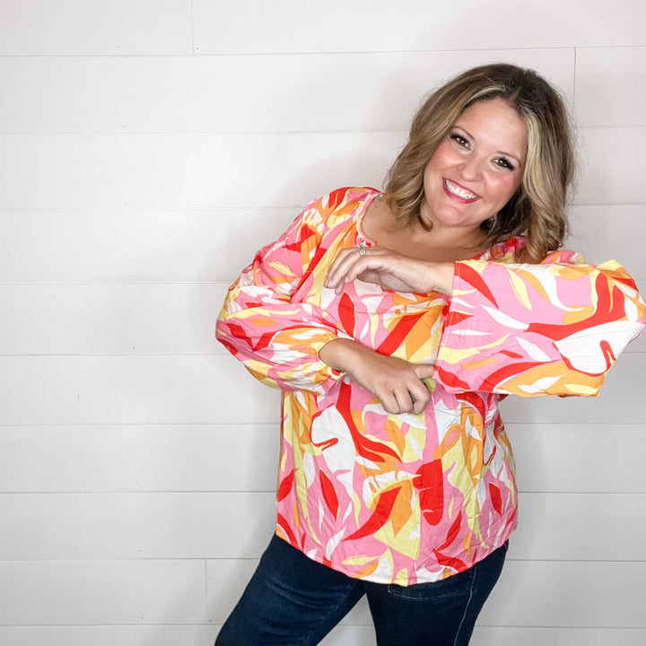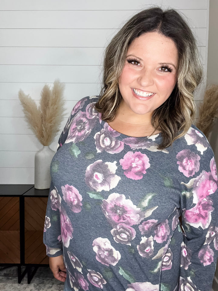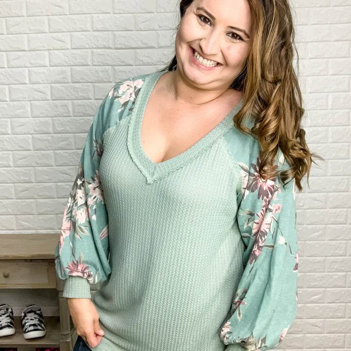"Sage Advice" Waffle Body V Neck Long Floral Sleeve Top