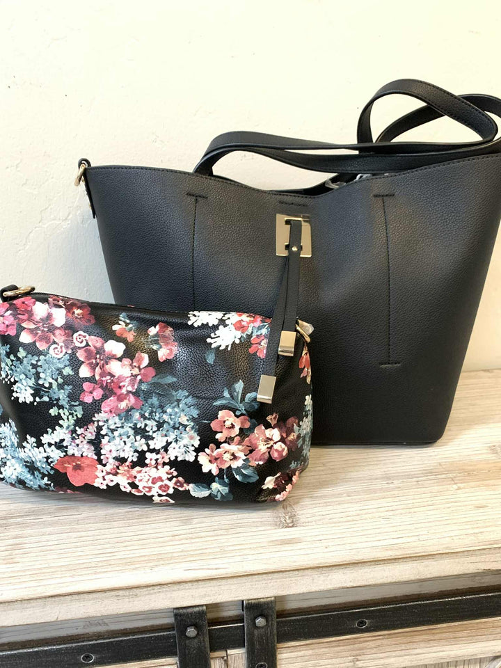 "Sandra" Solid Black Handbag with additional Floral Clutch