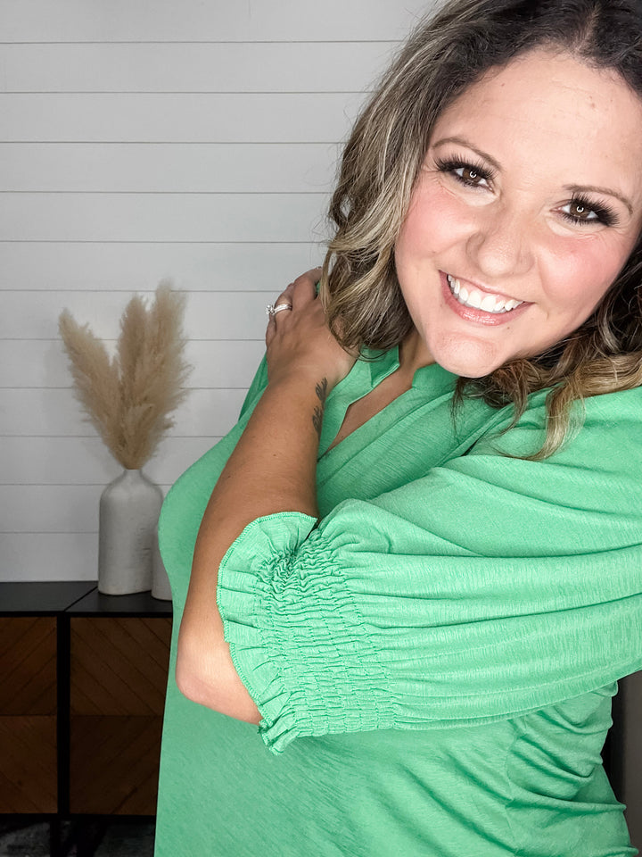 "Shocking" 3/4 Smocked Sleeve Split Neck (Kelly Green)