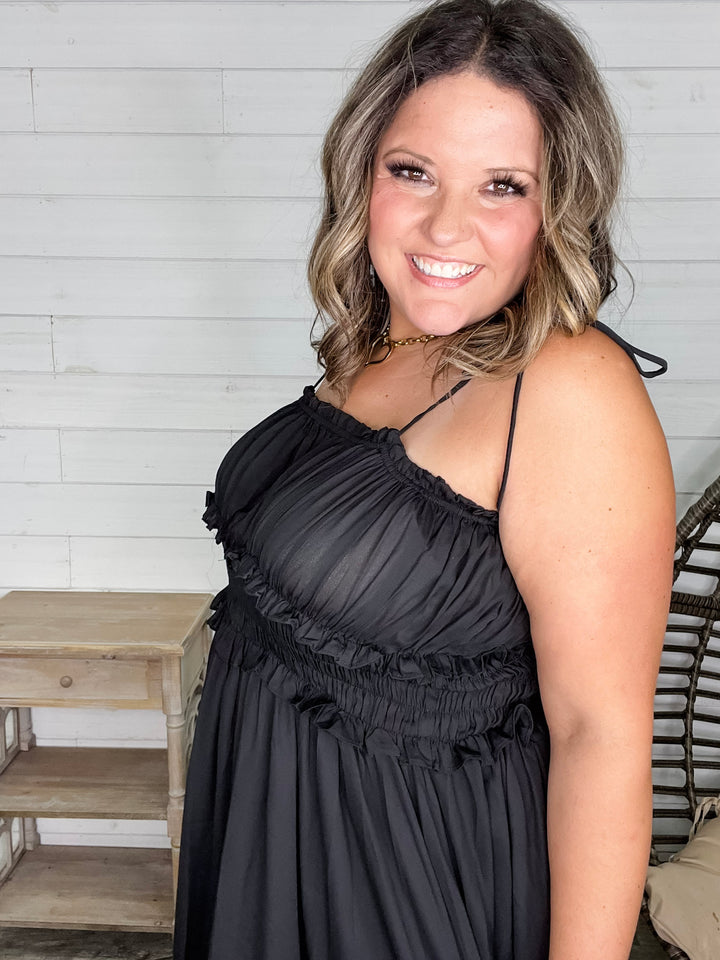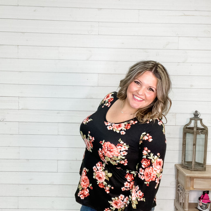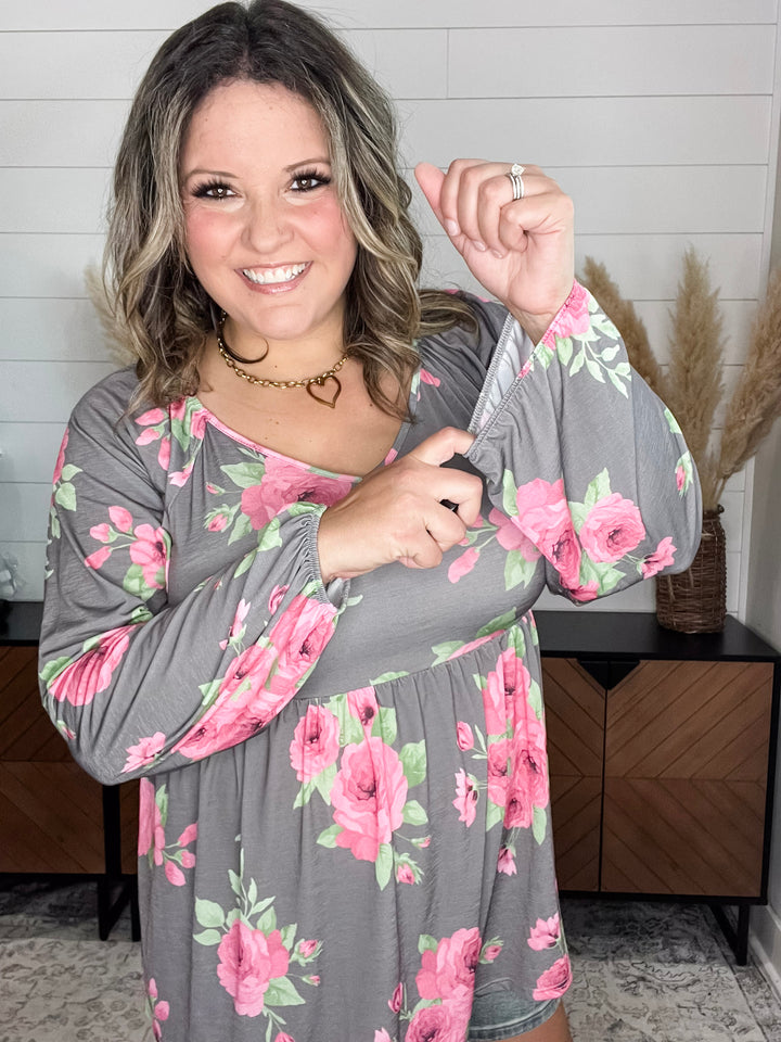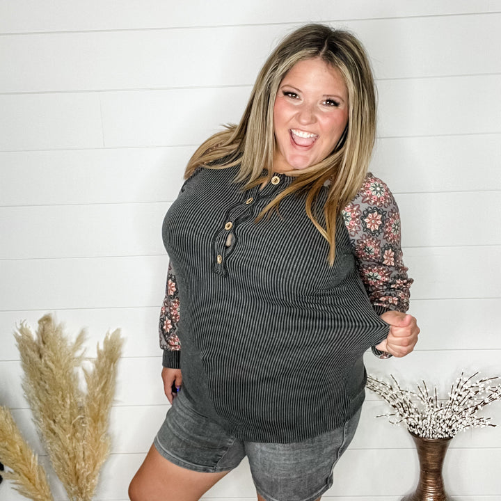 "Up To You" Ribbed Henley Style with Floral Long Sleeves (Charcoal)