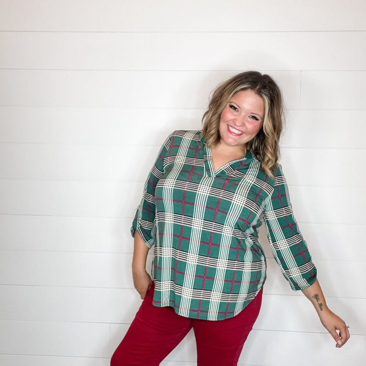 "Pinetop" Plaid Lizzy 3/4 Sleeve Split Neck