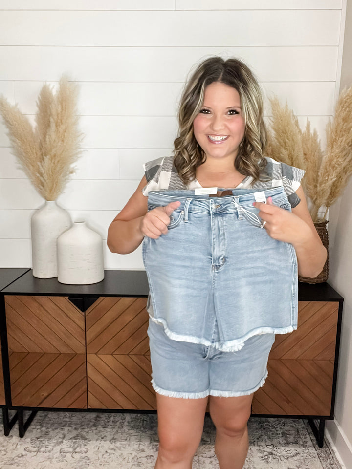 4.25 - 5.5 inch inseamJudy Blue "Sugar High" Released Hem Tummy Control Shorts
