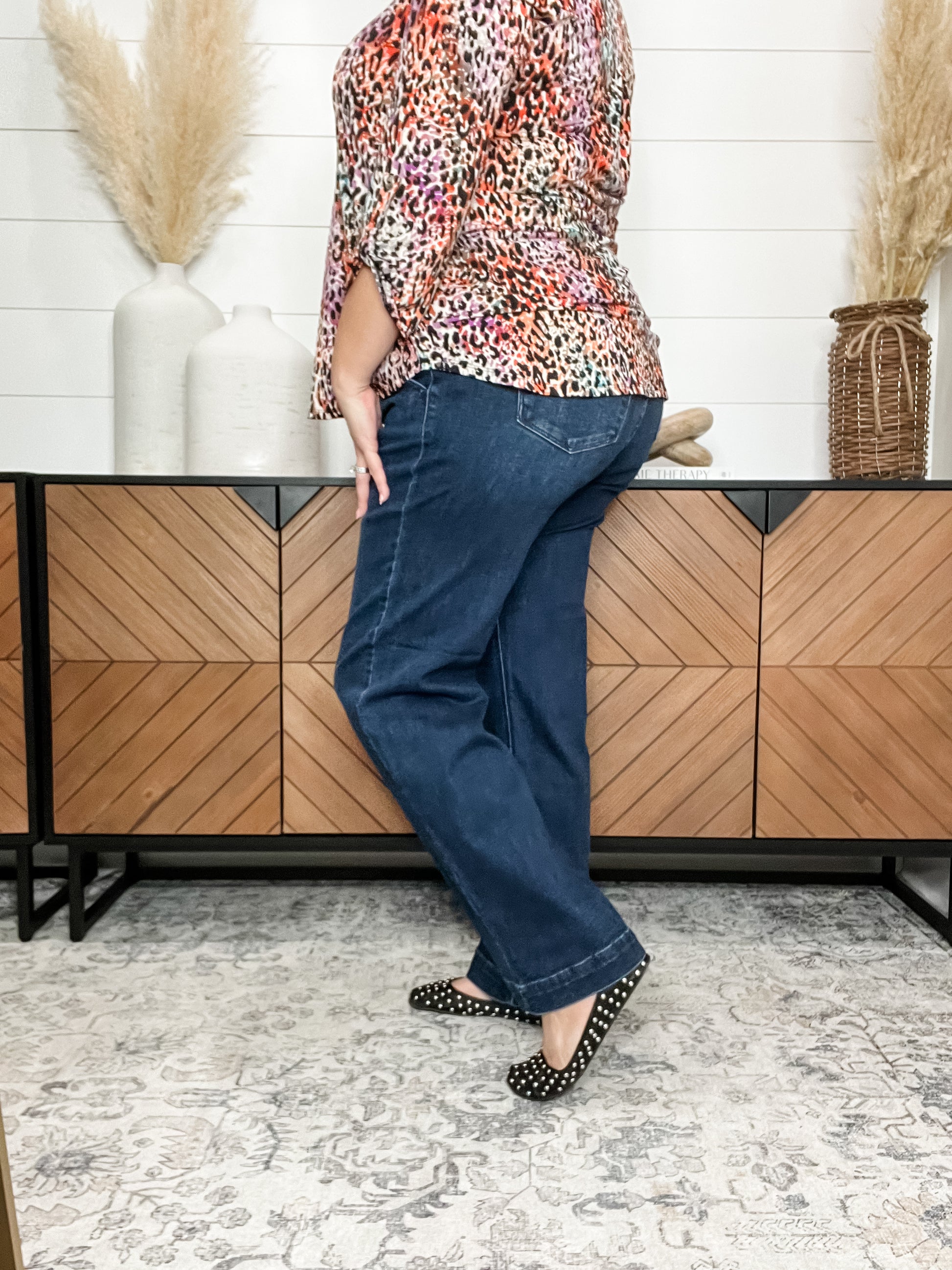 Double Button Judy Blue trouser style wide leg jeans are now available in a dark blue color. Featuring a thicker bottom hem trouser style and angled front pockets, these are darling worn dressed up and for casual Friday. Even size minus one is perfect on this pair. See full sizing below.