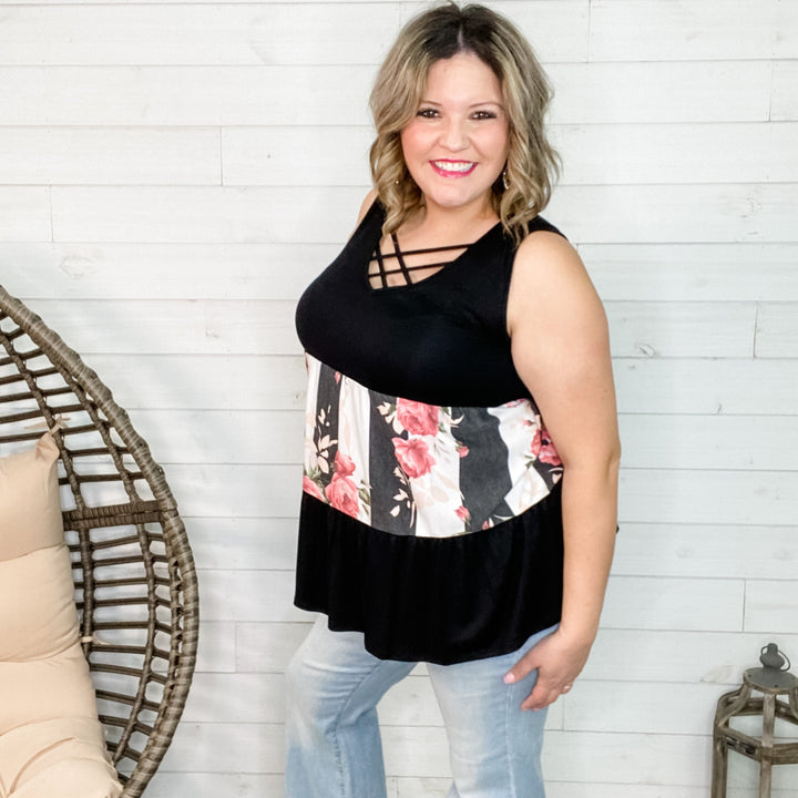 "Sage Advice" Waffle Body V Neck Long Floral Sleeve Top