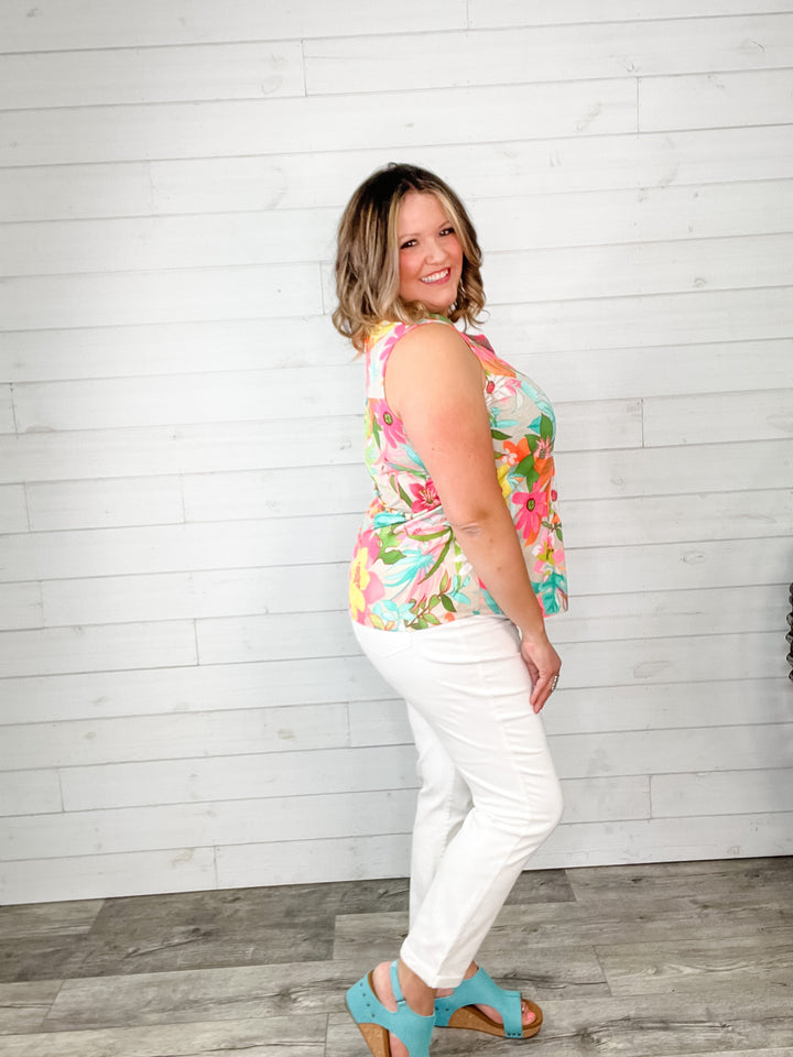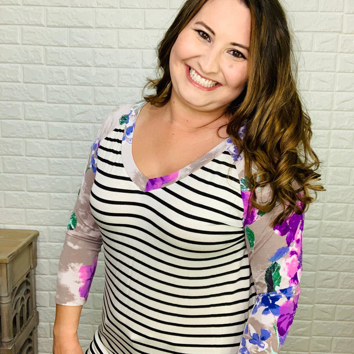 "Lucy" 3/4 Sleeve V Neck Floral Accents
