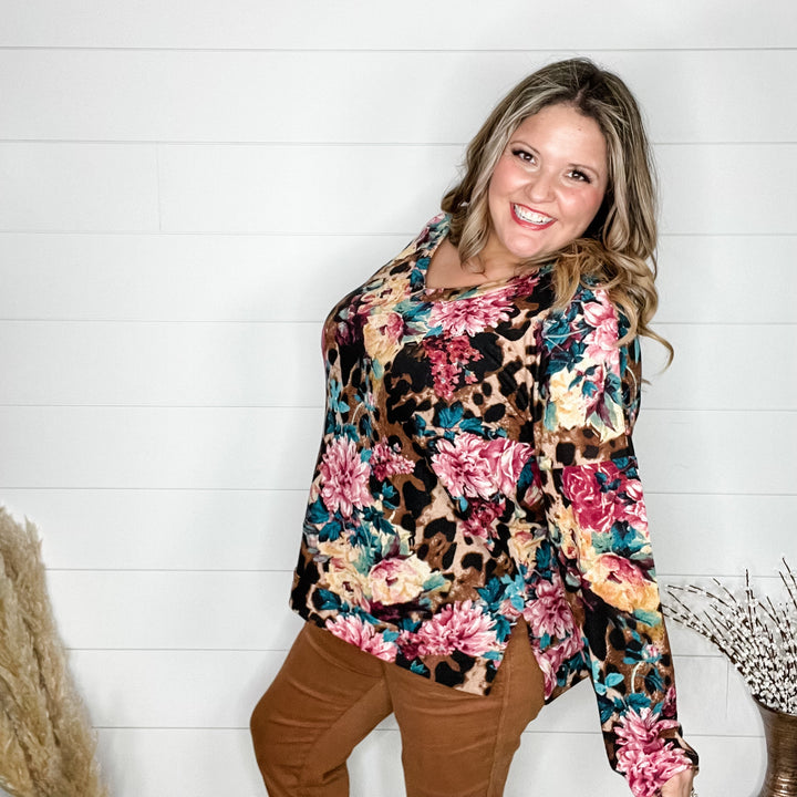 "Up To You" Ribbed Henley Style with Floral Long Sleeves (Charcoal)