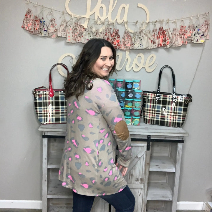 "Pink Professor" Animal Print Cardigan with Faux Suede Elbow Patches