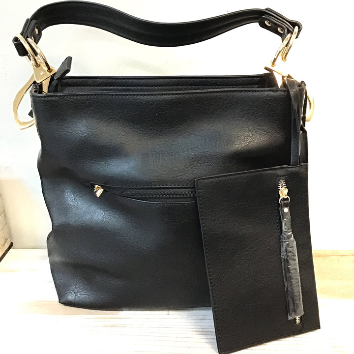 "Sandra" Solid Black Handbag with additional Floral Clutch
