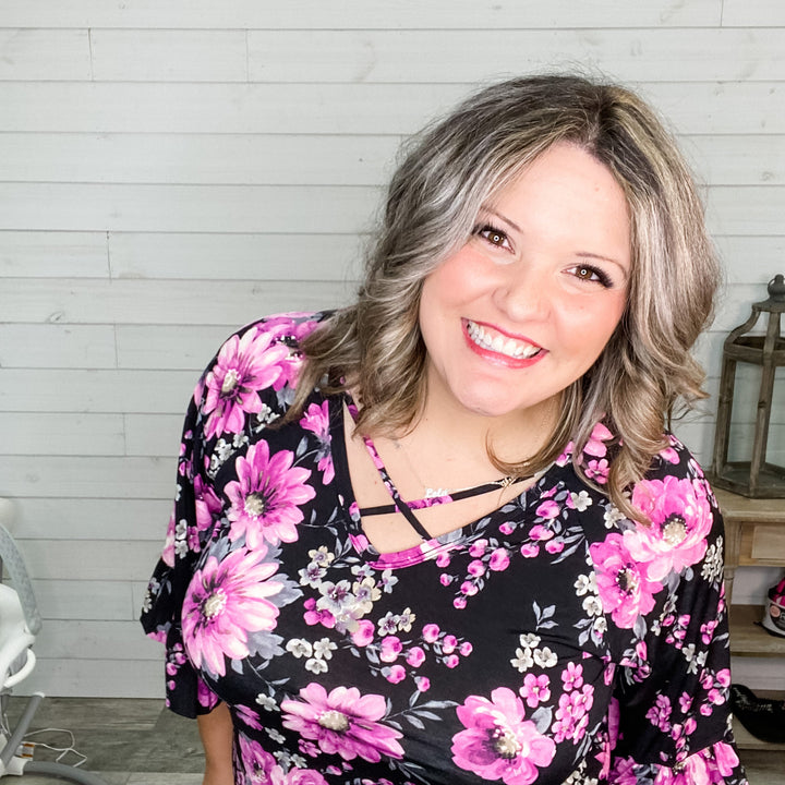 "Nellie" Floral 3/4 Ruffle Sleeve with Criss Cross Detail