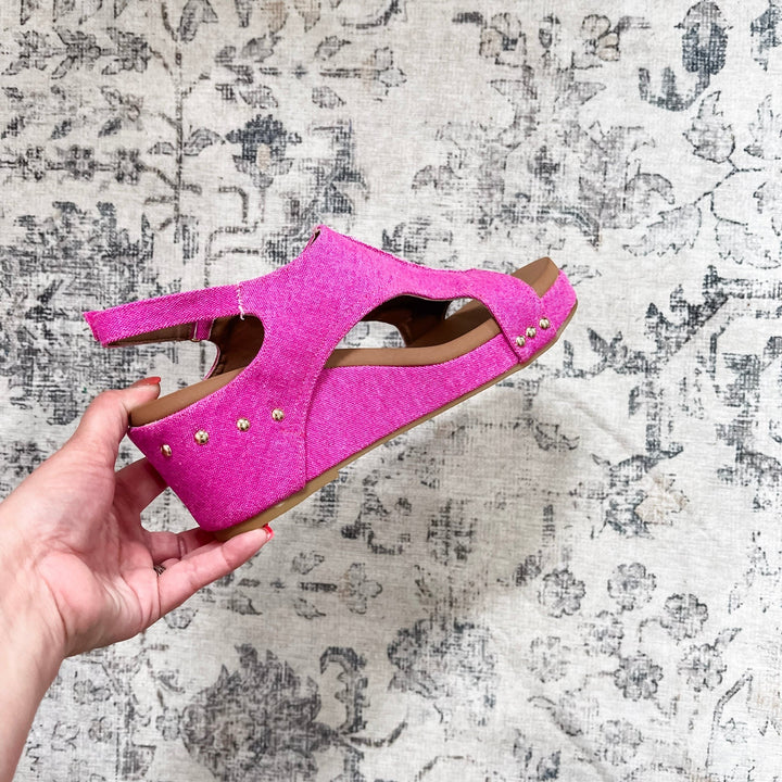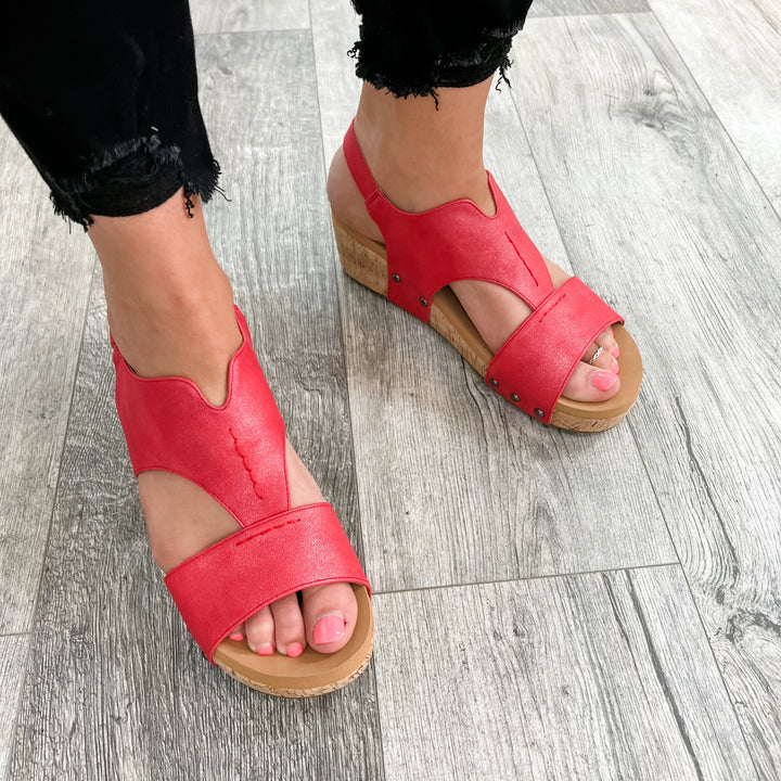 1.25 inch toe 3 inch heel"Carley" Wedge Sandal By Corkys (Cognac Smooth)