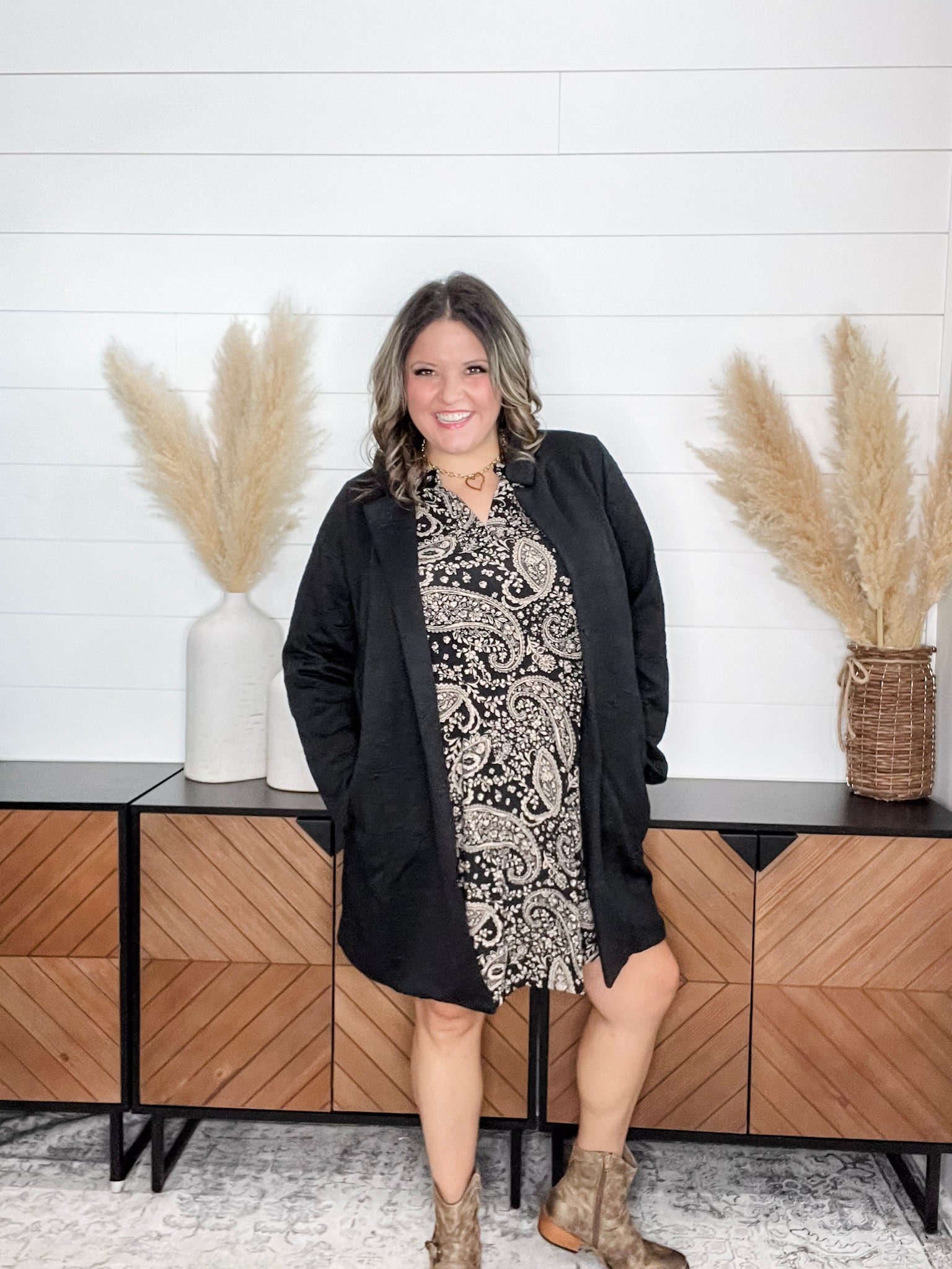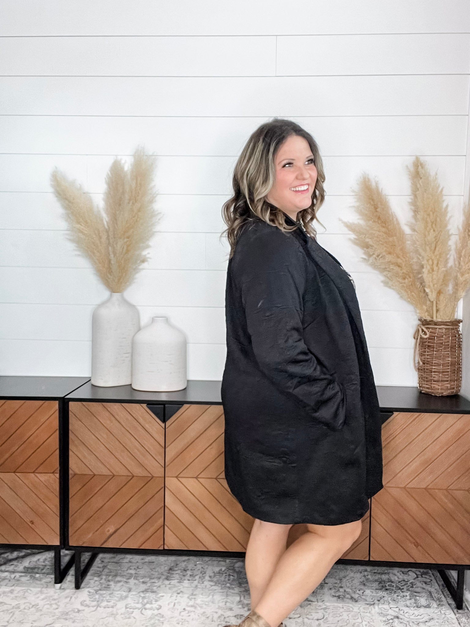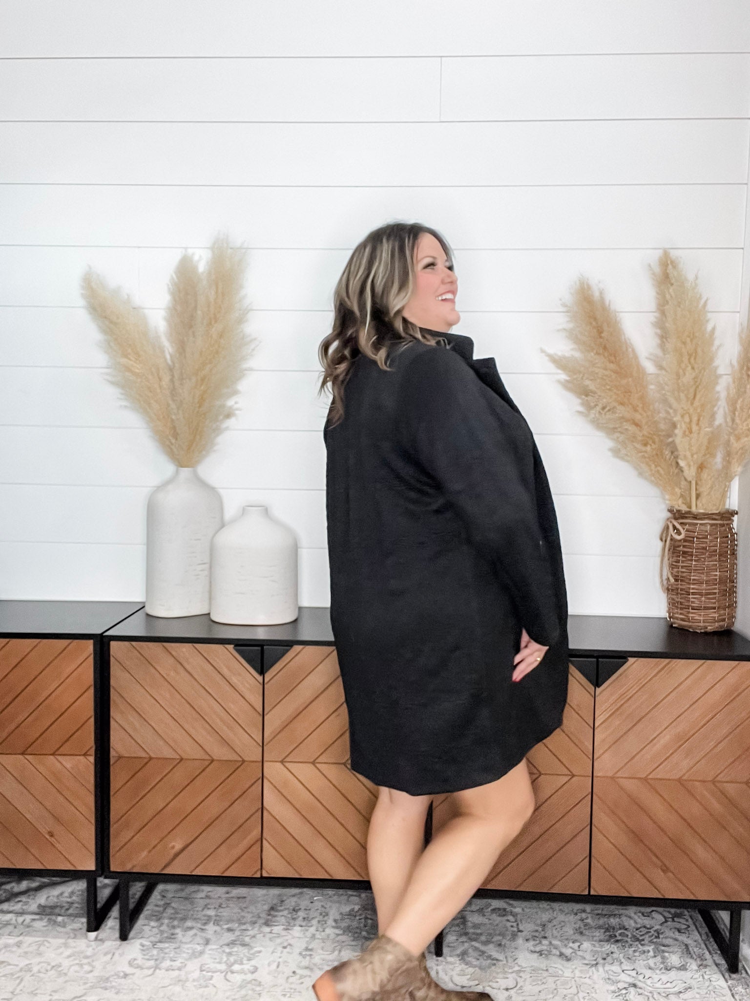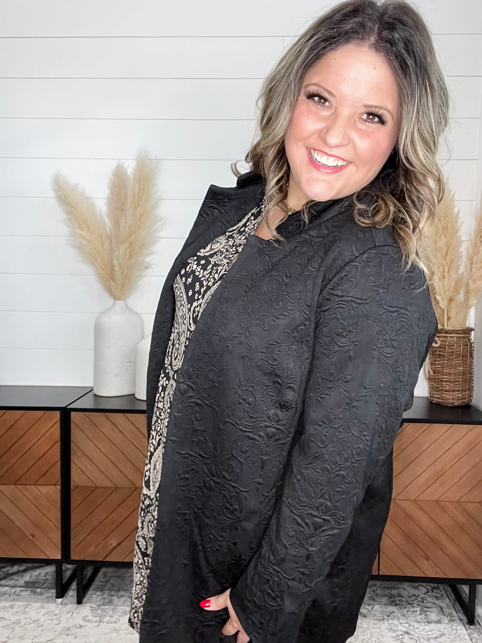 Step out in style with the "Amara" Jacquard Midi Coat in sleek black. This solid-colored beauty features a luxurious lined interior for cozy comfort and warmth. Practical pockets add a touch of ease, perfect for stashing your essentials on the go. Whether you’re dressing up or down, this coat brings playful sophistication to every outfit.