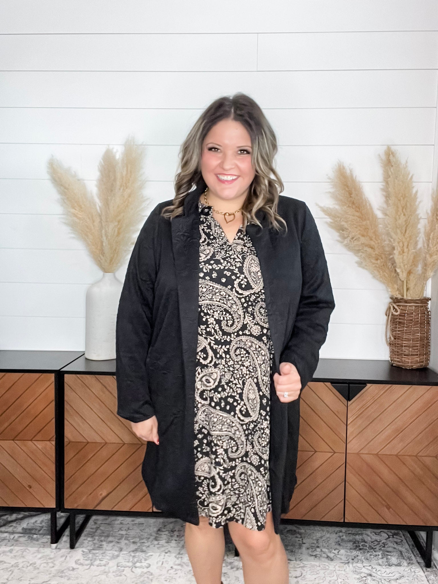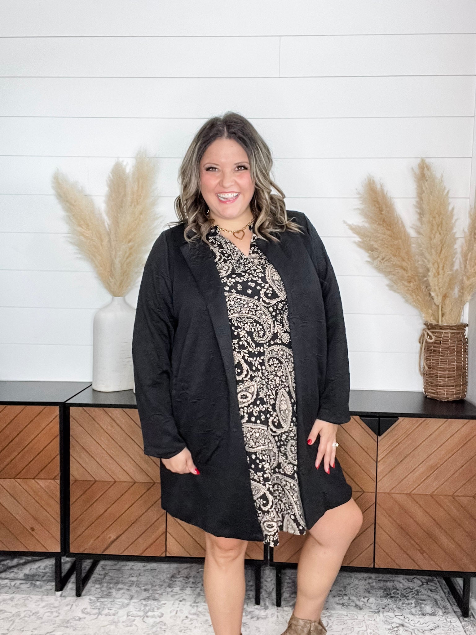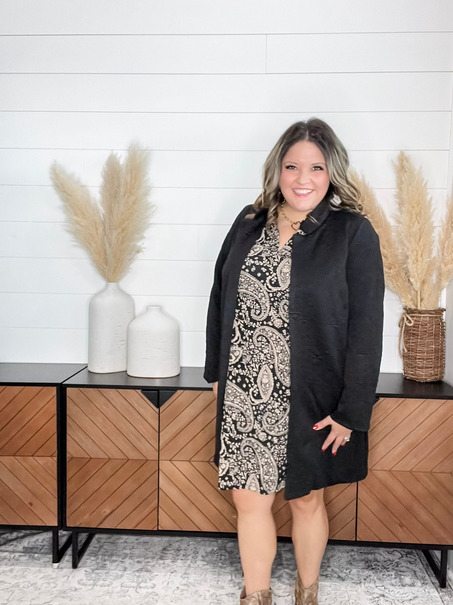 "Amara" Jacquard Midi Coat with Pockets (Black)