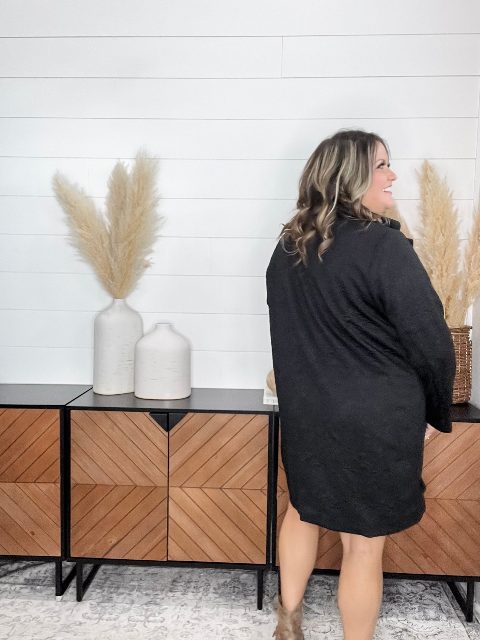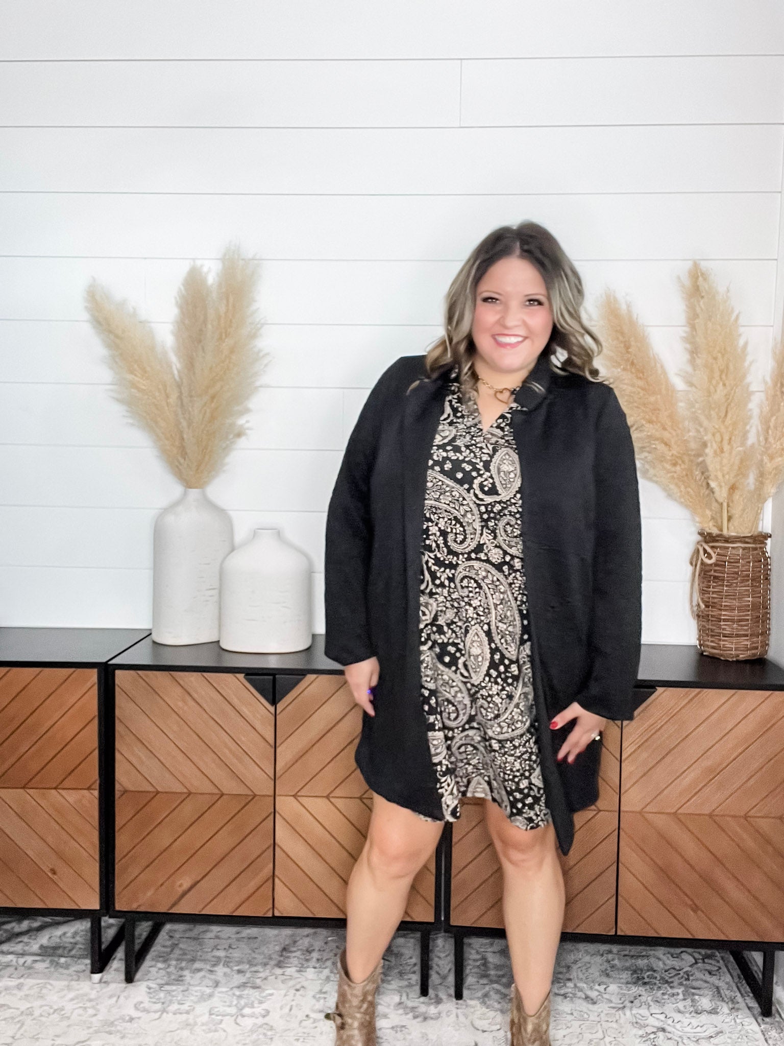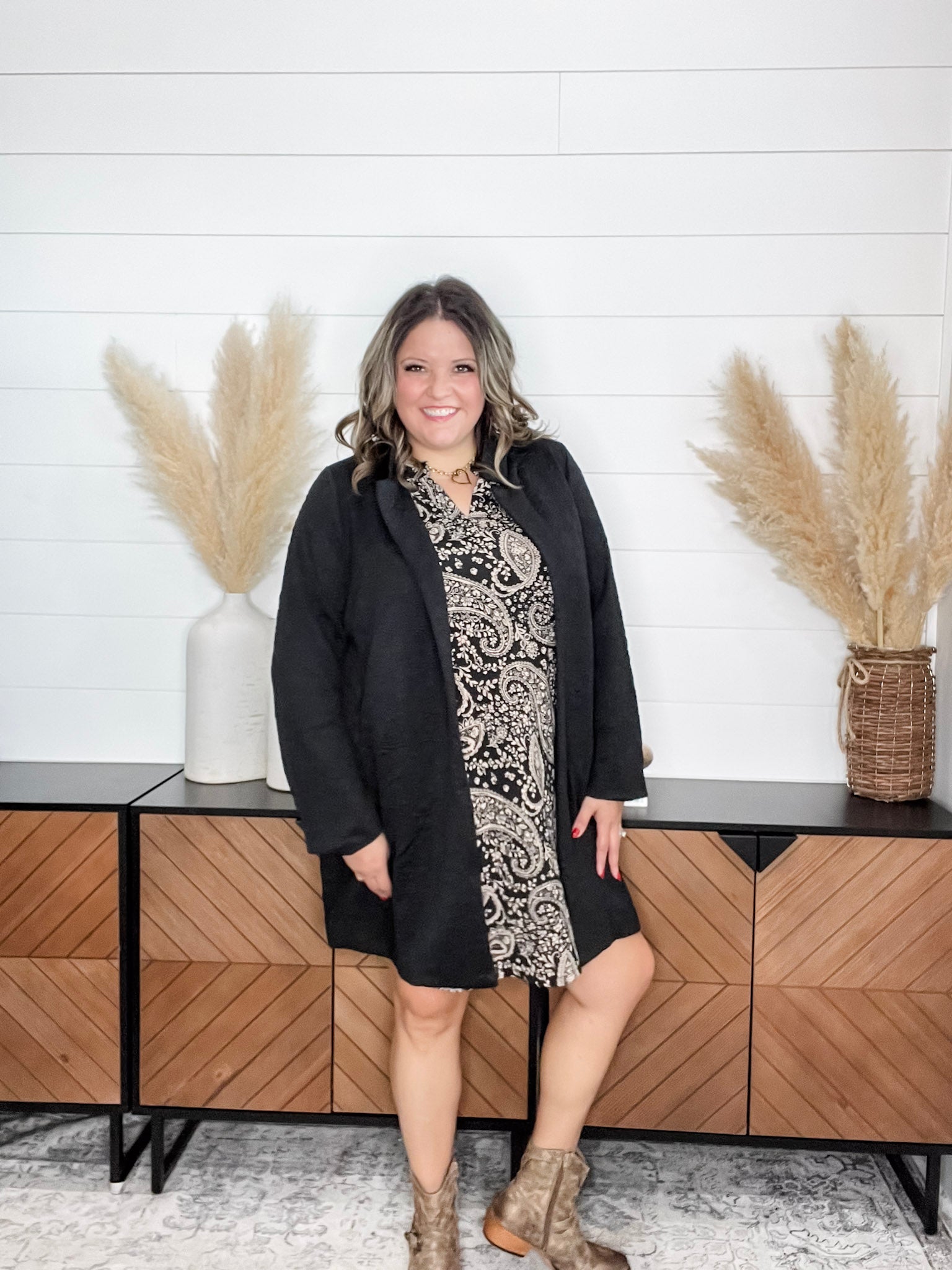 "Amara" Jacquard Midi Coat with Pockets (Black)