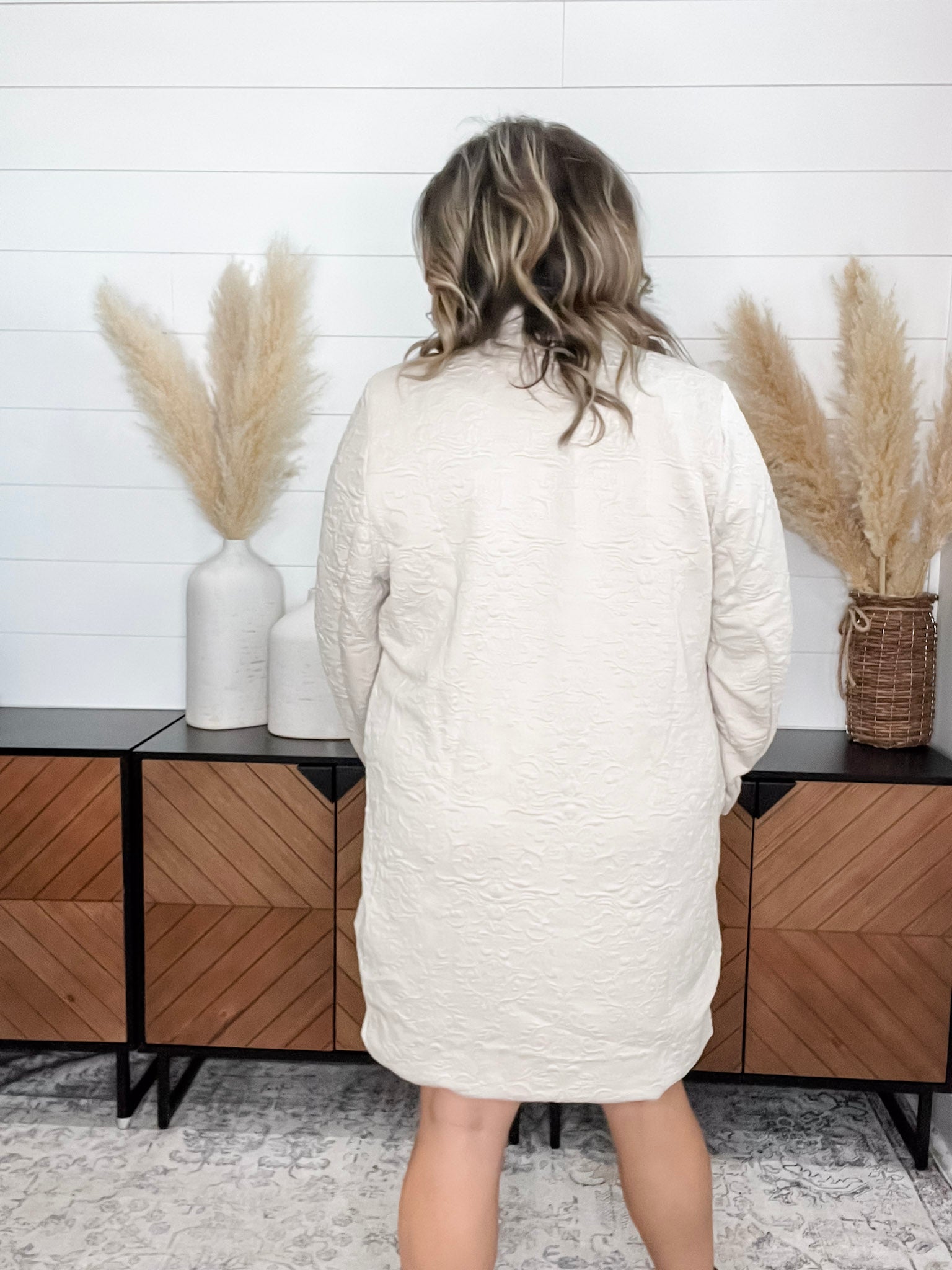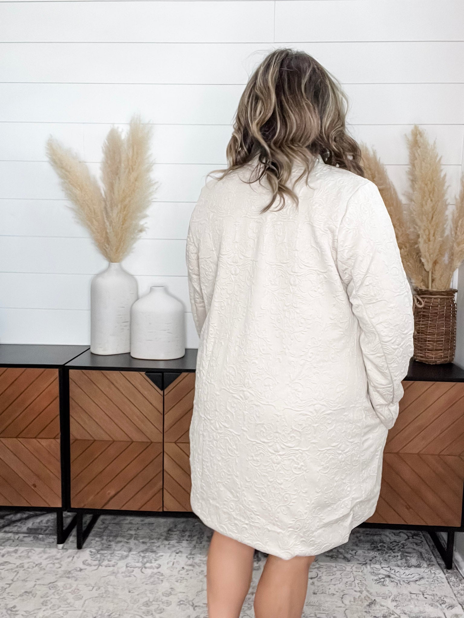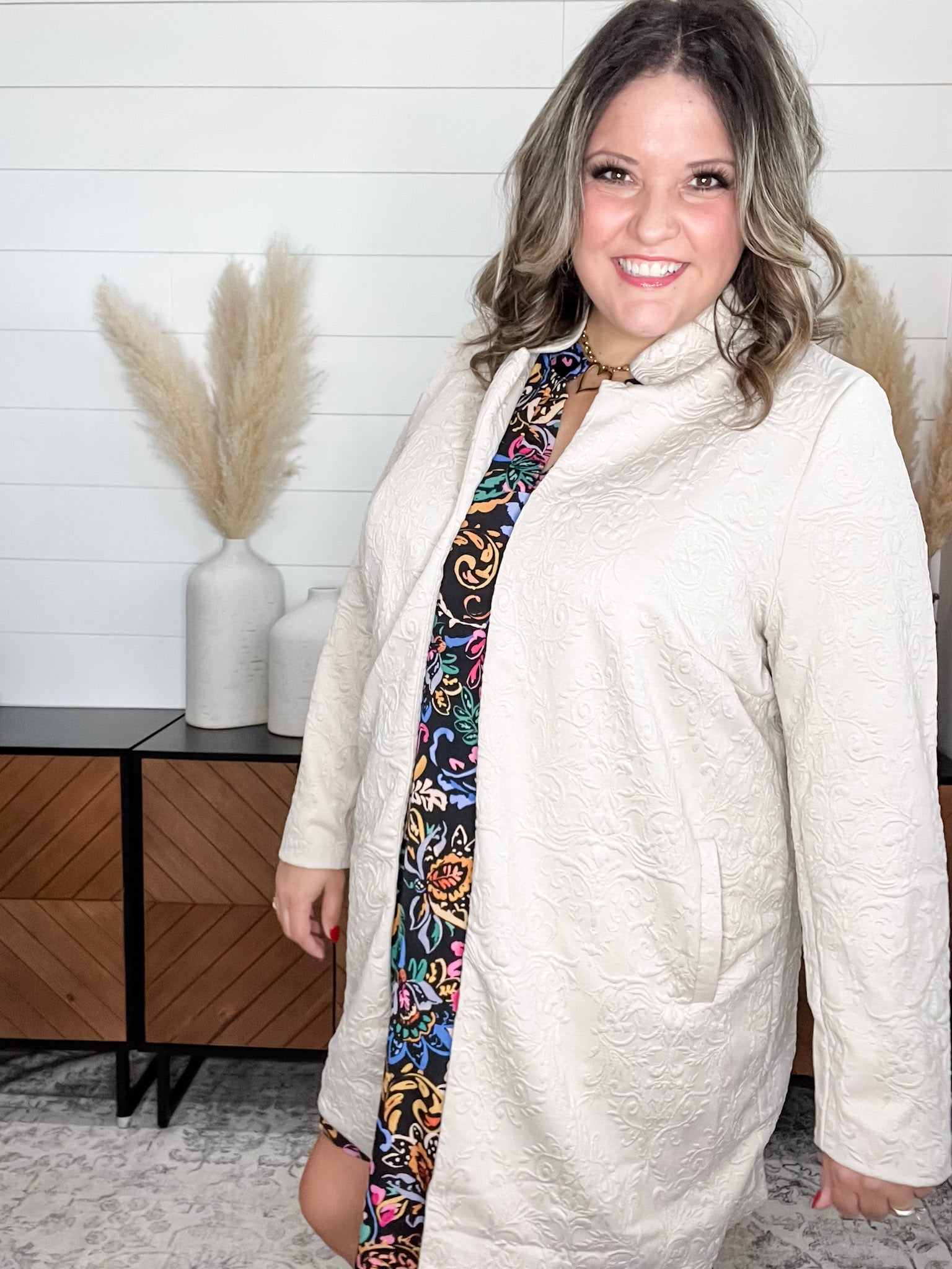 Step out in style with the "Amara" Jacquard Midi Coat in oatmeal. This solid-colored beauty features a luxurious lined interior for cozy comfort and warmth. Practical pockets add a touch of ease, perfect for stashing your essentials on the go. Whether you’re dressing up or down, this coat brings playful sophistication to every outfit.