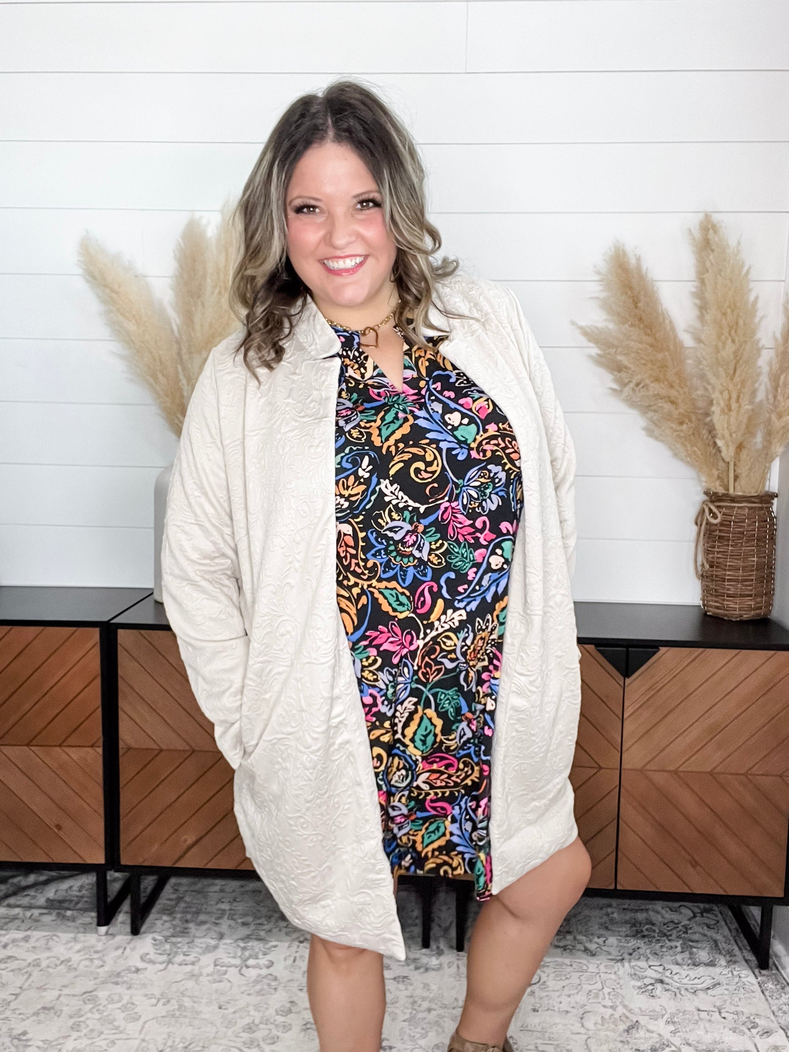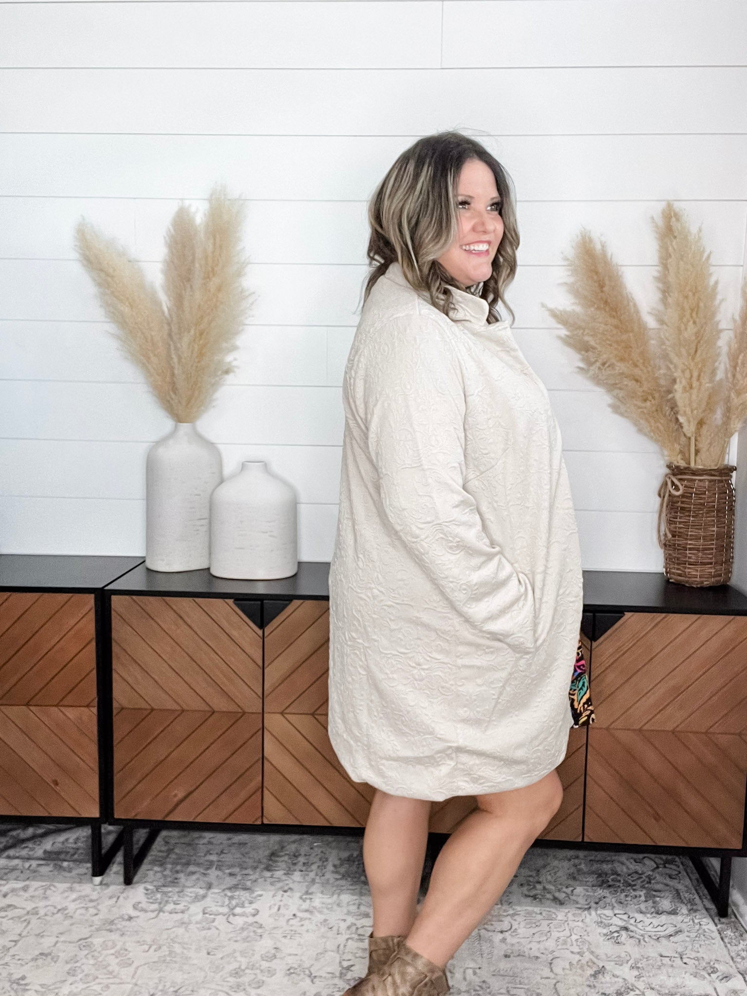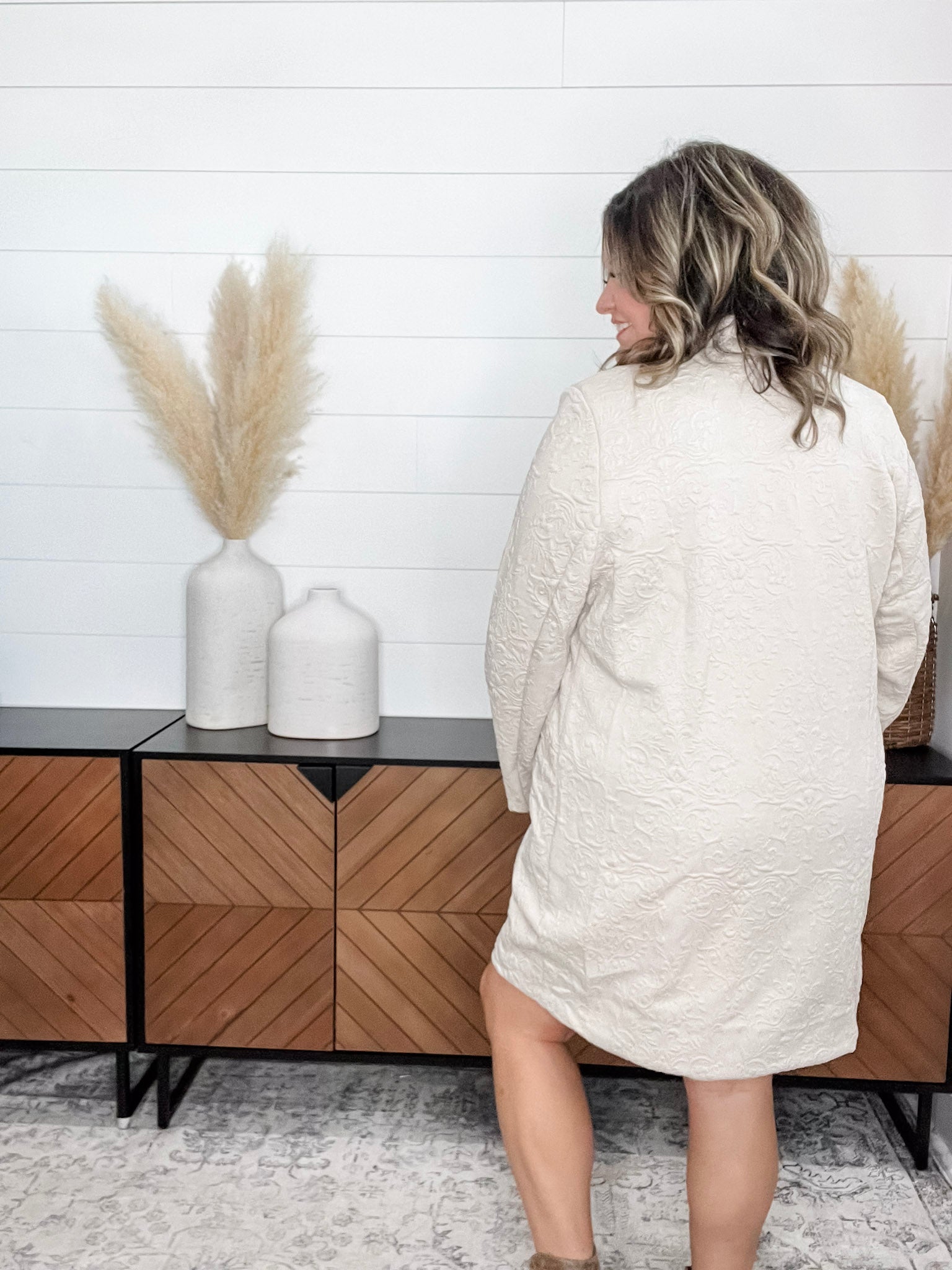 Step out in style with the "Amara" Jacquard Midi Coat in oatmeal. This solid-colored beauty features a luxurious lined interior for cozy comfort and warmth. Practical pockets add a touch of ease, perfect for stashing your essentials on the go. Whether you’re dressing up or down, this coat brings playful sophistication to every outfit.