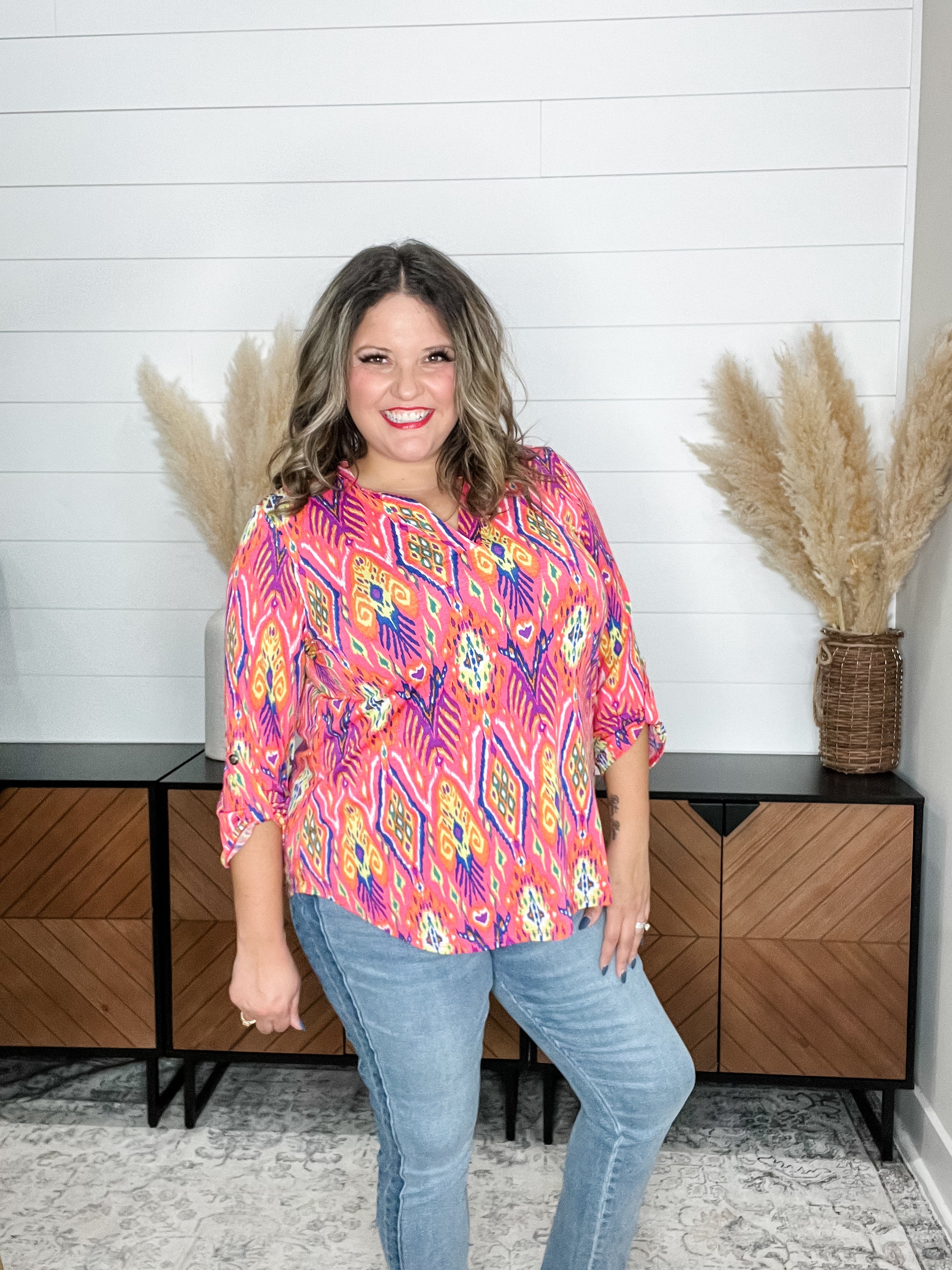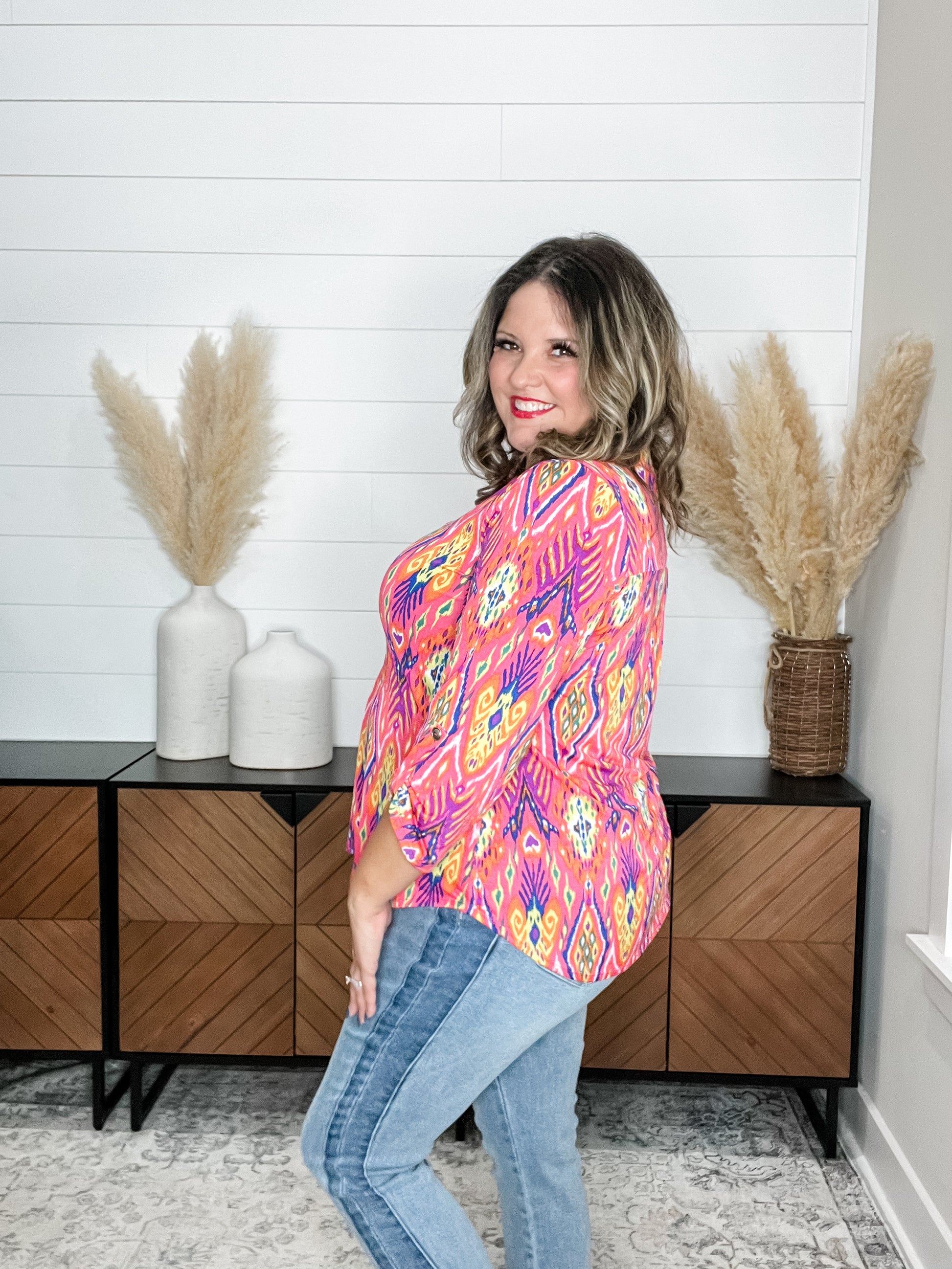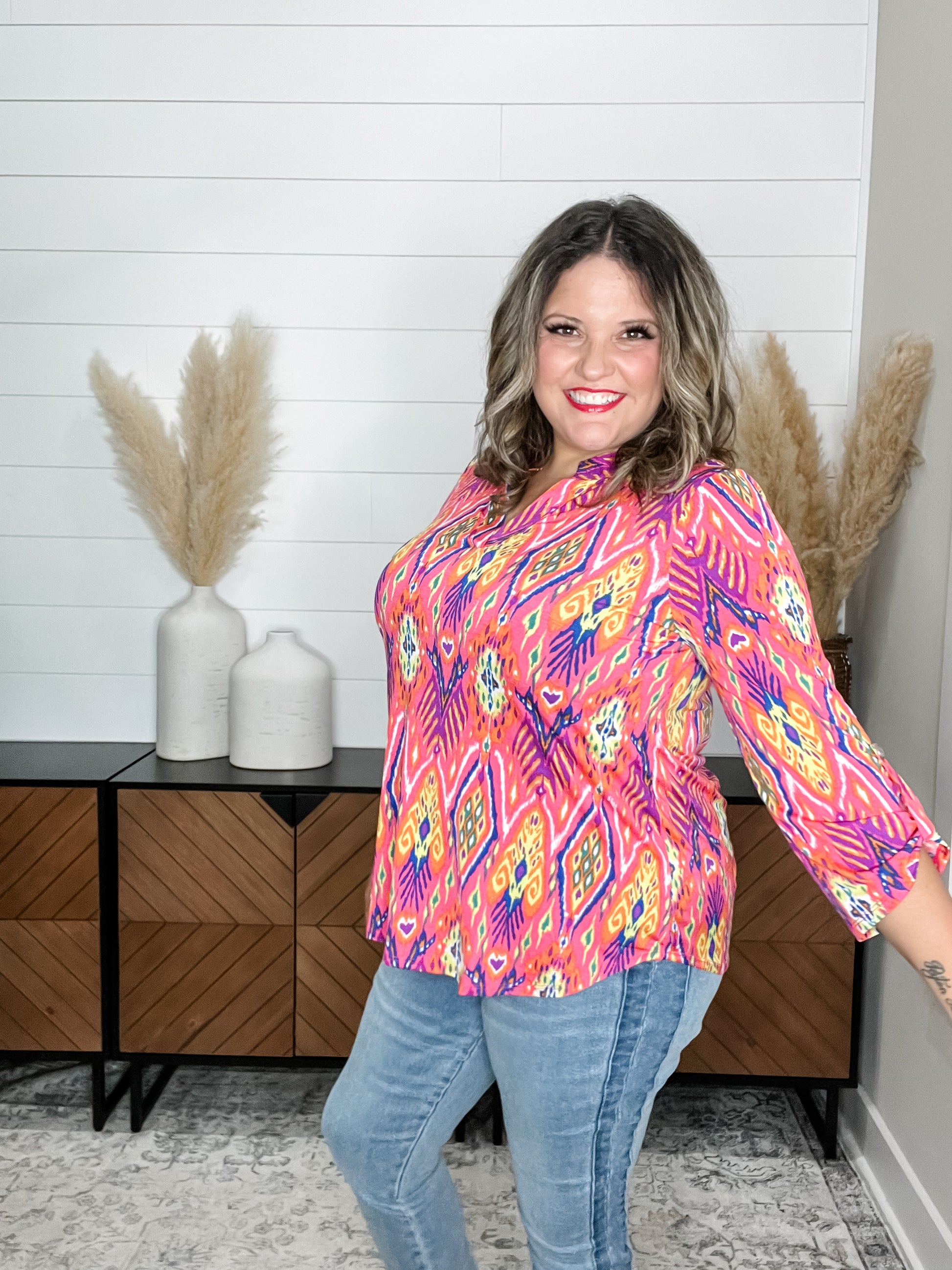 Get ready to turn heads in the "Amberjack" 3/4 Sleeve Split Neck! This playful top features slinky, stretchy fabric that hugs your curves just right—so be sure to size down one for the perfect fit. With bold colors that pop, it’s your new go-to for effortless style and fun vibes all day long.