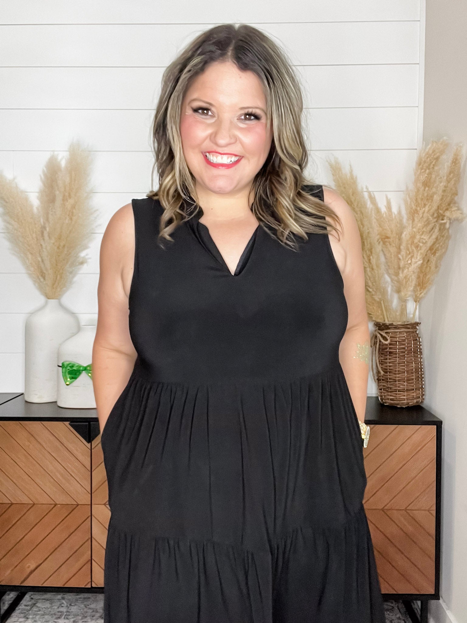 "Amos" Sleeveless Split Neck Tiered Dress (Black)
