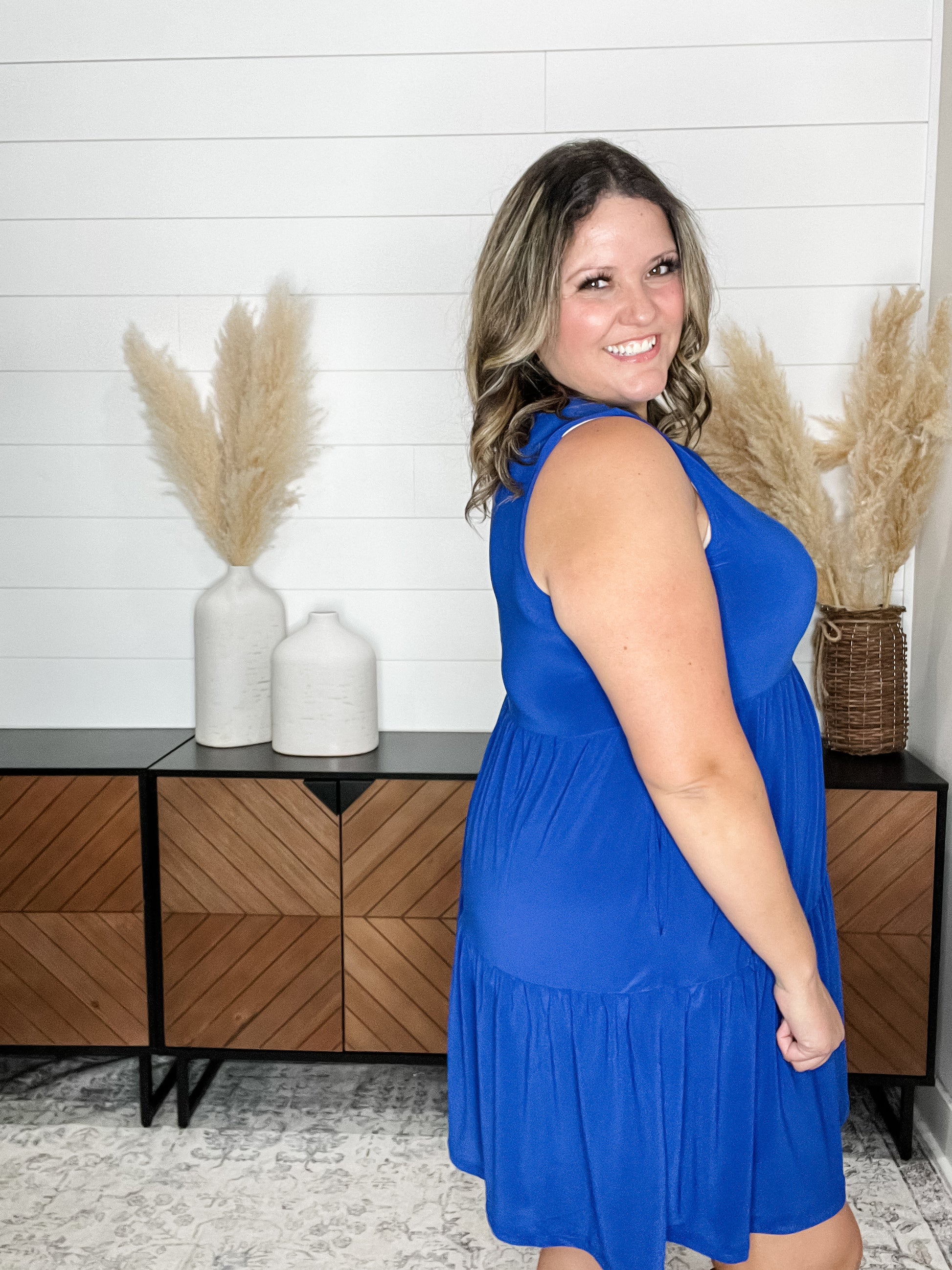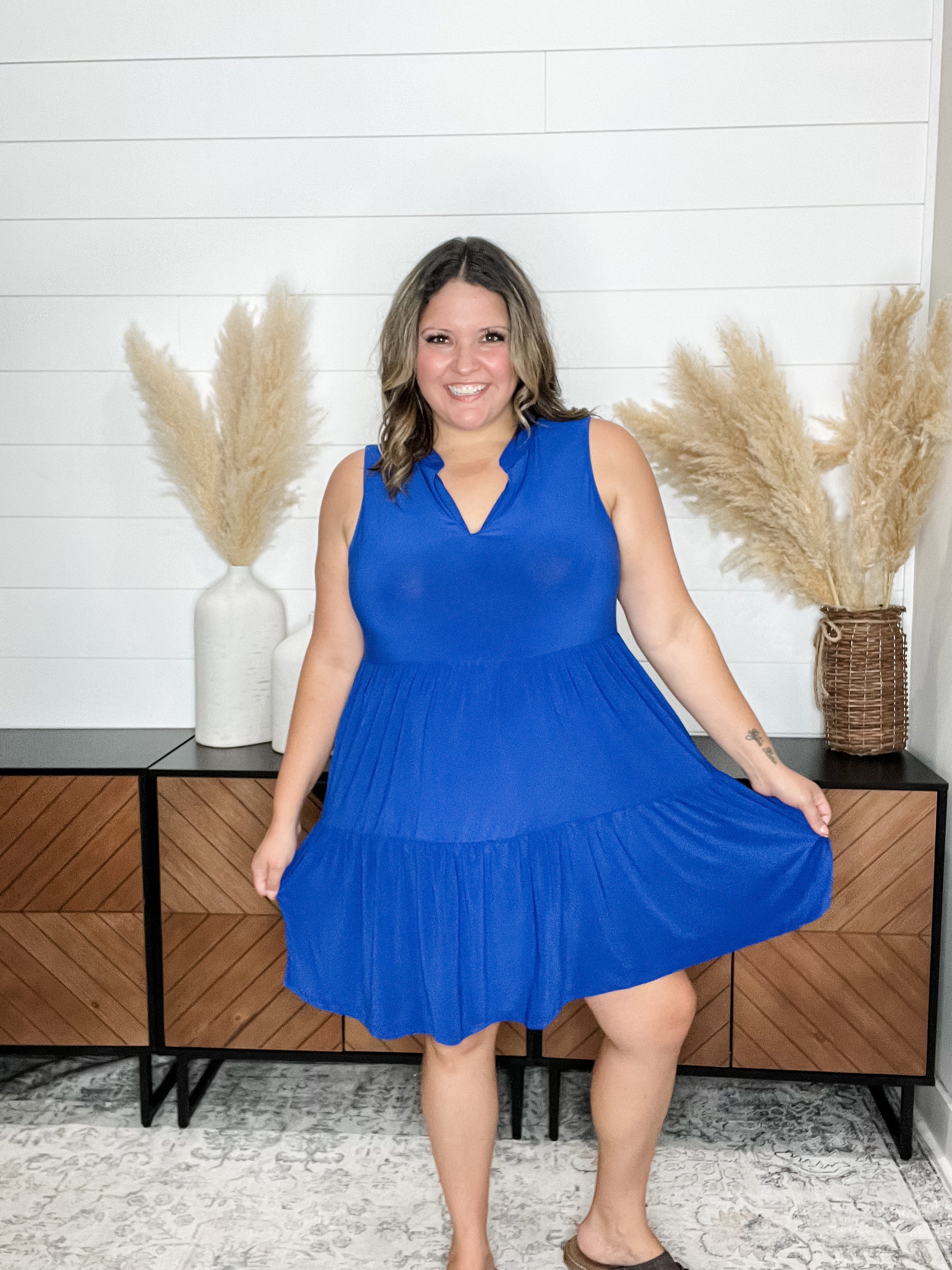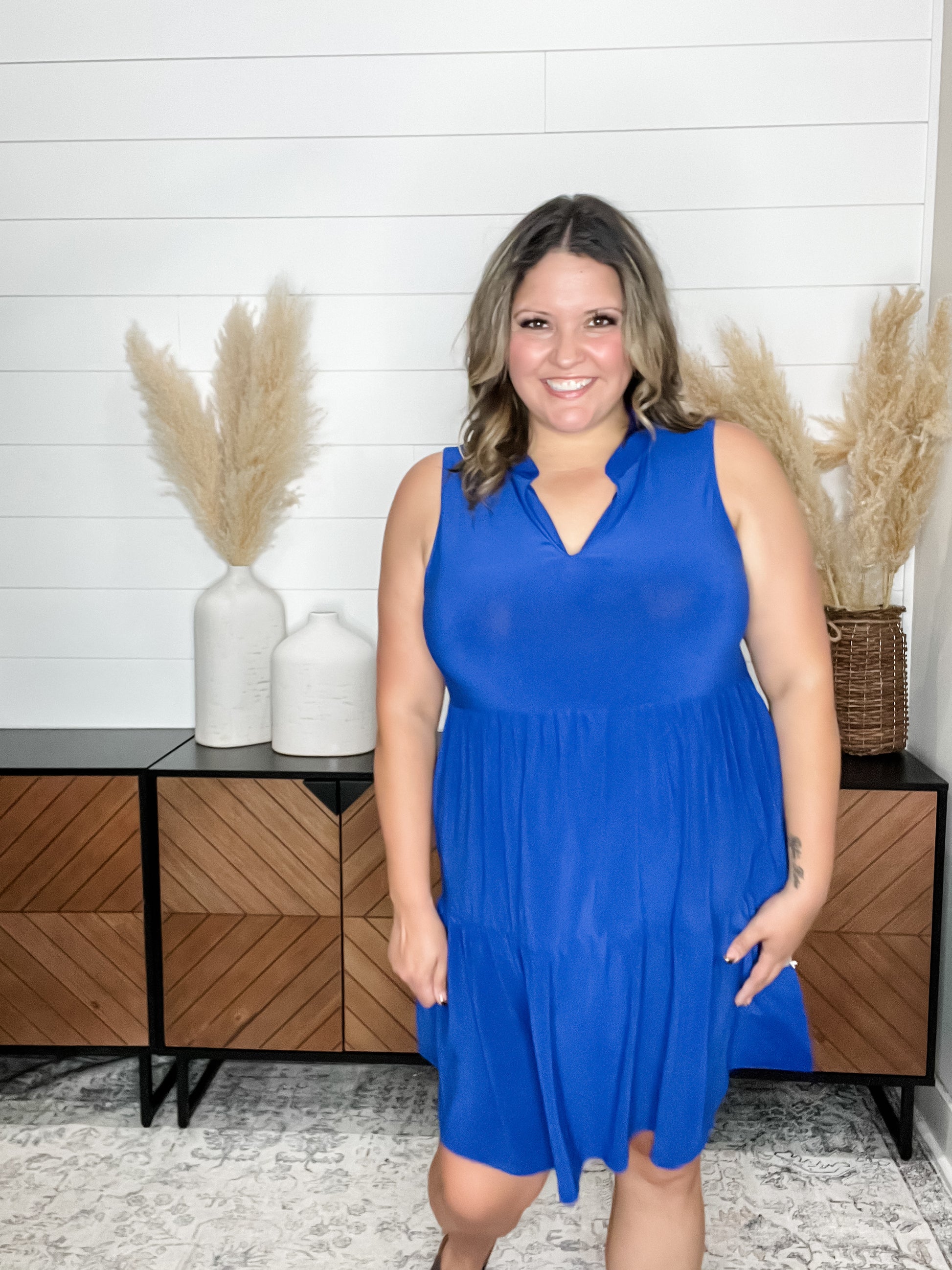 "Amos" Sleeveless Split Neck Tiered Dress (Royal Blue)