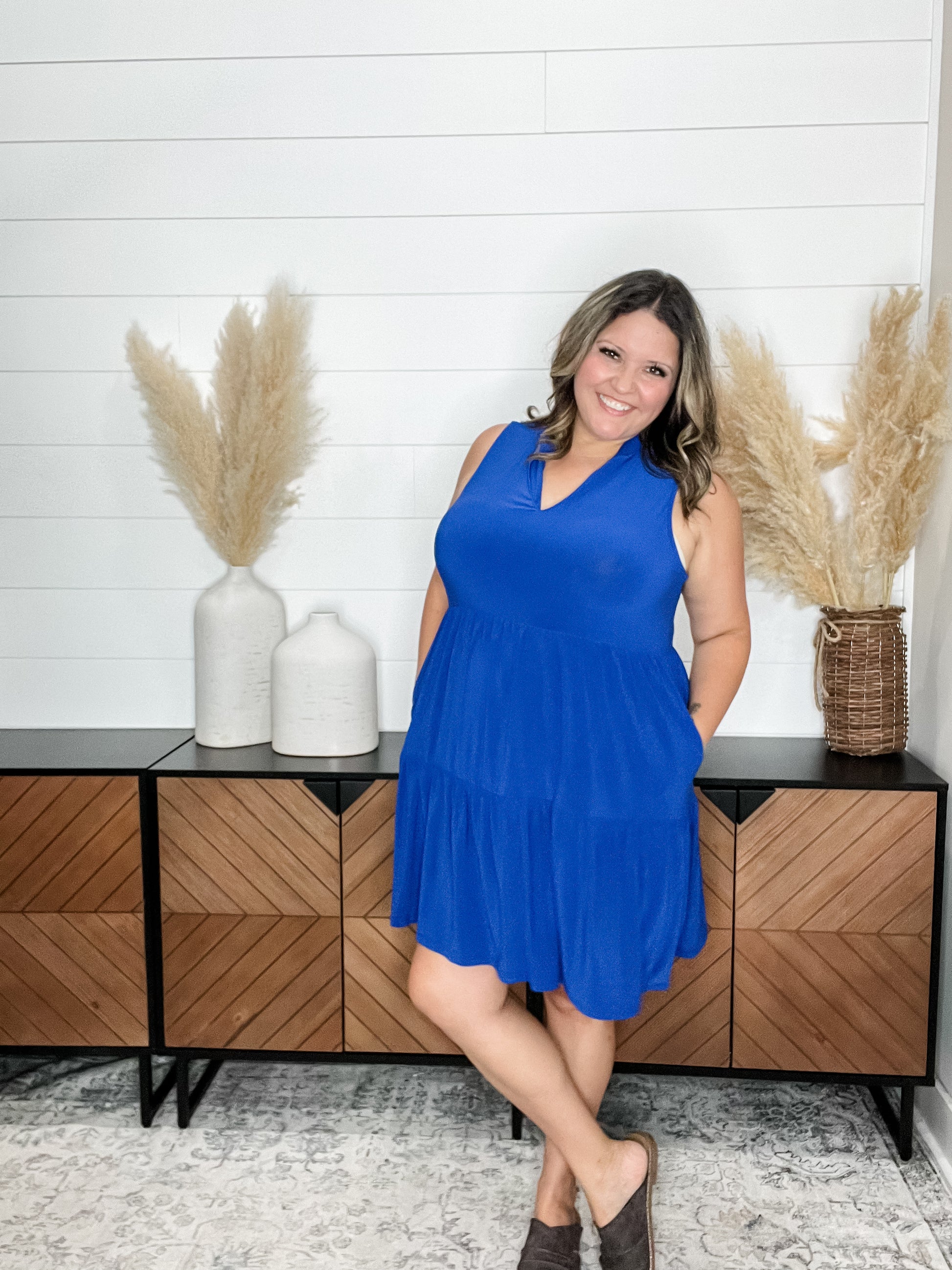 The "Amos" dress by Dear Scarlett effortlessly combines style and comfort. The slinky stretchy fabric allows for a flattering fit, while remaining wrinkle-free for all-day wear. The tiered design adds a touch of elegance, and the pockets provide convenience. Perfect for those with a larger bust, this solid royal blue dress is a must-have in any wardrobe.