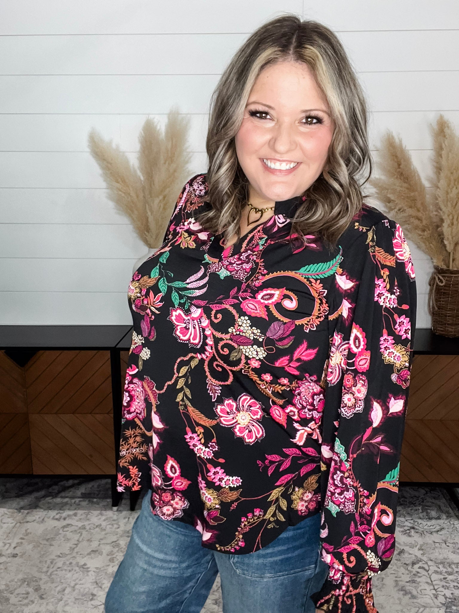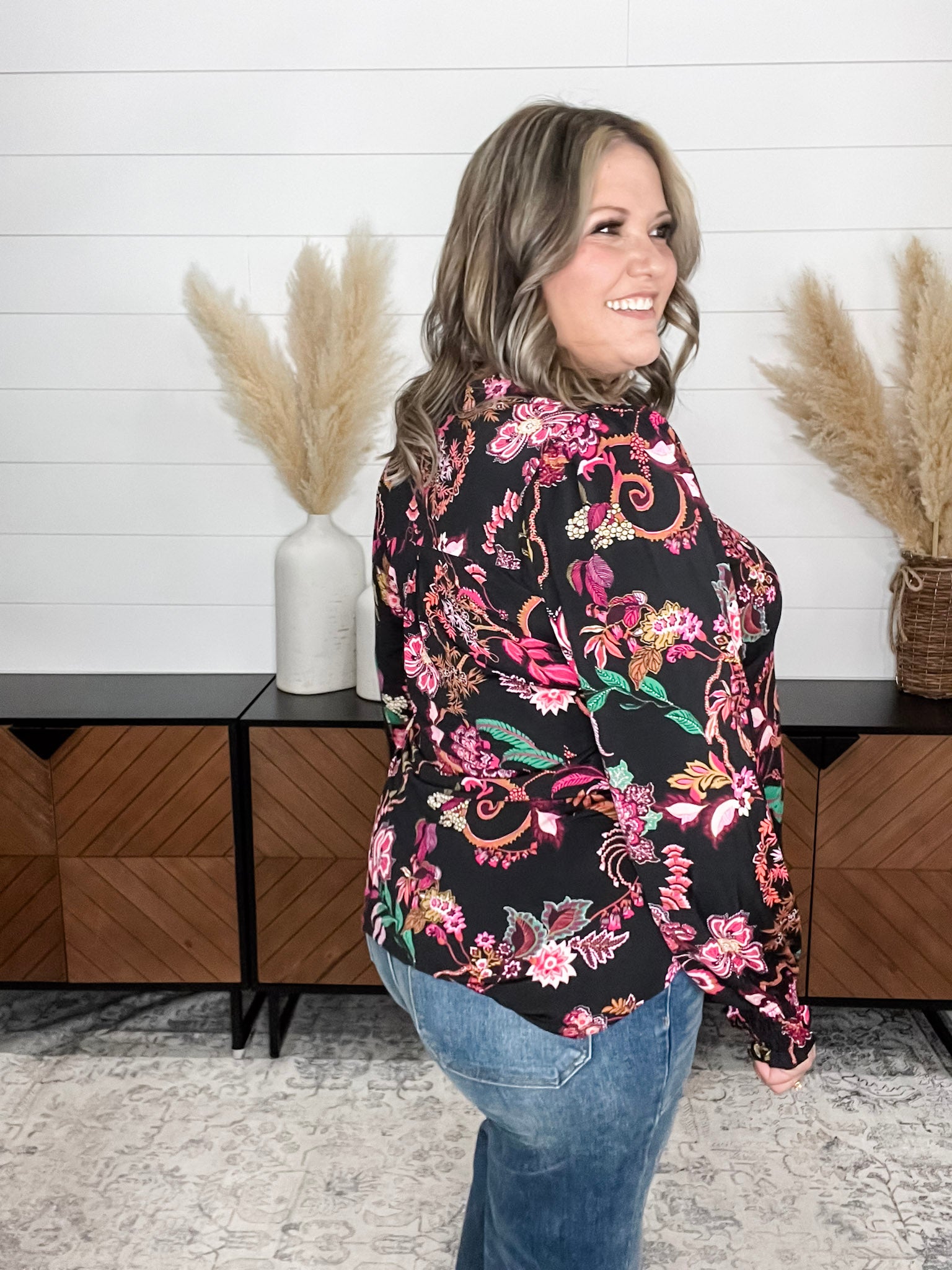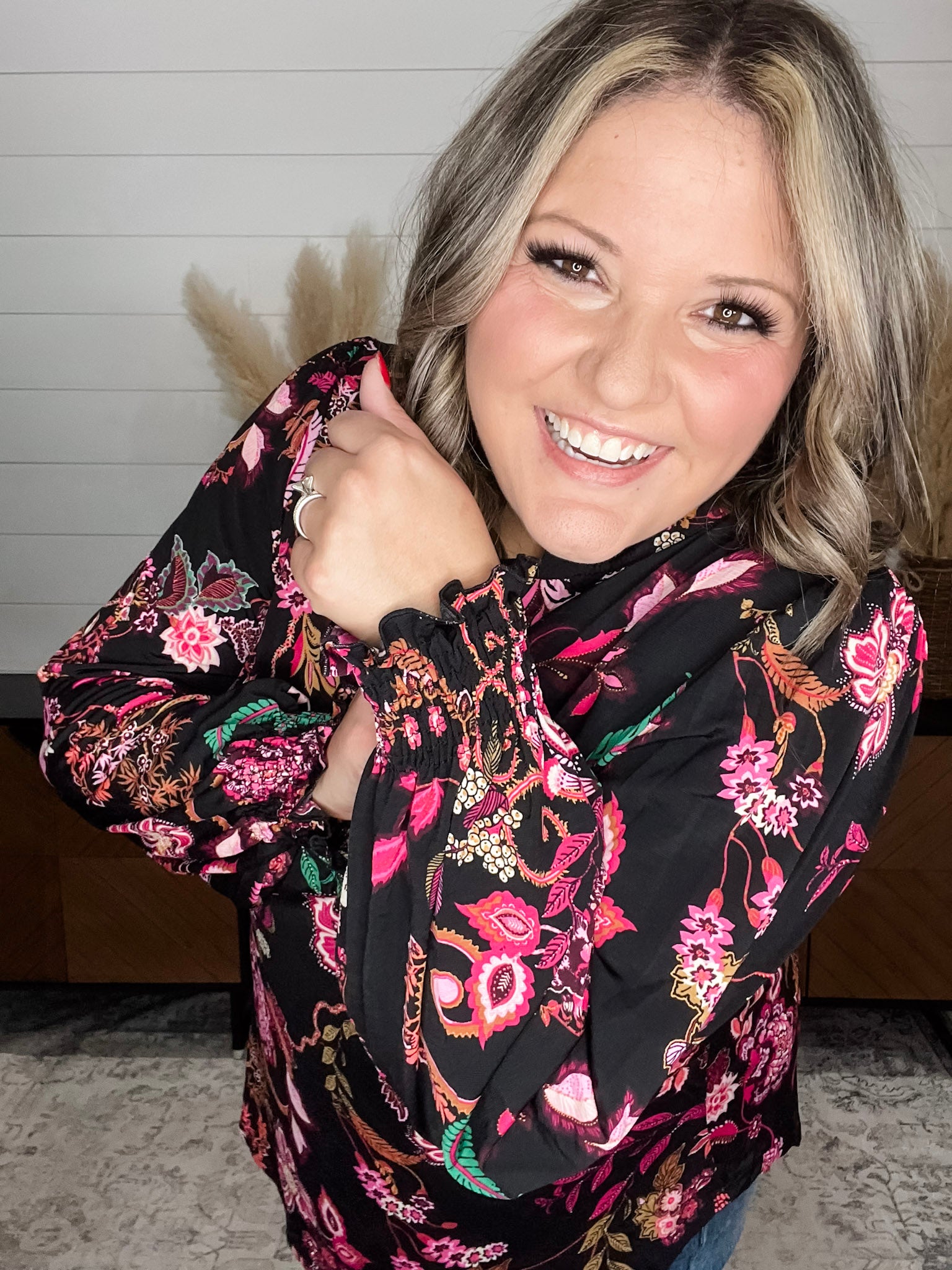 This playful "Anniston" smocked wrist long sleeve top features a slinky, stretchy fit—perfect for sizing down one for a cozy yet flattering silhouette. Its black base is adorned with vibrant floral and foliage patterns in rich jewel tones, adding a splash of color and charm to your look. The split neck detail brings a flirty touch, making it a fun choice for day-to-night wear.