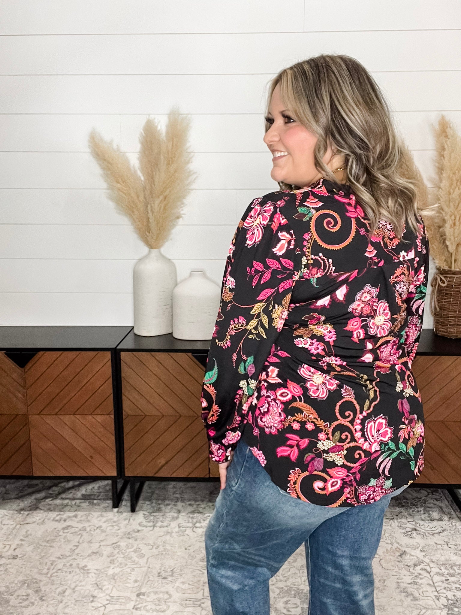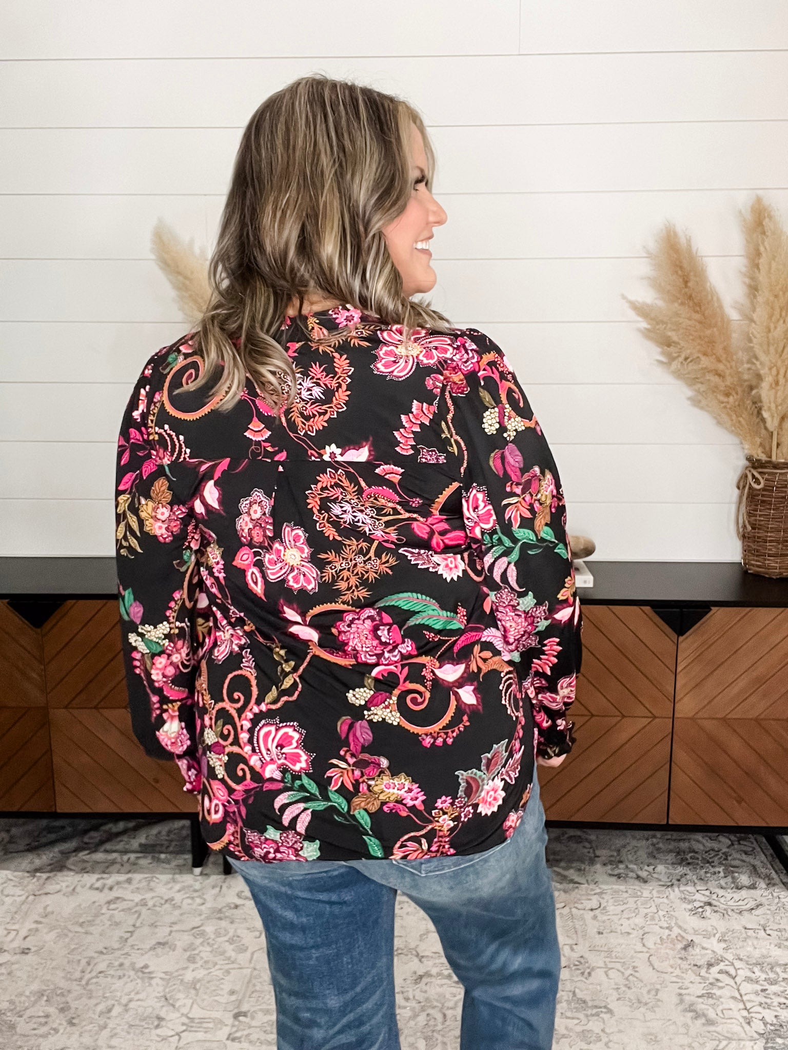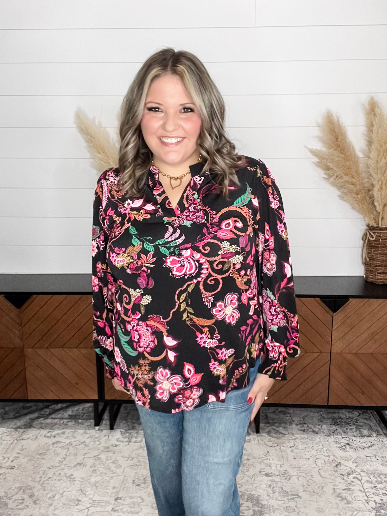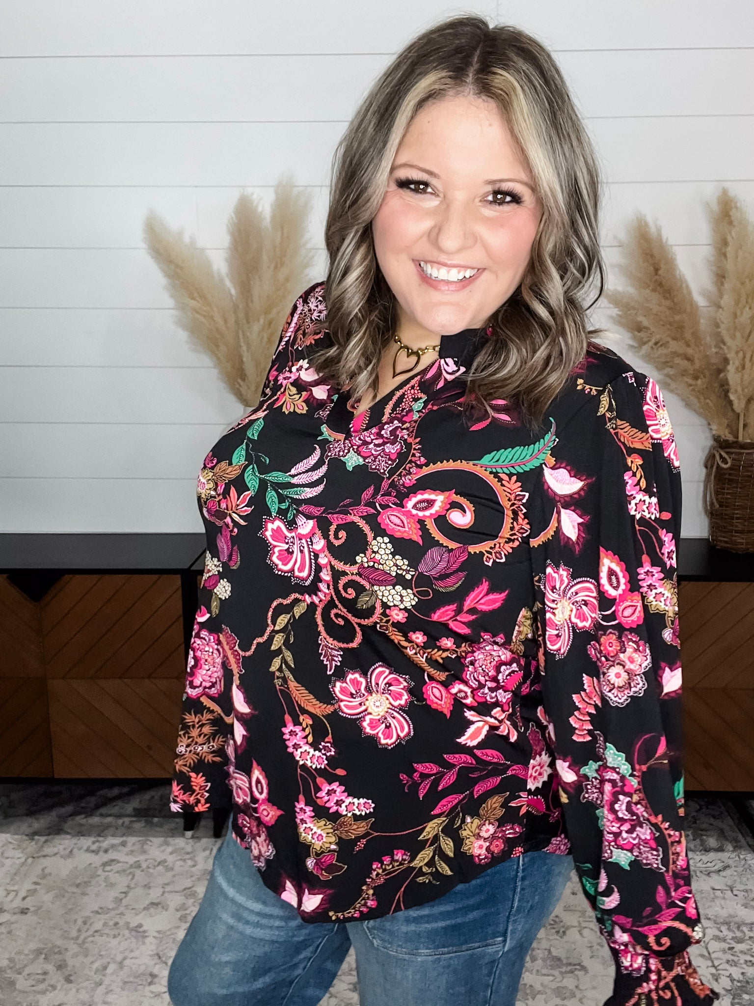This playful "Anniston" smocked wrist long sleeve top features a slinky, stretchy fit—perfect for sizing down one for a cozy yet flattering silhouette. Its black base is adorned with vibrant floral and foliage patterns in rich jewel tones, adding a splash of color and charm to your look. The split neck detail brings a flirty touch, making it a fun choice for day-to-night wear.