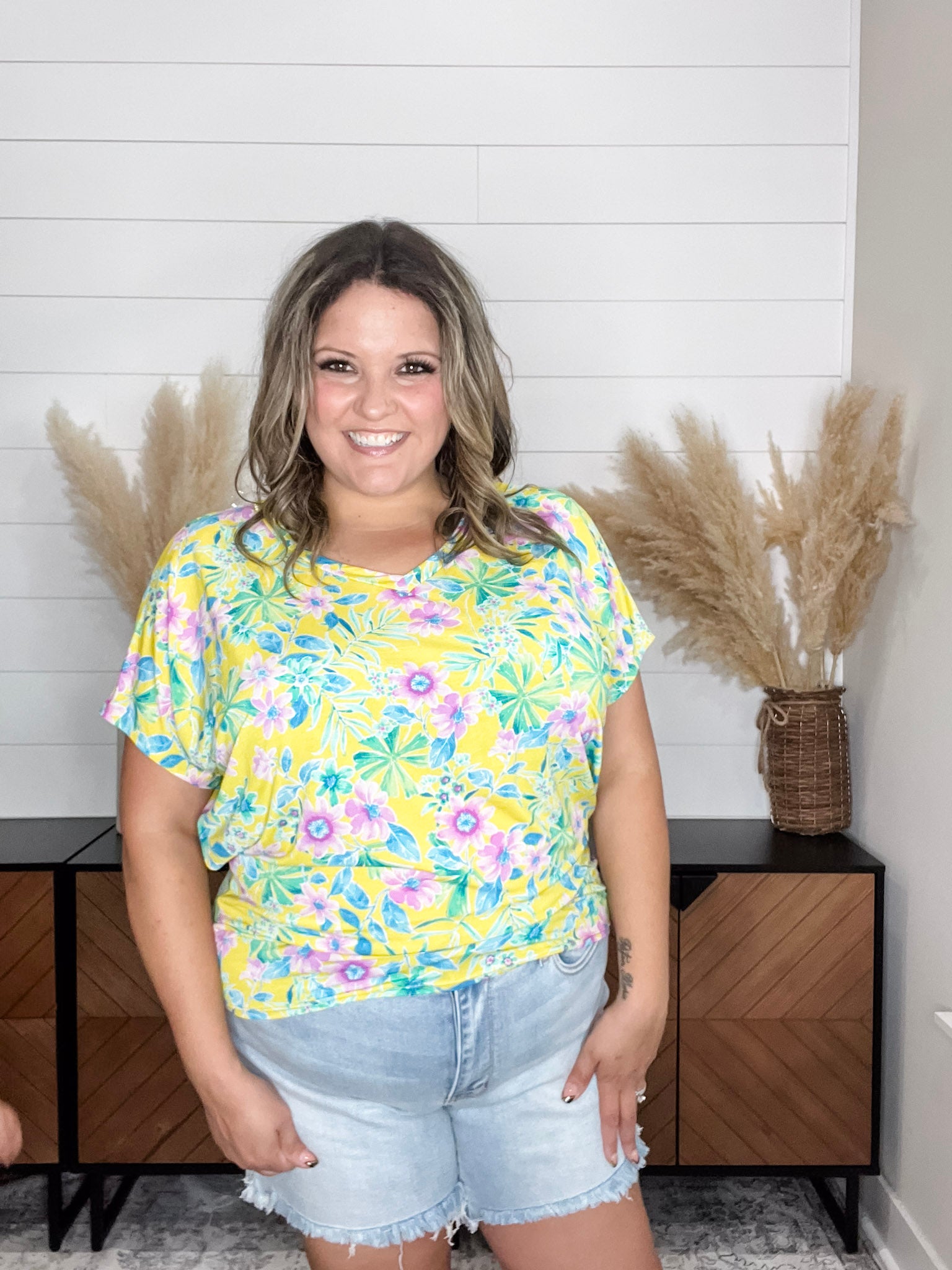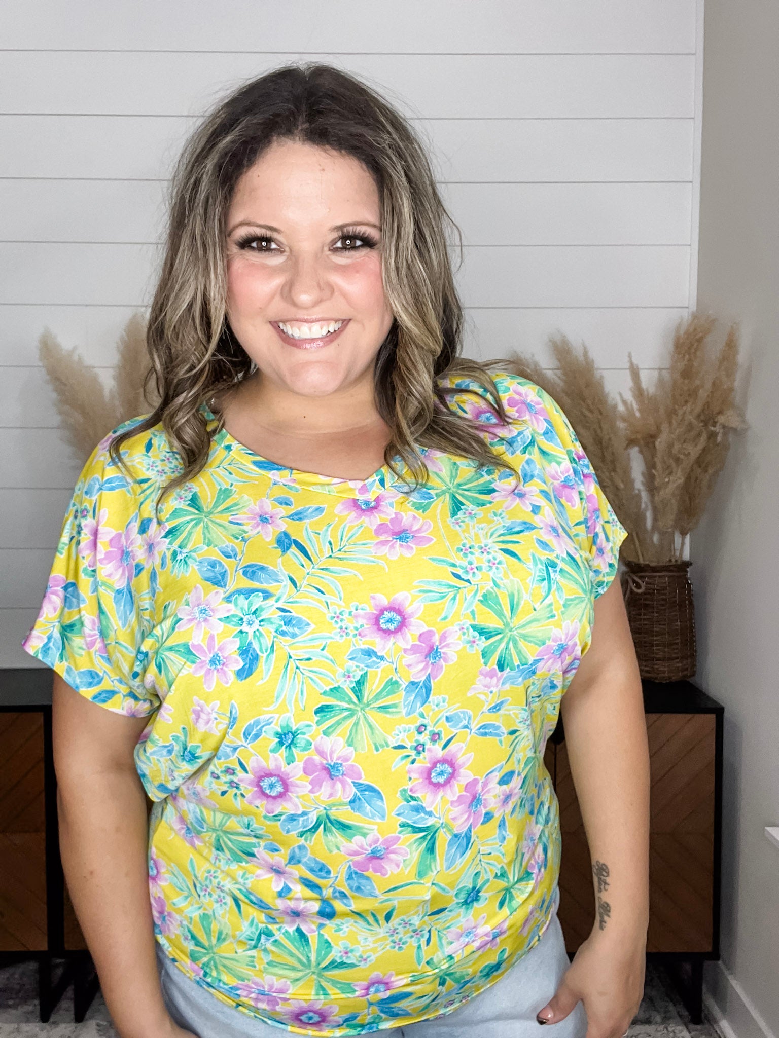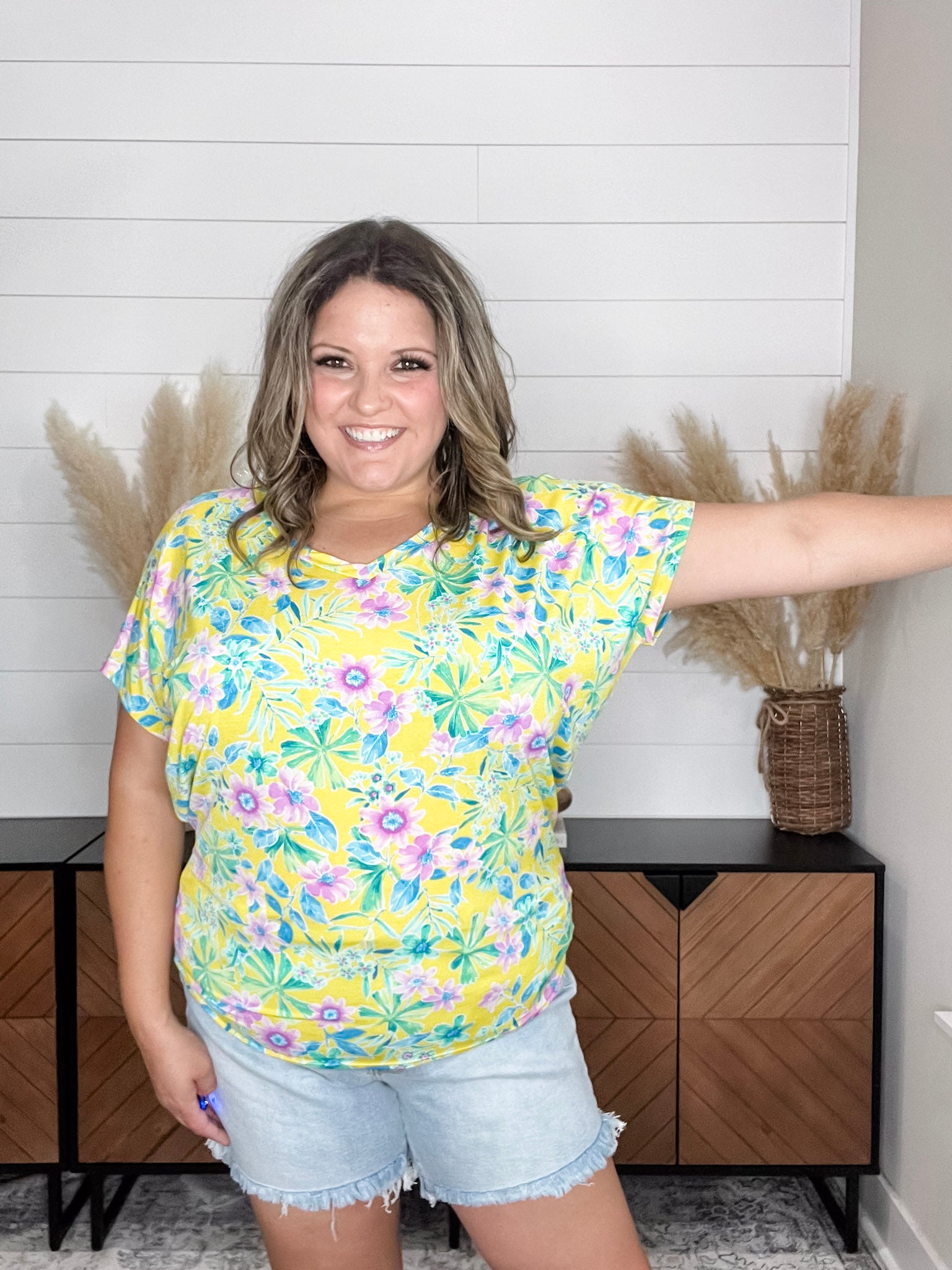 The "Another Option" V-Neck Dolman offers a slinky and stretchy fit that is both comfortable and flattering. With a roomy underarm area and tapered tummy, this floral top is perfect for any occasion. Available in yellow, it is a great addition to any wardrobe.