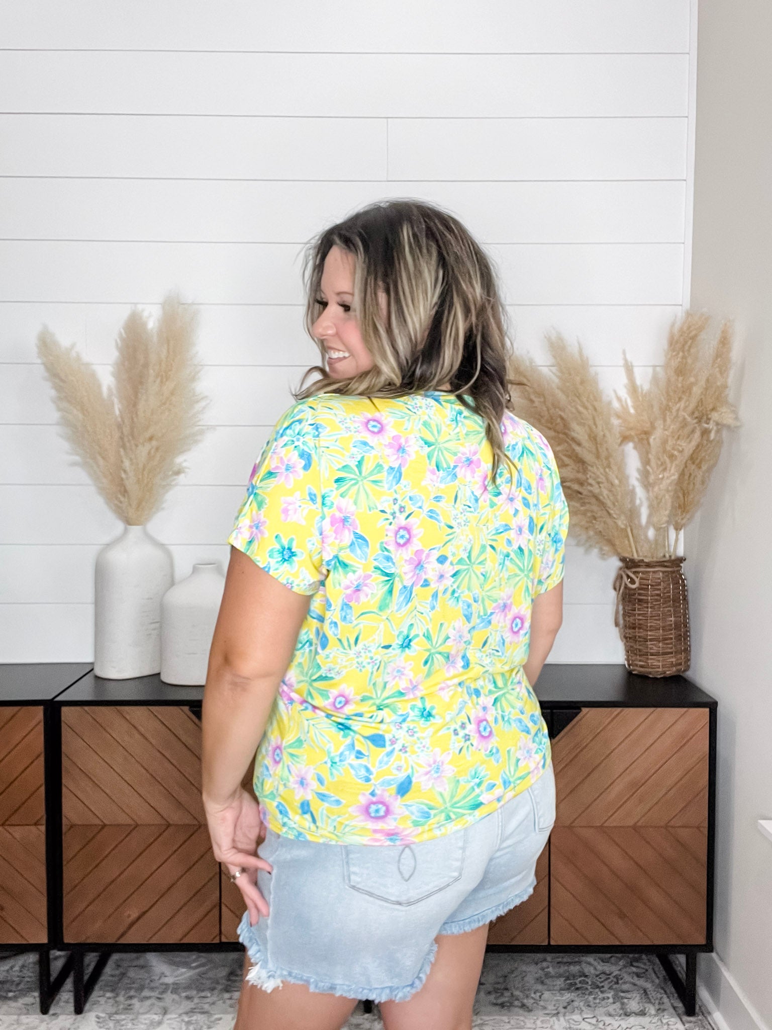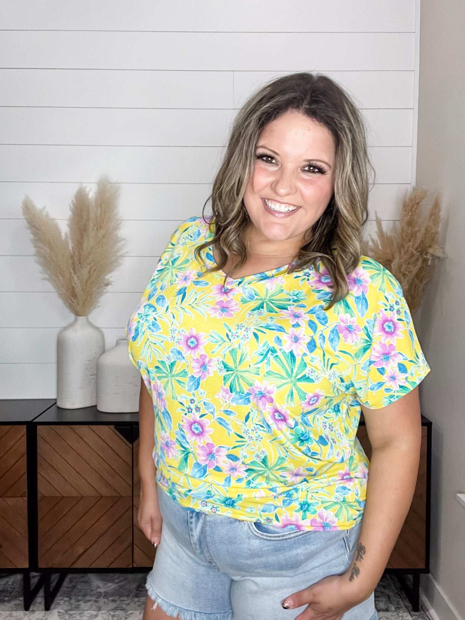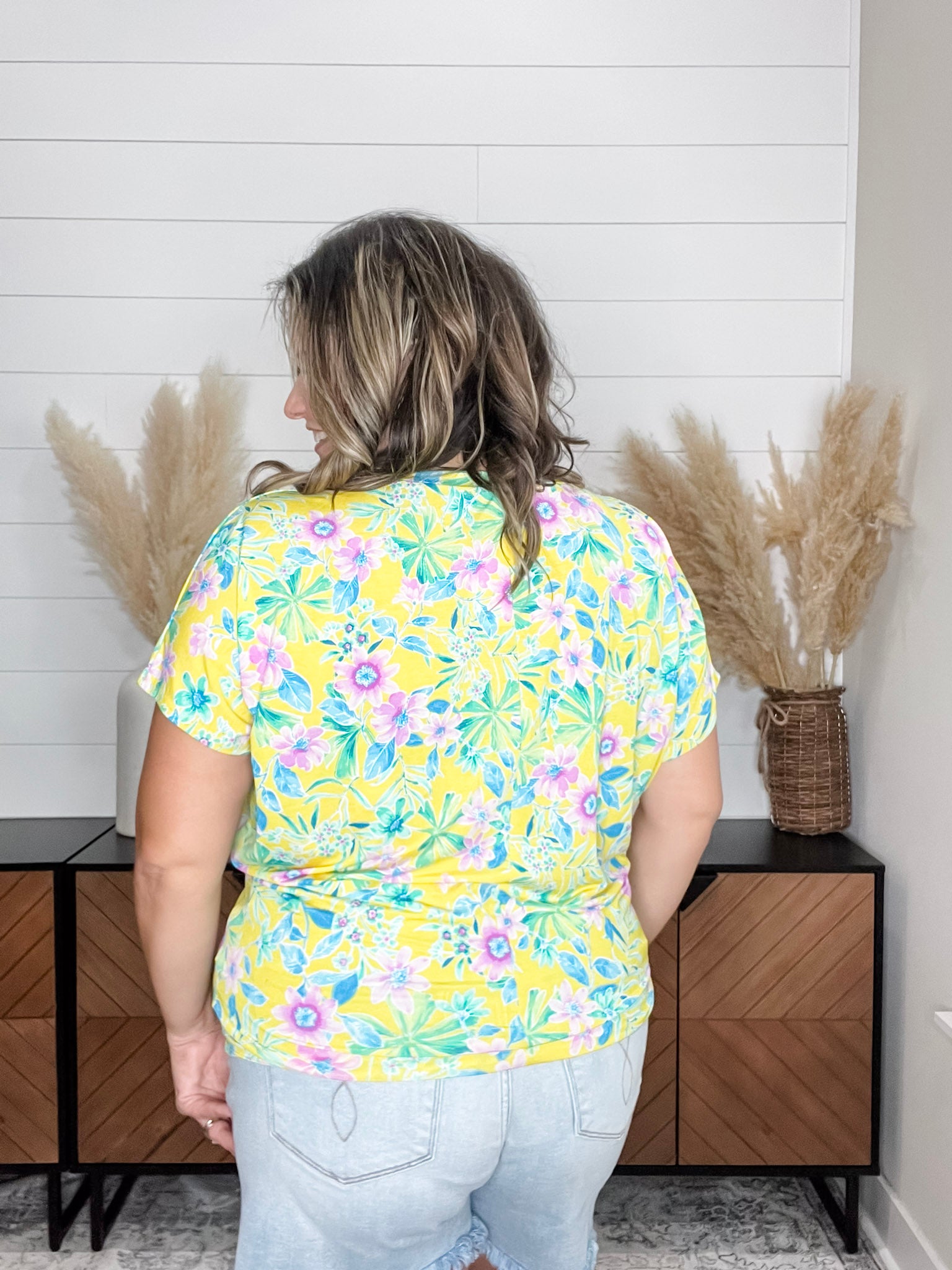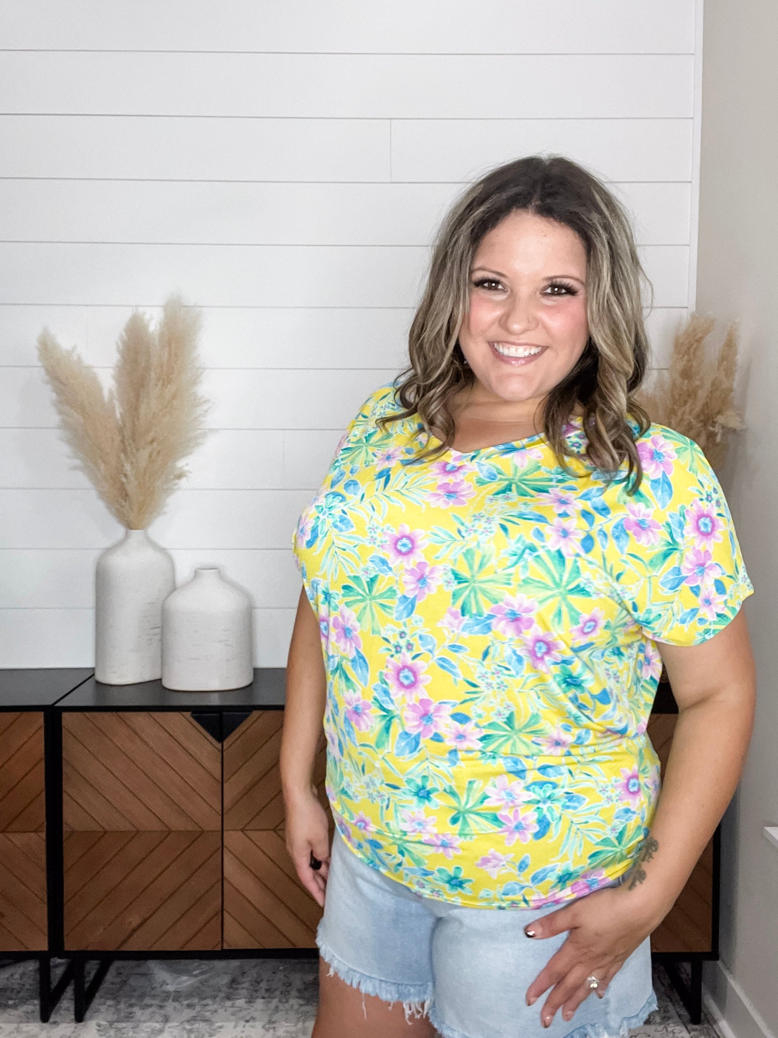 The "Another Option" V-Neck Dolman offers a slinky and stretchy fit that is both comfortable and flattering. With a roomy underarm area and tapered tummy, this floral top is perfect for any occasion. Available in yellow, it is a great addition to any wardrobe.