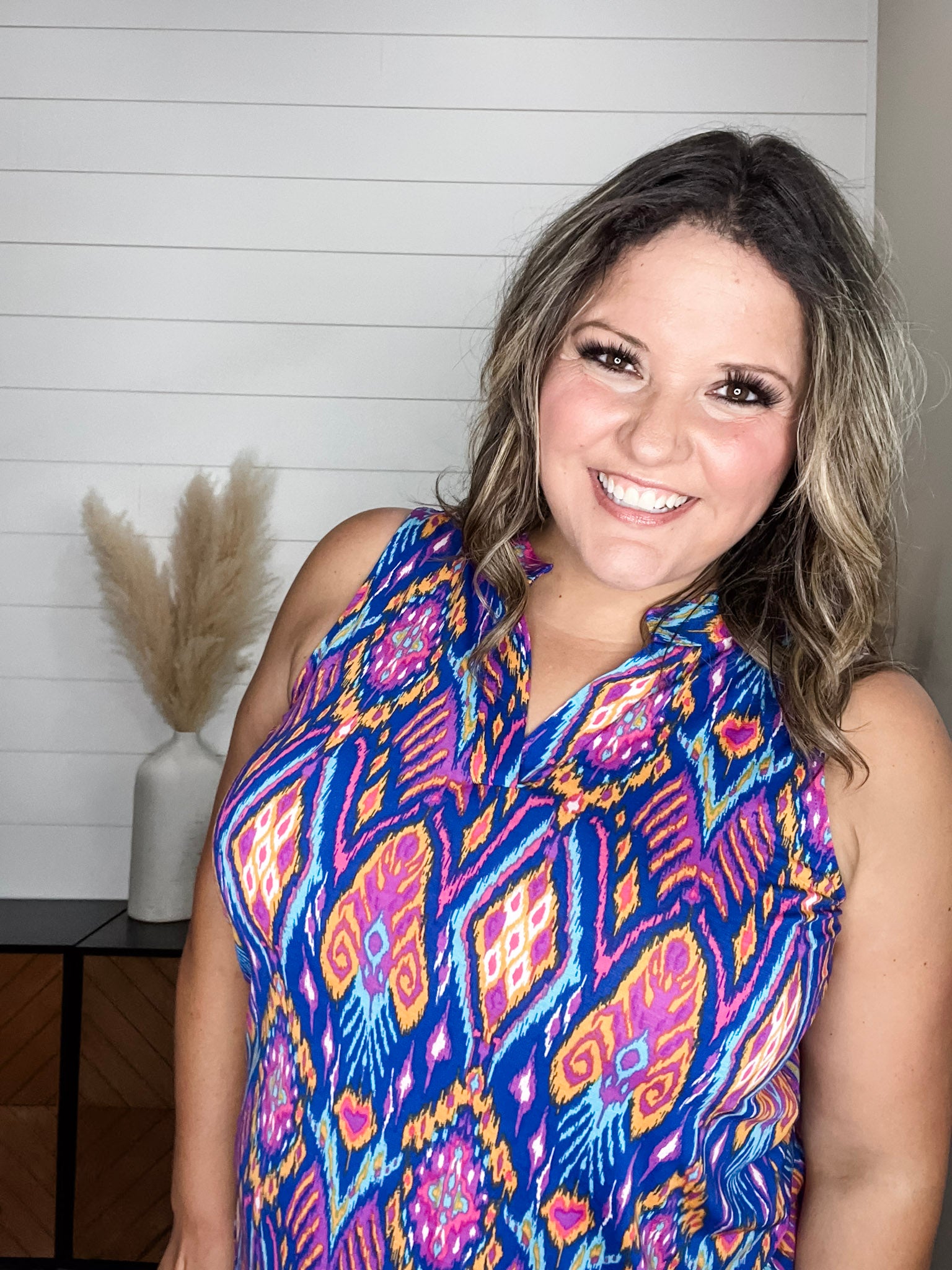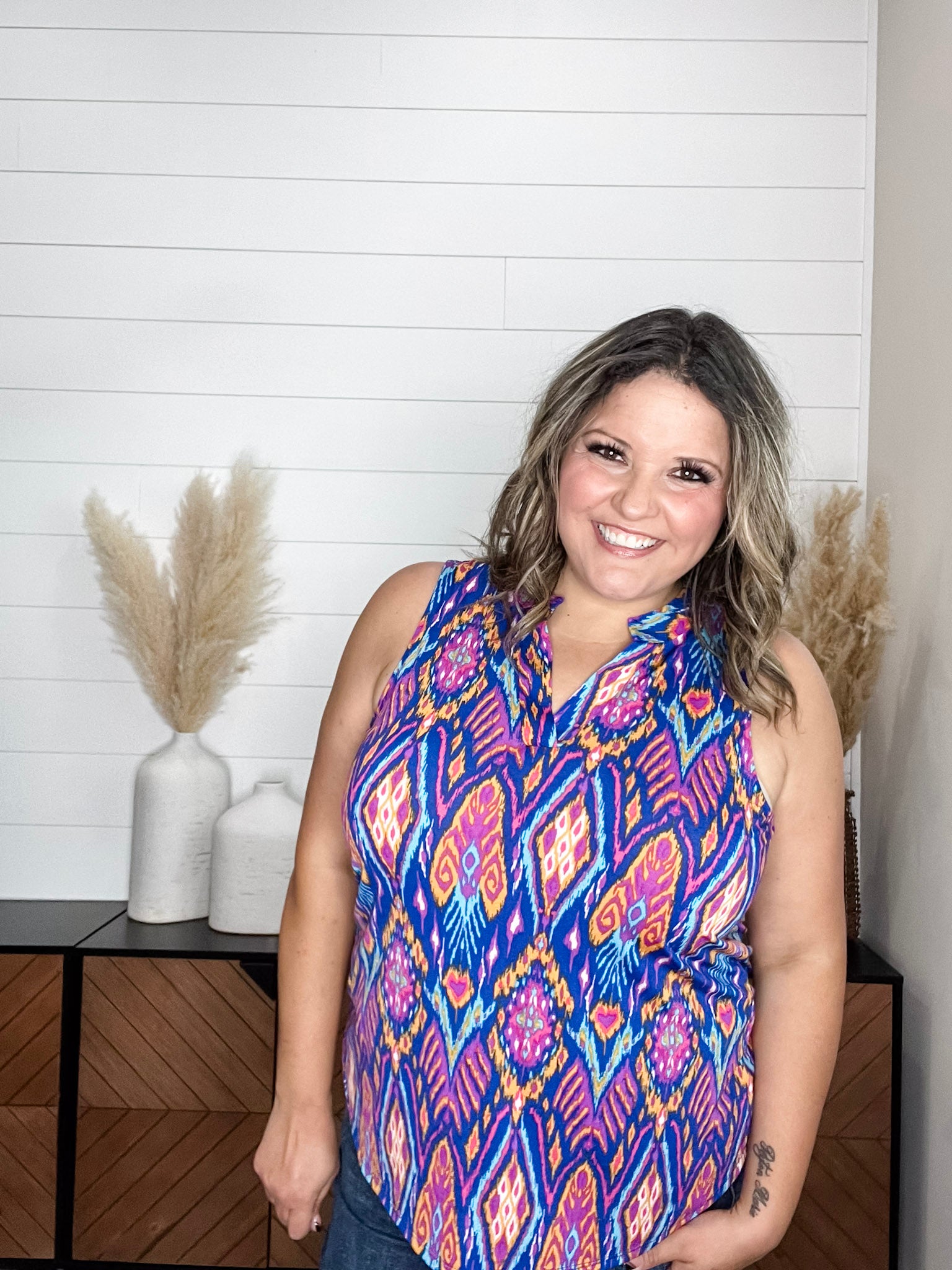 The "Avenue" Sleeveless Lizzy is perfect for those seeking comfort and style. Made with slinky stretchy material, it offers the perfect fit while remaining true to size. Its bold pattern and colors are sure to make a statement, and it's large breast friendly design ensures the ultimate comfort and confidence.