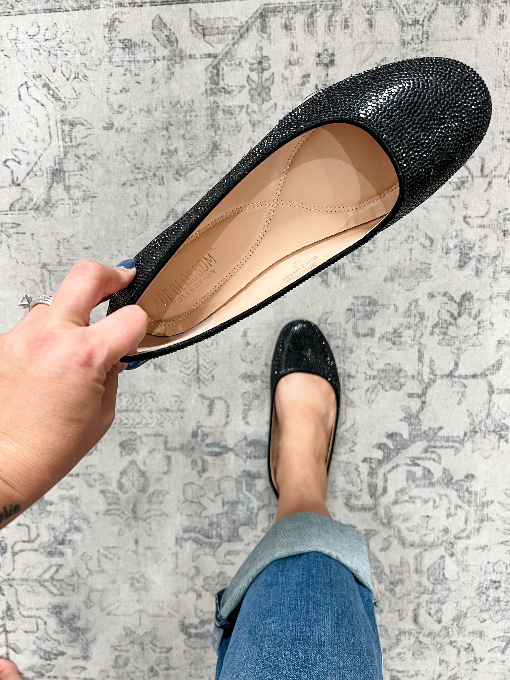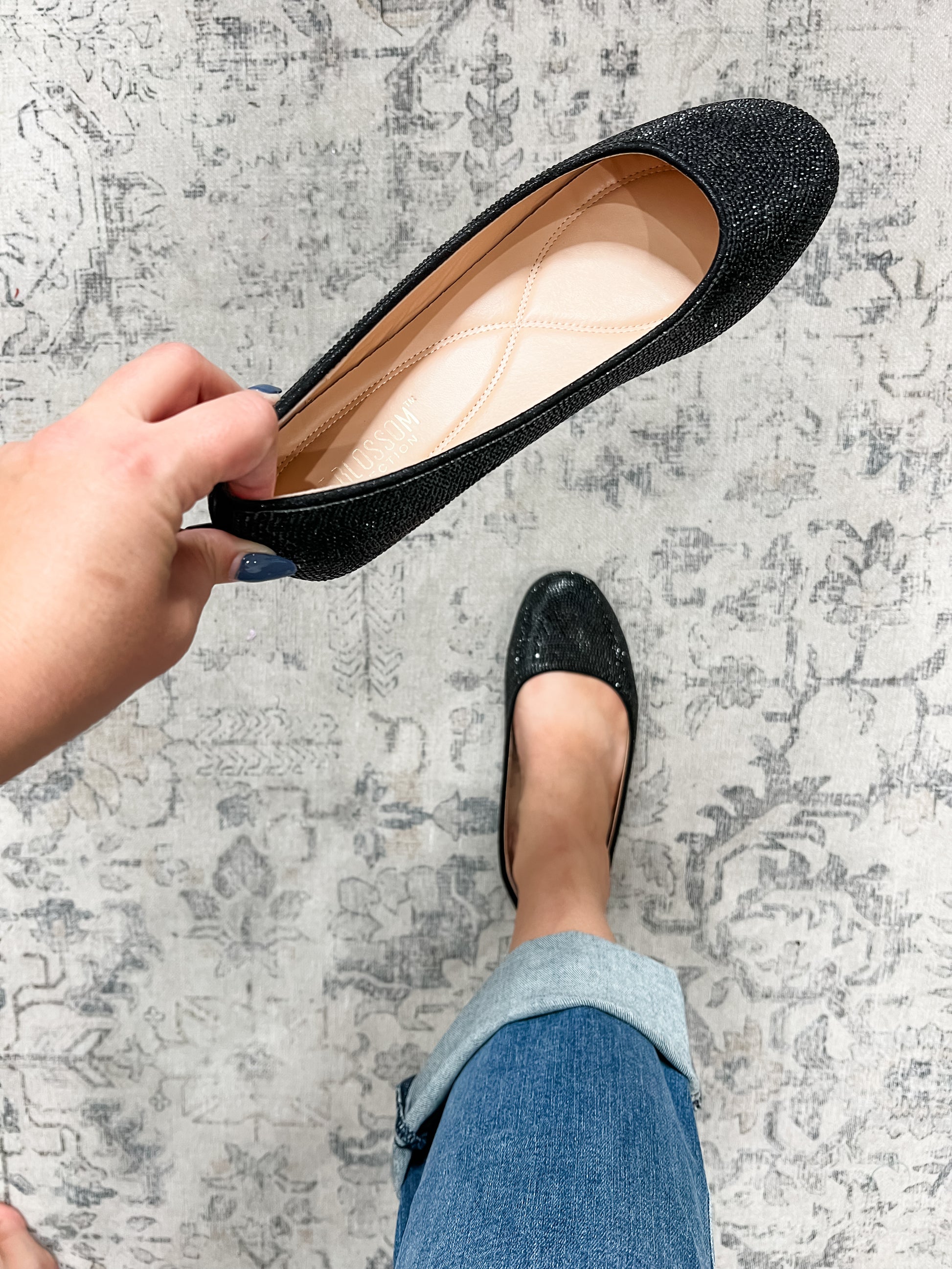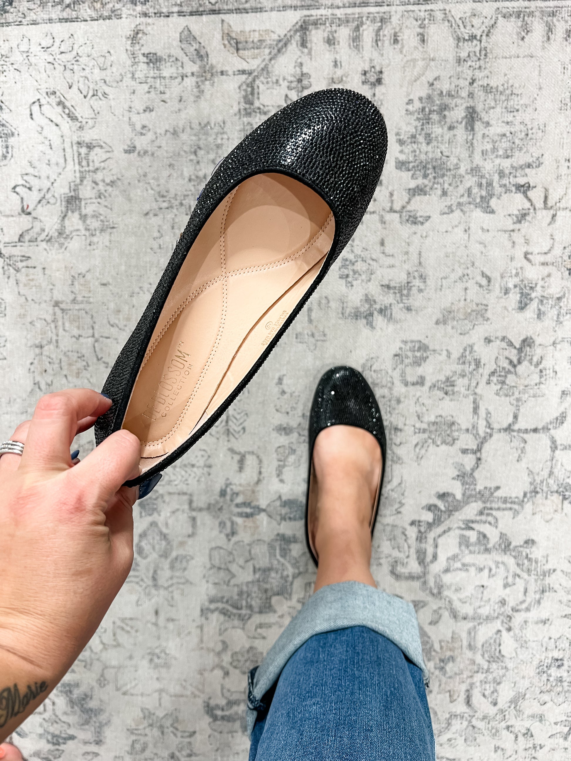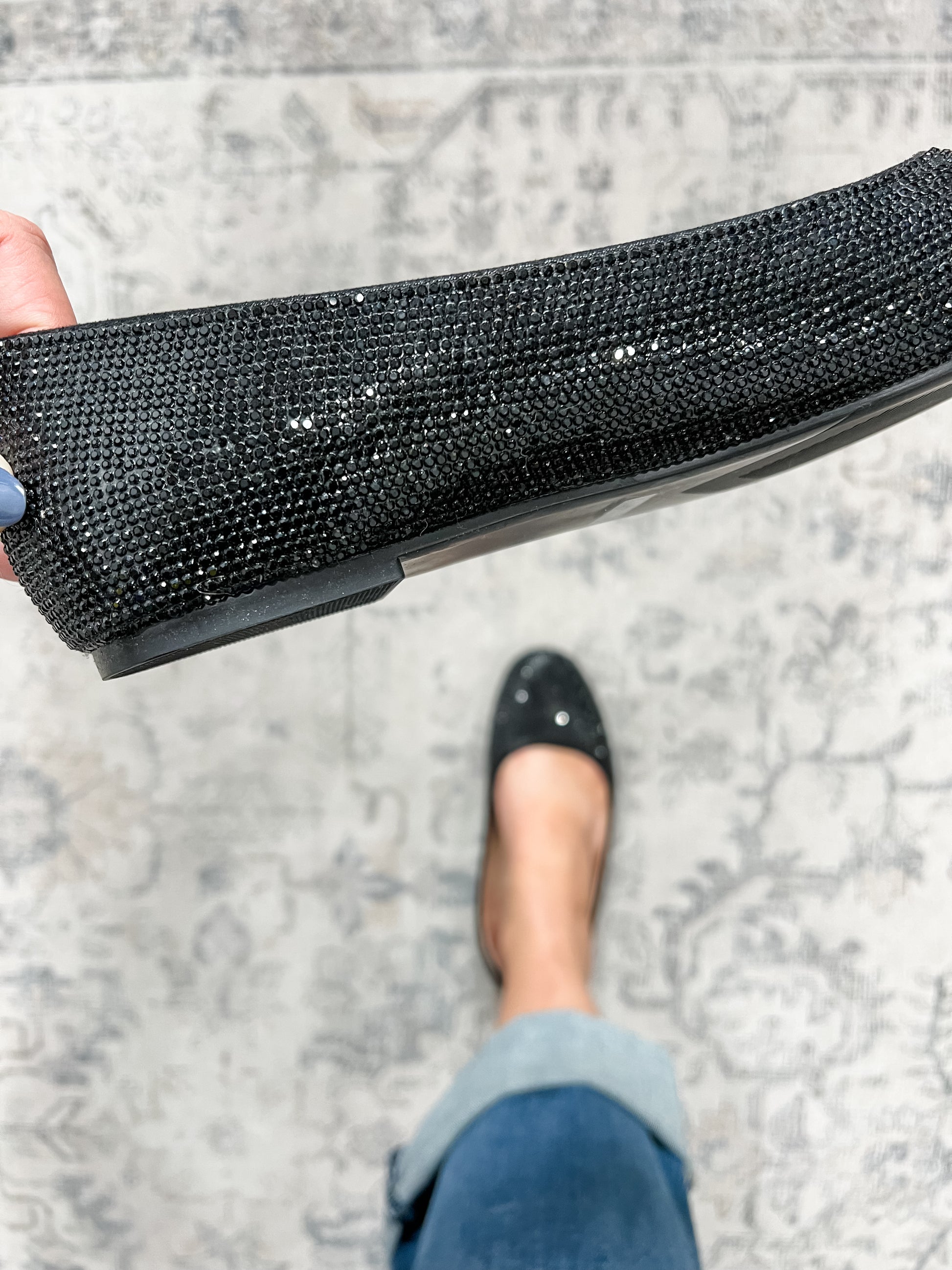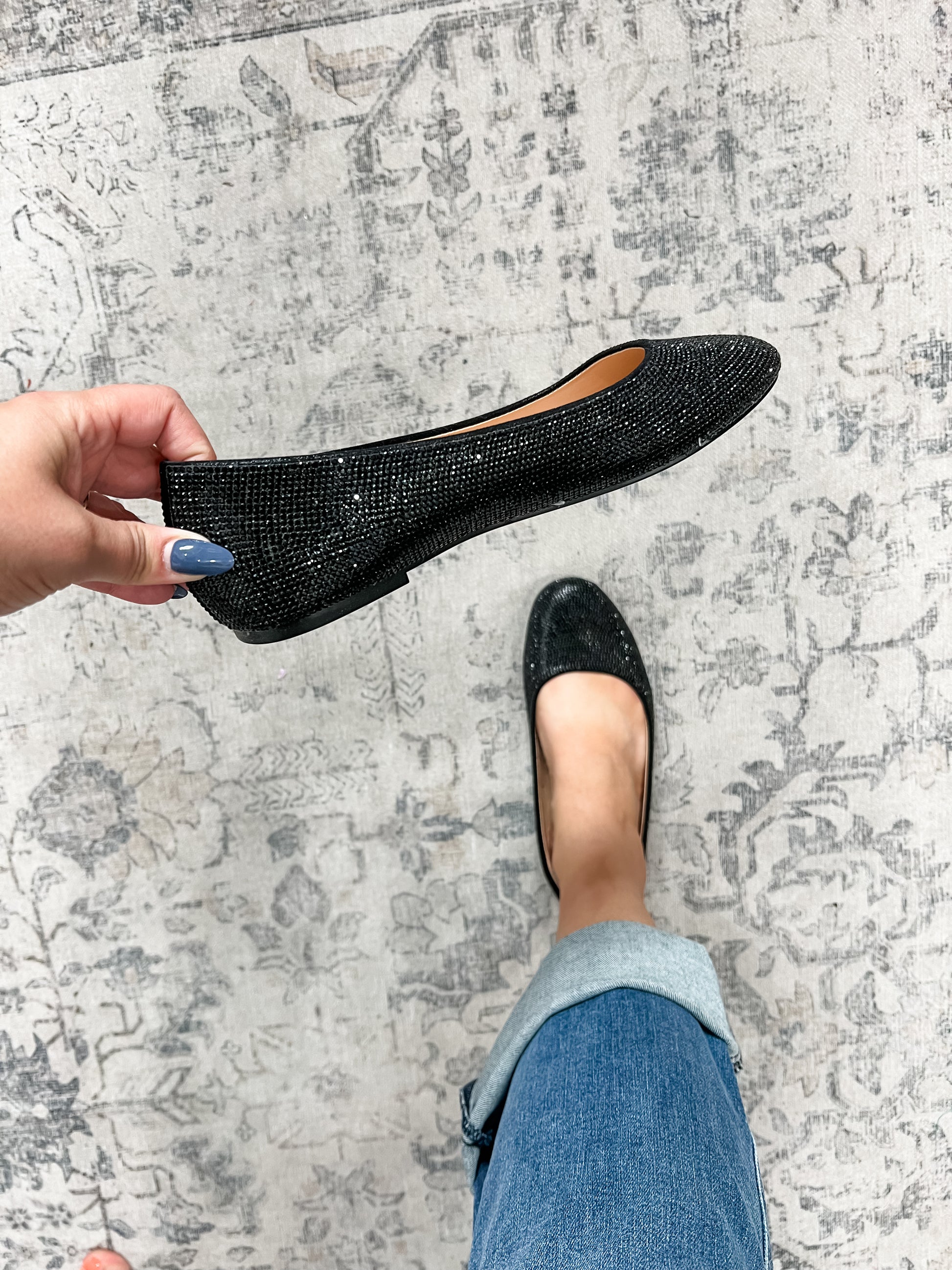Black rhinestone ballet flats are perfect to dress up a pair of skinny jeans or skirt this season. Wide foot friendly.