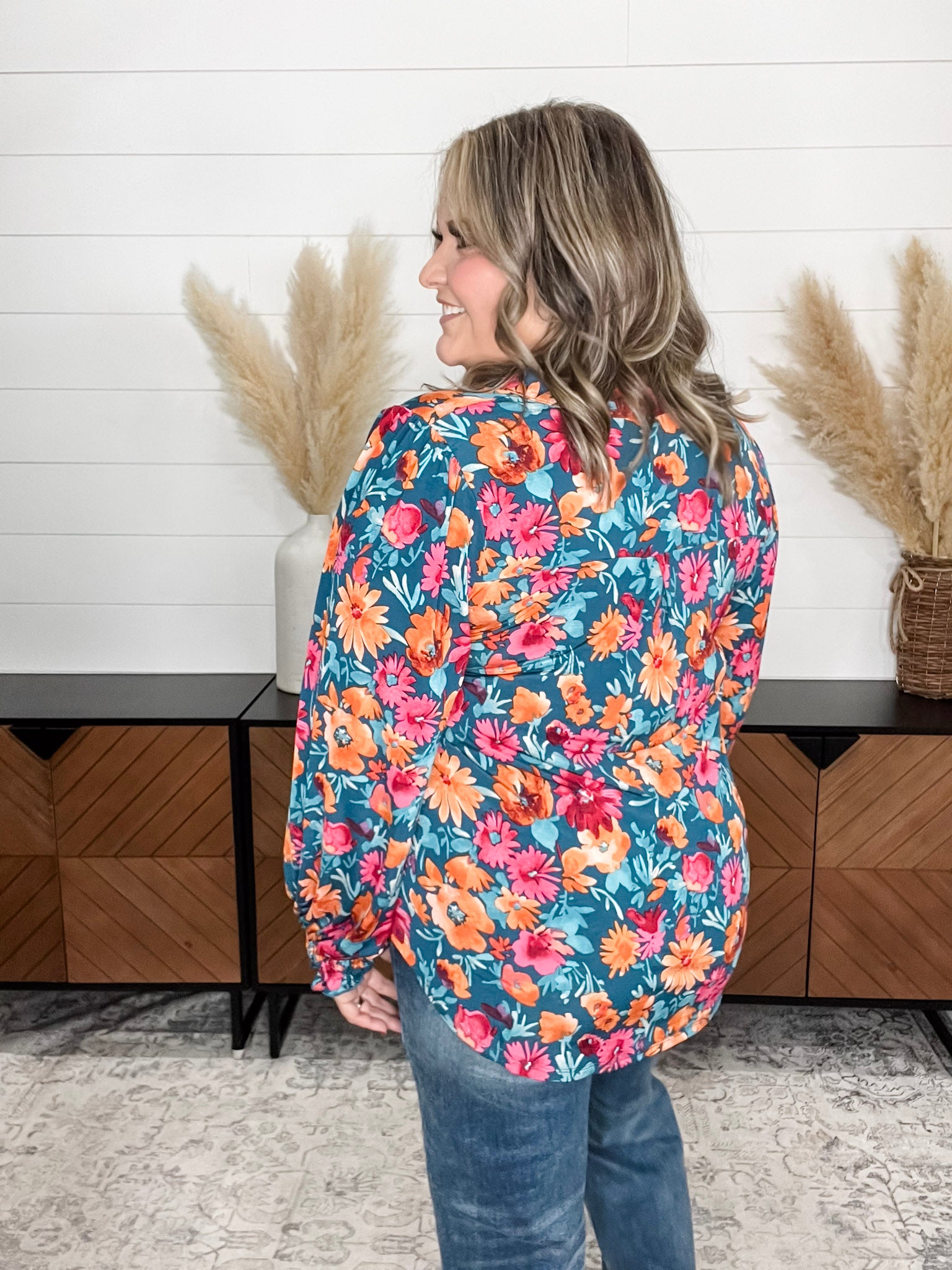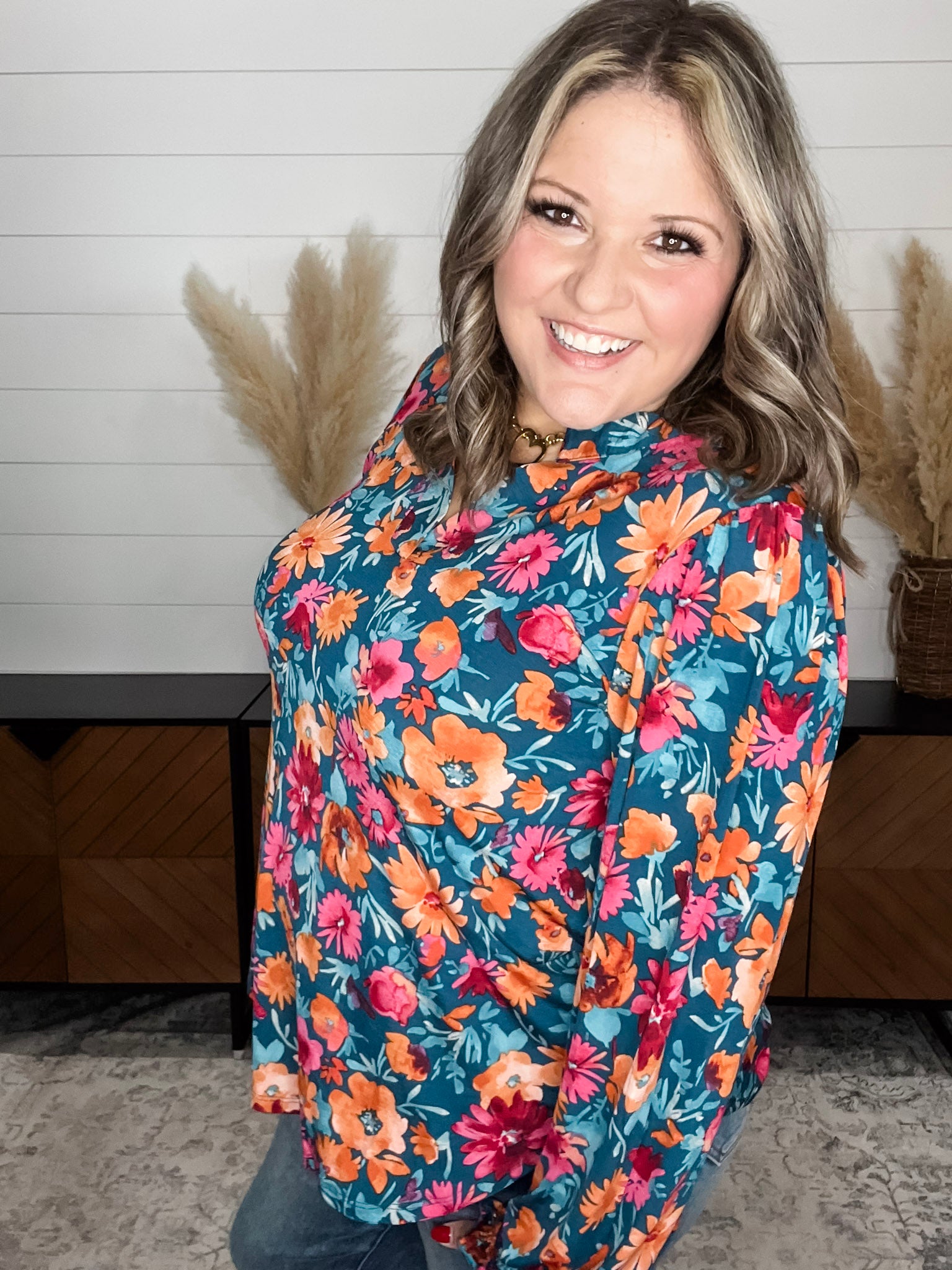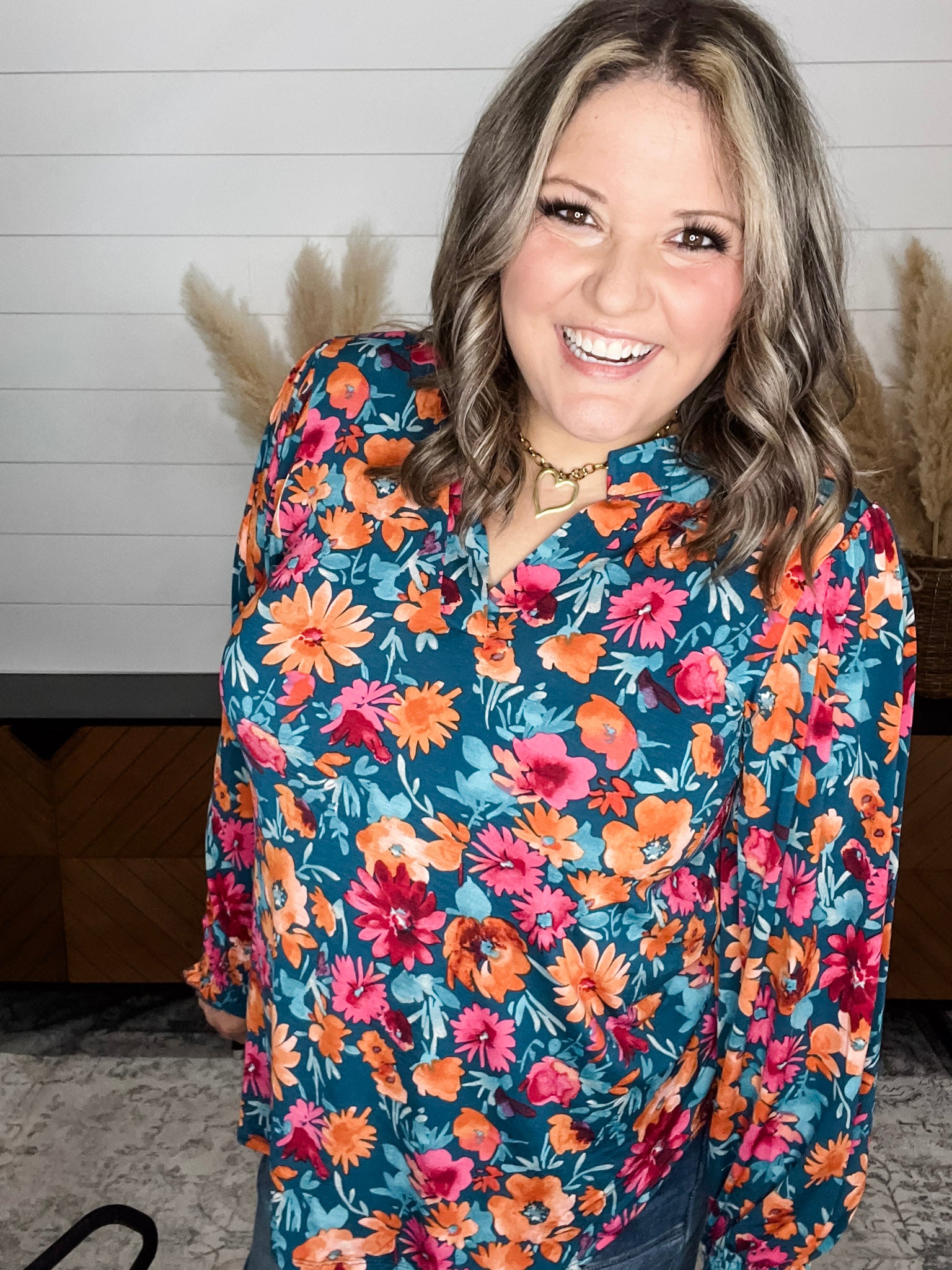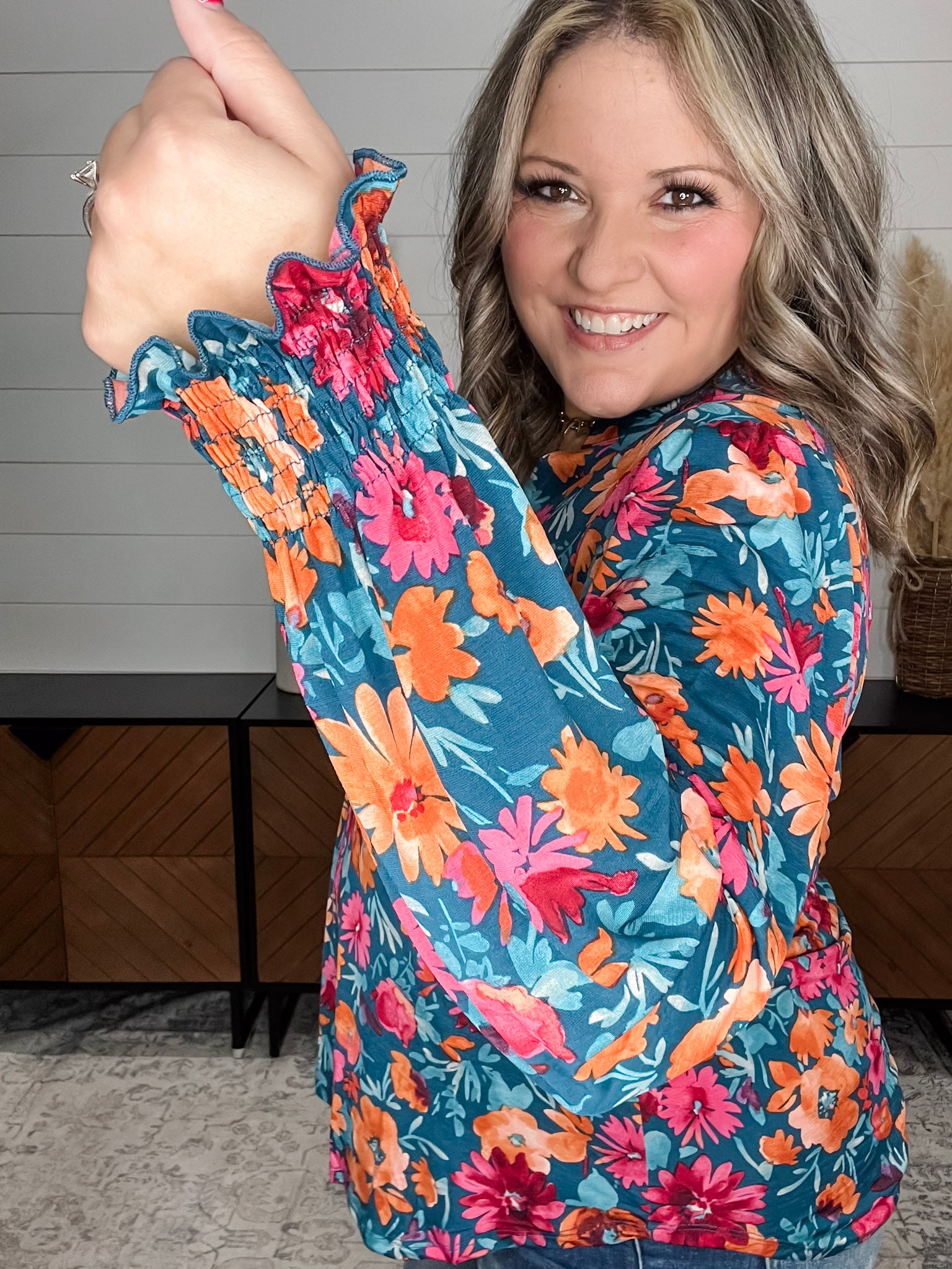 Slip into the "Bates" Smocked Wrist Long Sleeve Split Neck, a playful floral piece bursting with rich jewel tones. The slinky, stretchy fabric hugs your curves in all the right places—just size down one for the perfect fit. With its smocked wrists and flirty split neck, this top brings fun and elegance together effortlessly.