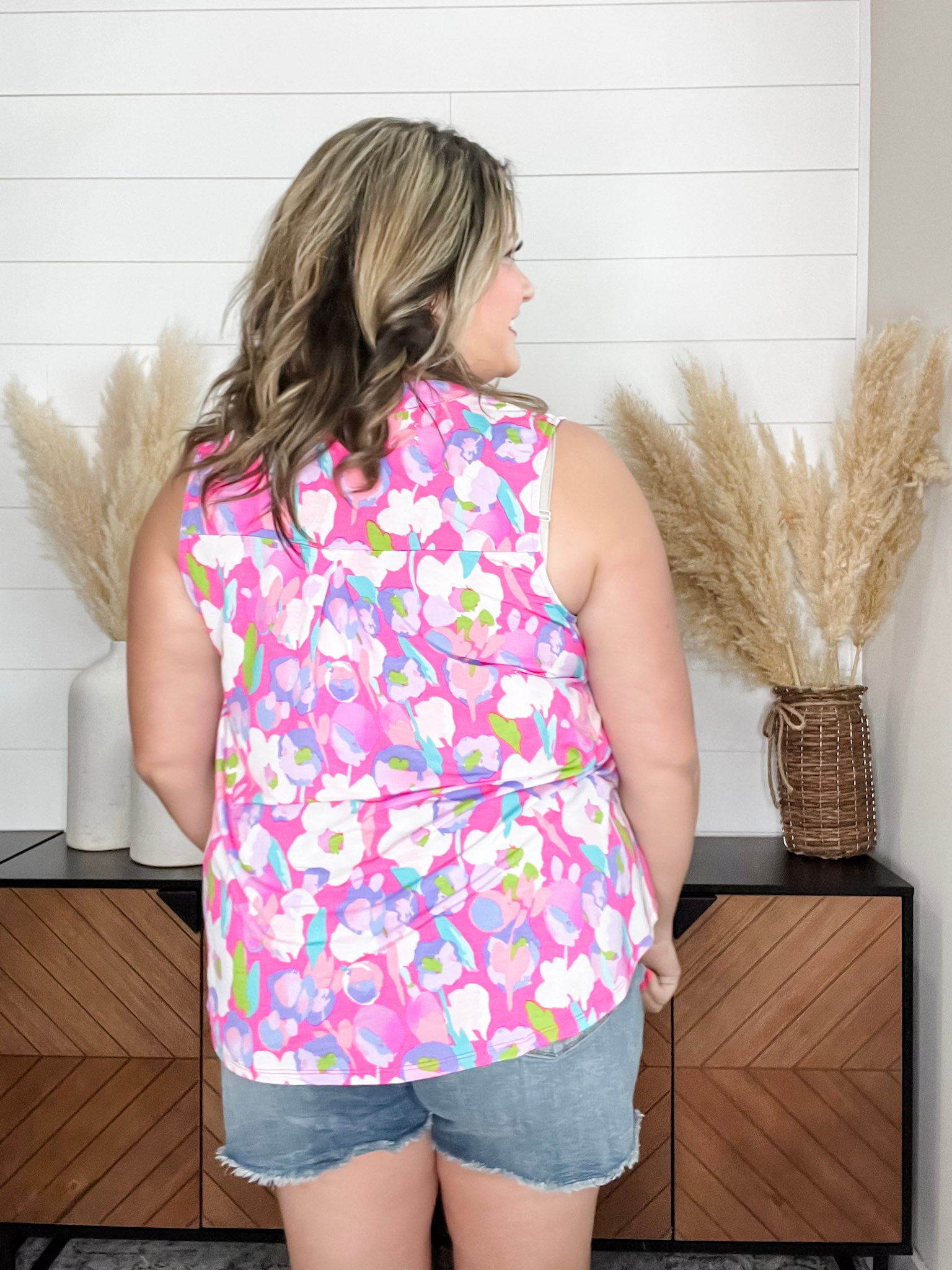 The "Bethel" Sleeveless Split Neck top, part of the Dear Scarlett brand, offers a slinky, stretchy fit that is both wrinkle-free and perfect for larger busts. With a hot pink base and floral design, it combines style and functionality for a versatile addition to your wardrobe.