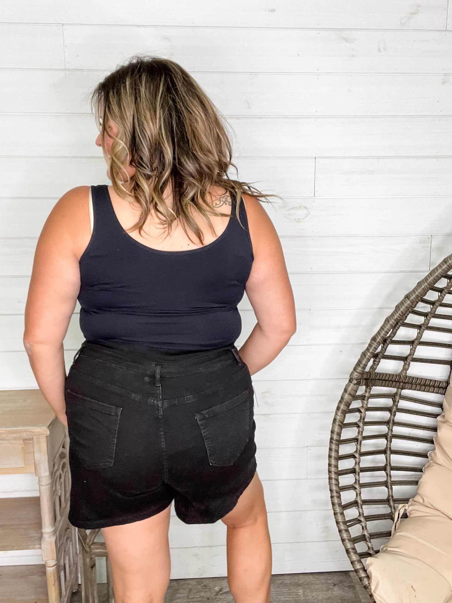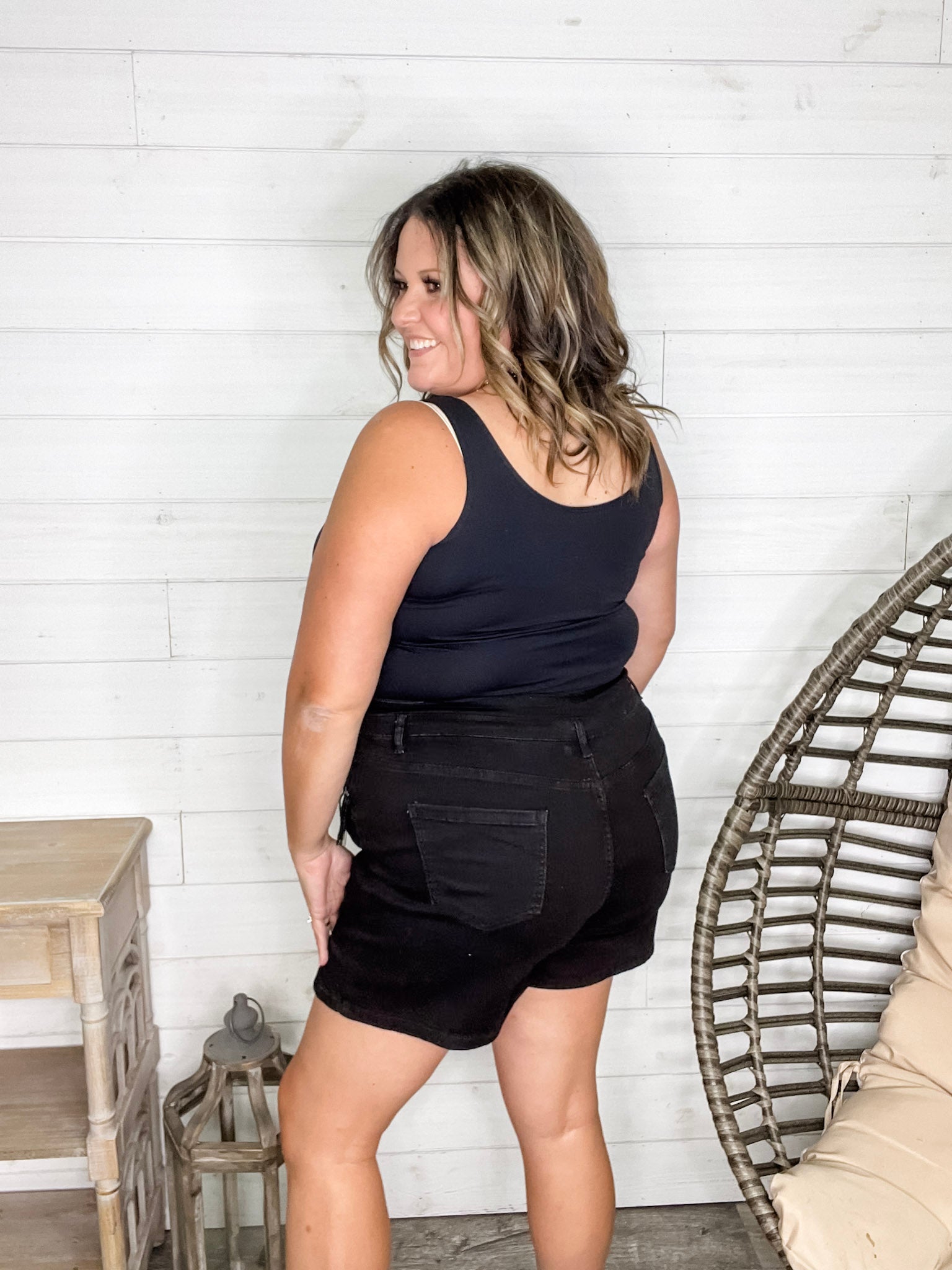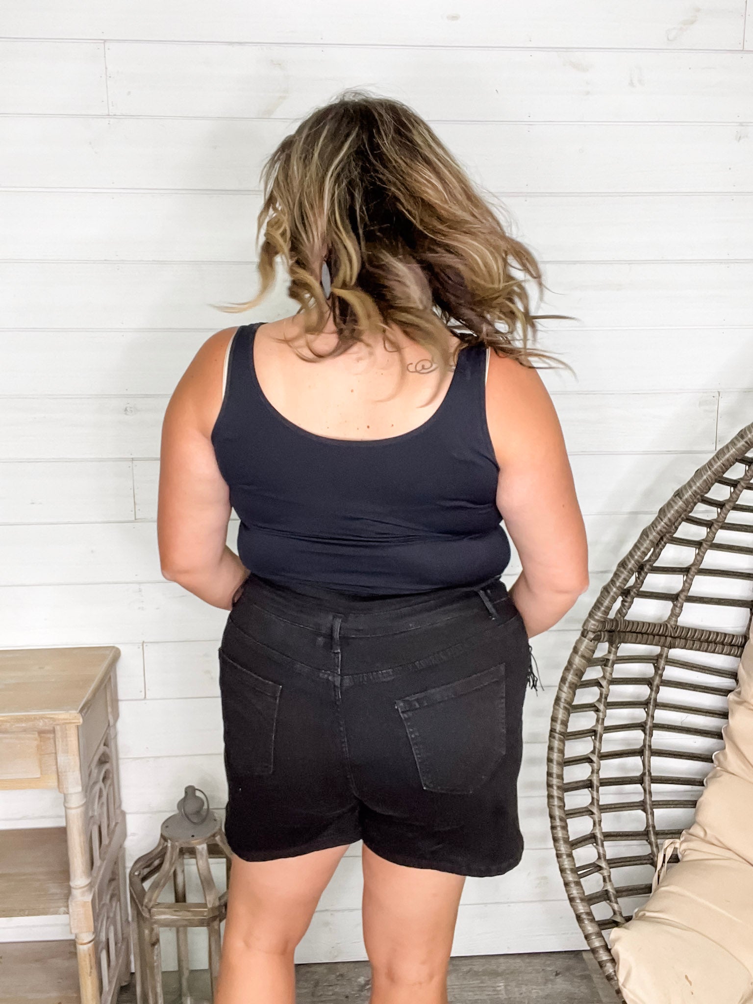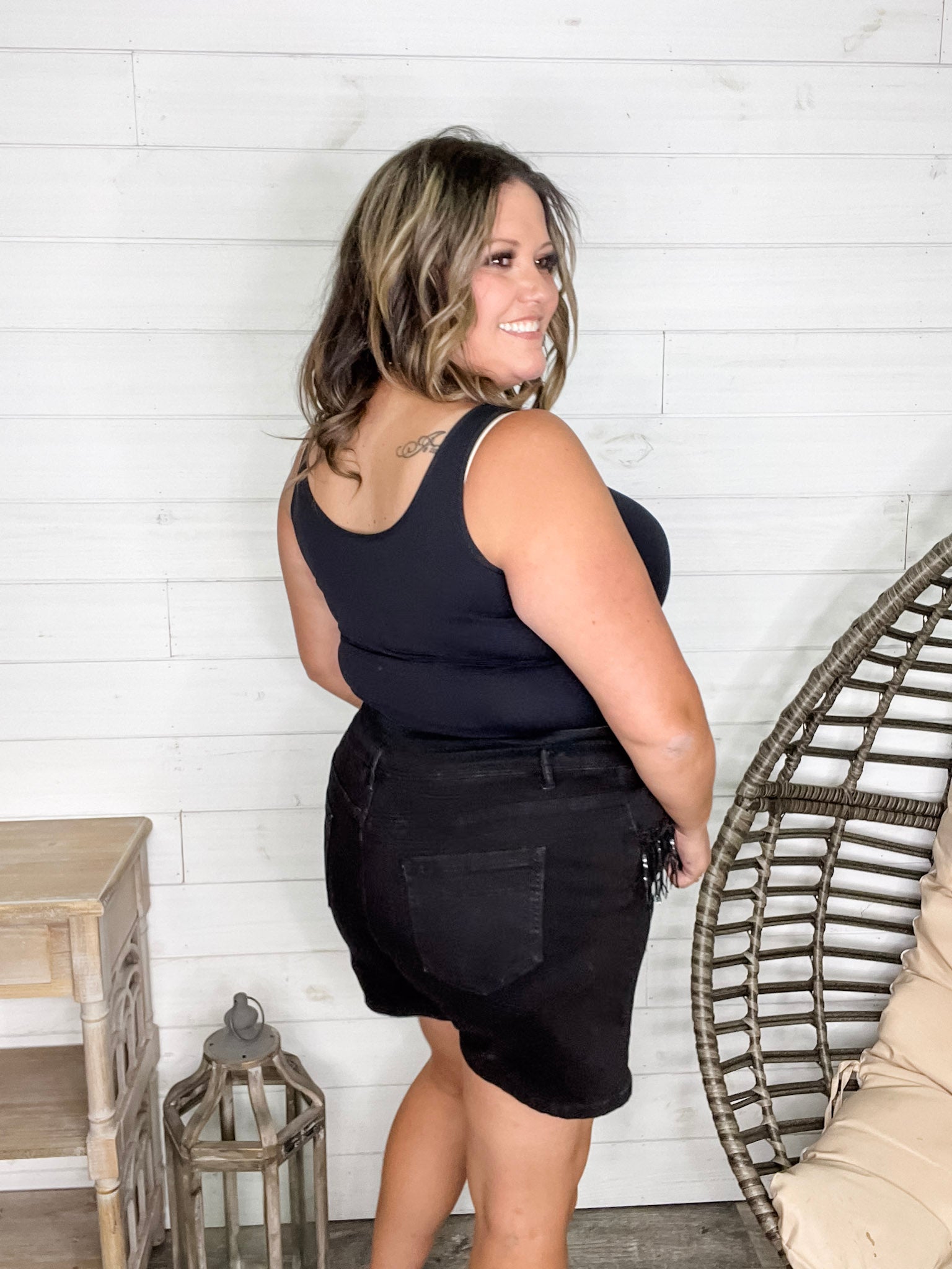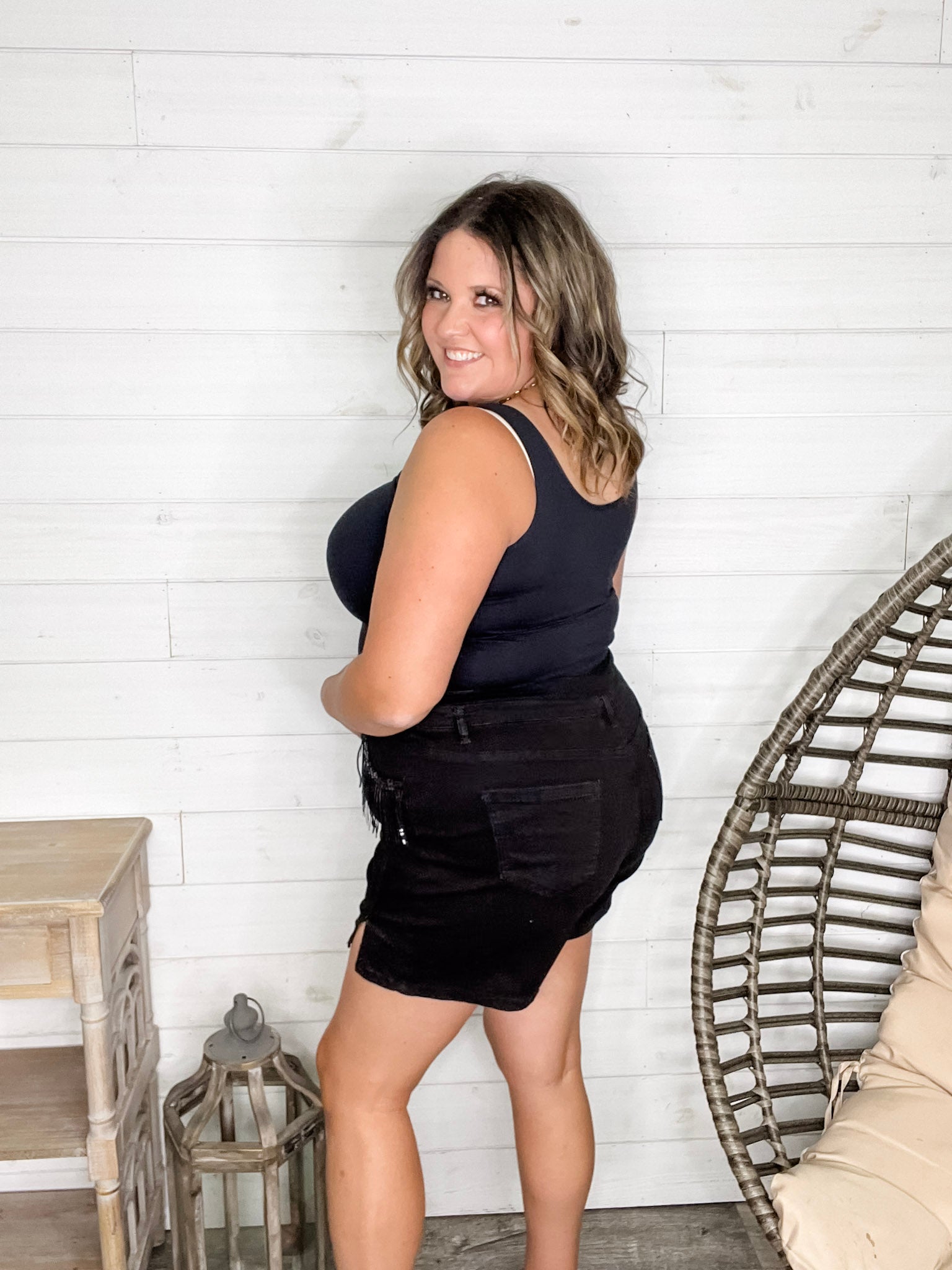 Get ready to shine in the "Blaine" Double Button Shiny Pocket Fringe Shorts! Designed for a perfect fit, Ashley rocks a size 16 in Large for a shorter inseam and lower rise, or XL for a mega high rise and longer length. Subtle sequin details on the pockets add just the right amount of sparkle, making these shorts a playful and stylish choice for sunny days and fun nights out.