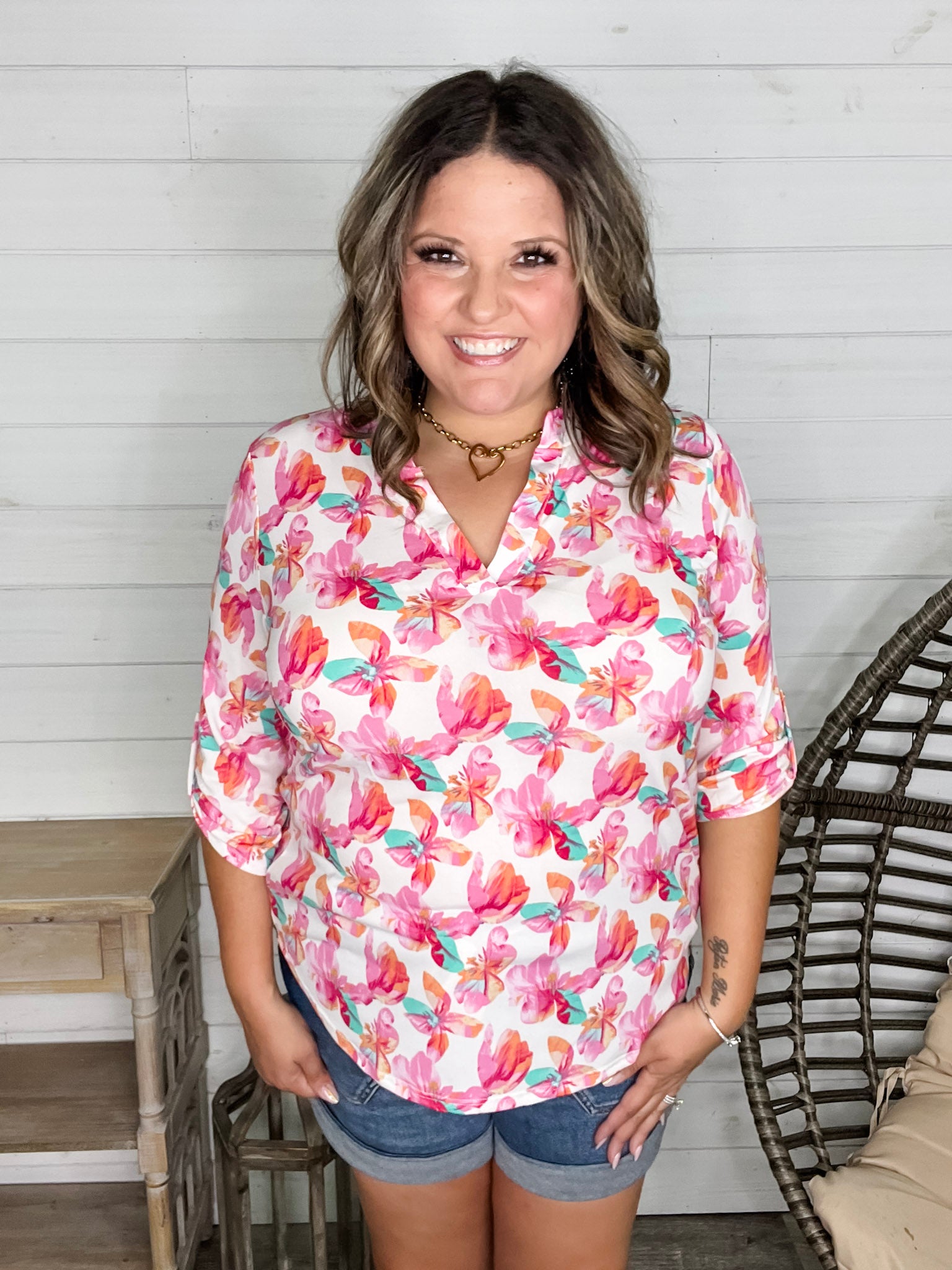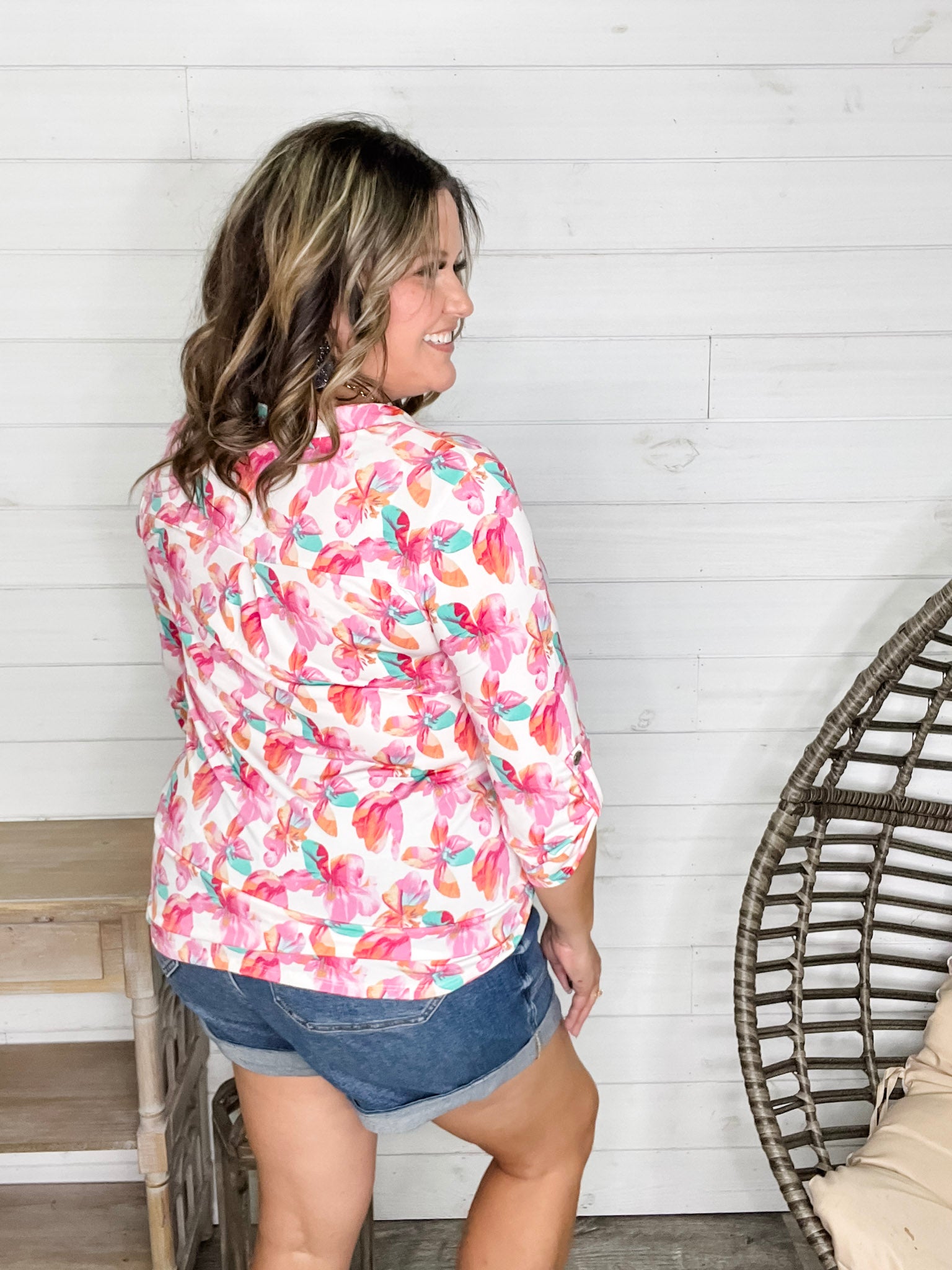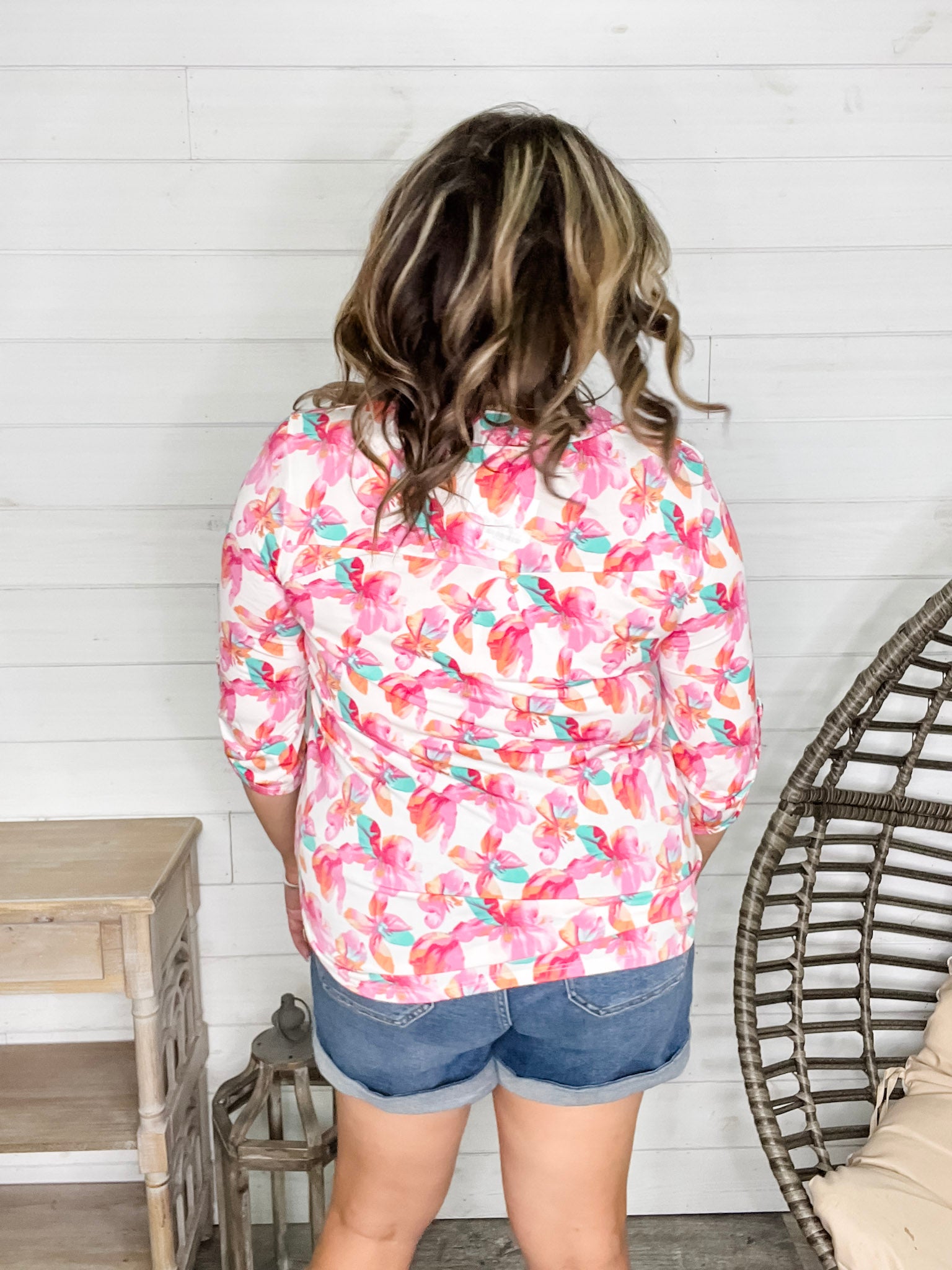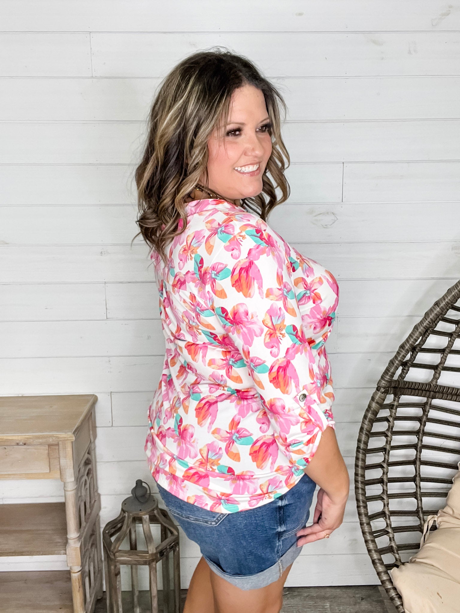 "Blink Of An Eye" Floral 3/4 Sleeve Split Neck (Pink)