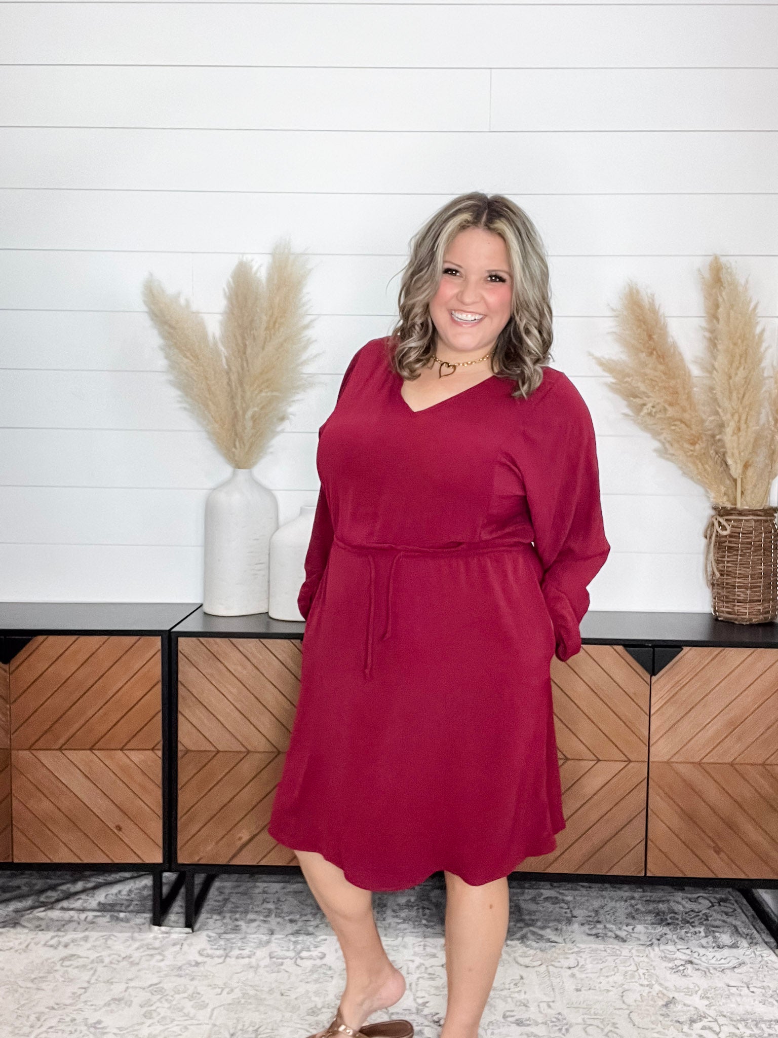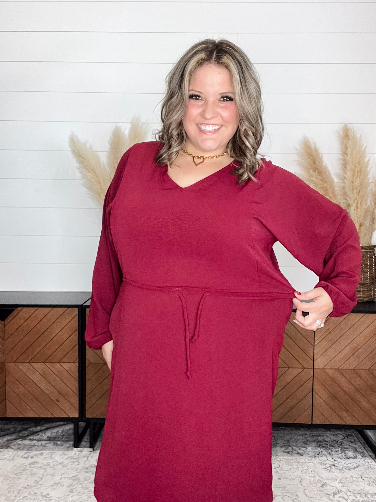 "Borderline" Long Sleeve V Neck Dress with Drawstring Waist (Burgundy)