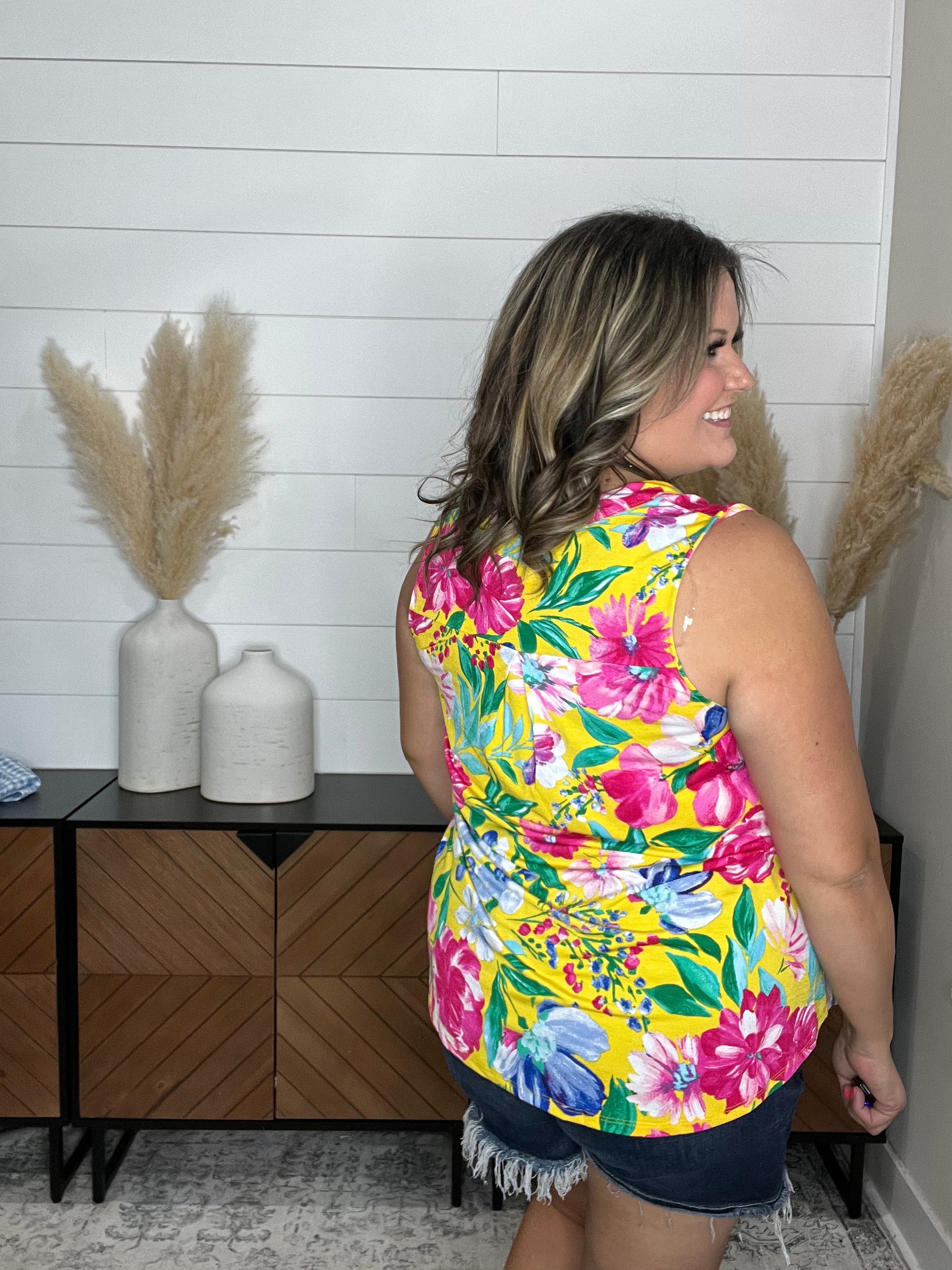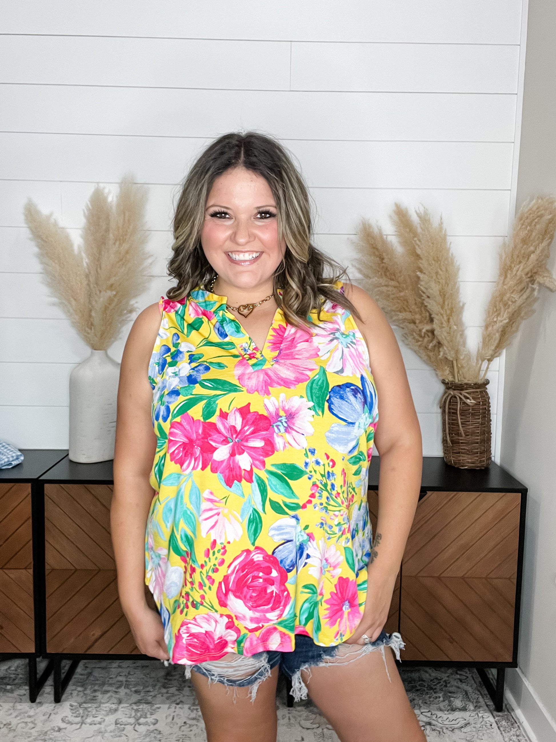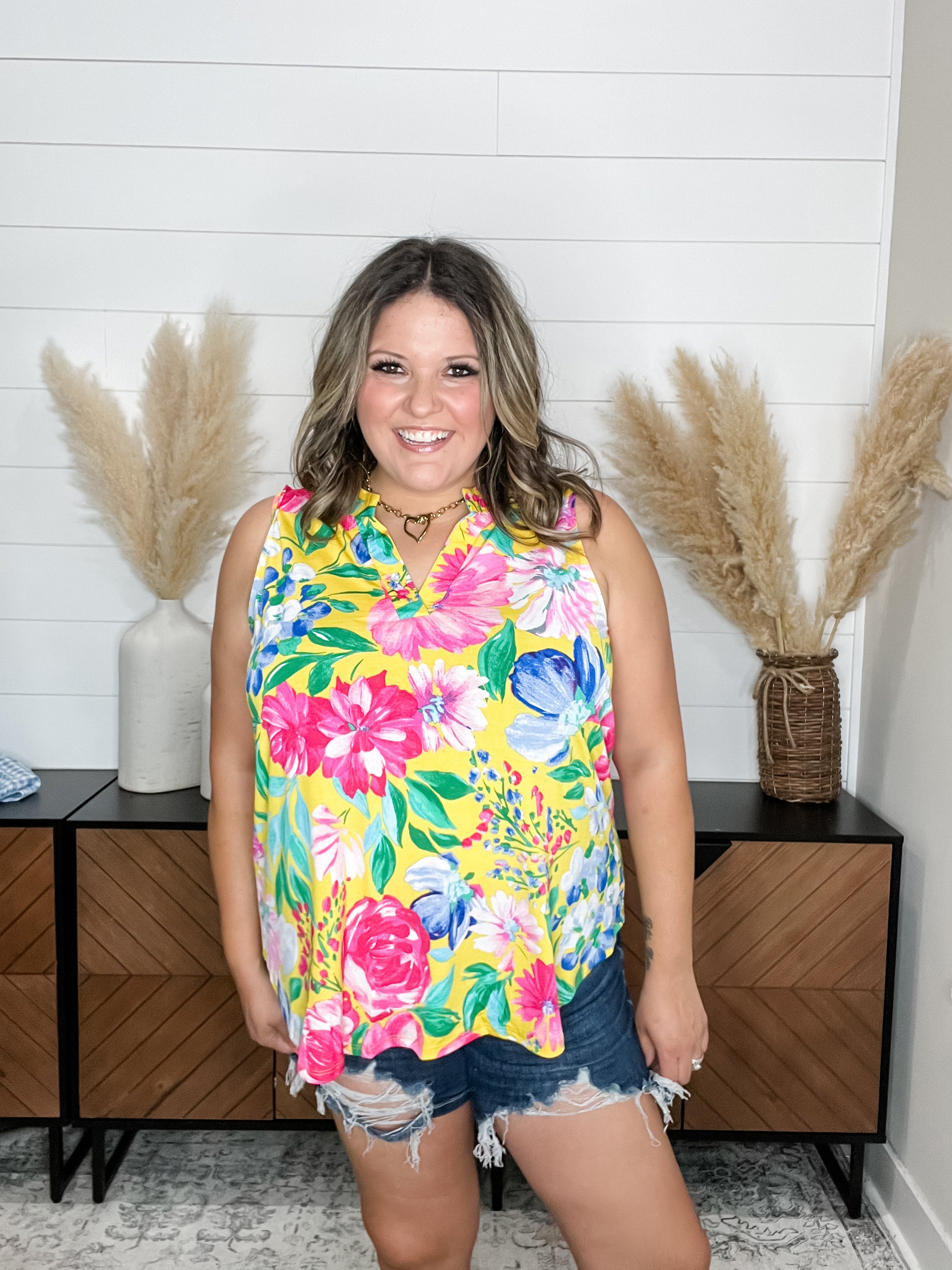 Add a splash of sunshine to your wardrobe with the "Brewster" Sleeveless Split Neck top. Featuring a bold floral pattern on a stunning yellow base, this slinky, stretchy piece moves with you for all-day comfort. Designed true to size, it’s perfect for playful days and bright nights.