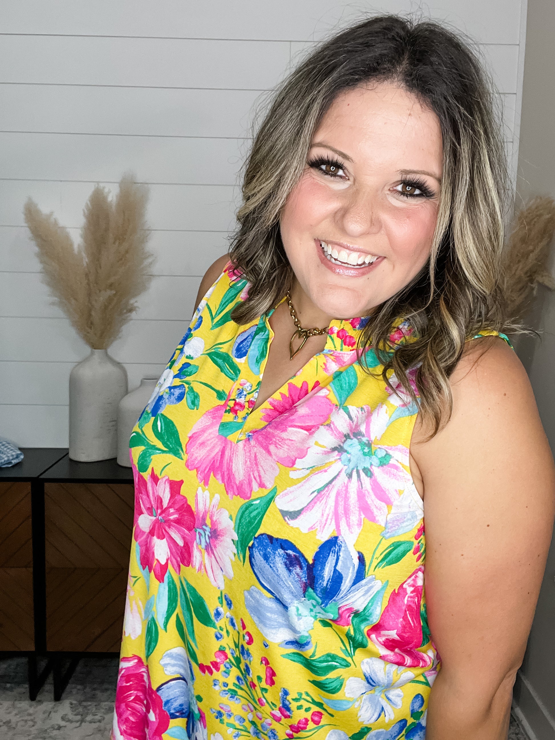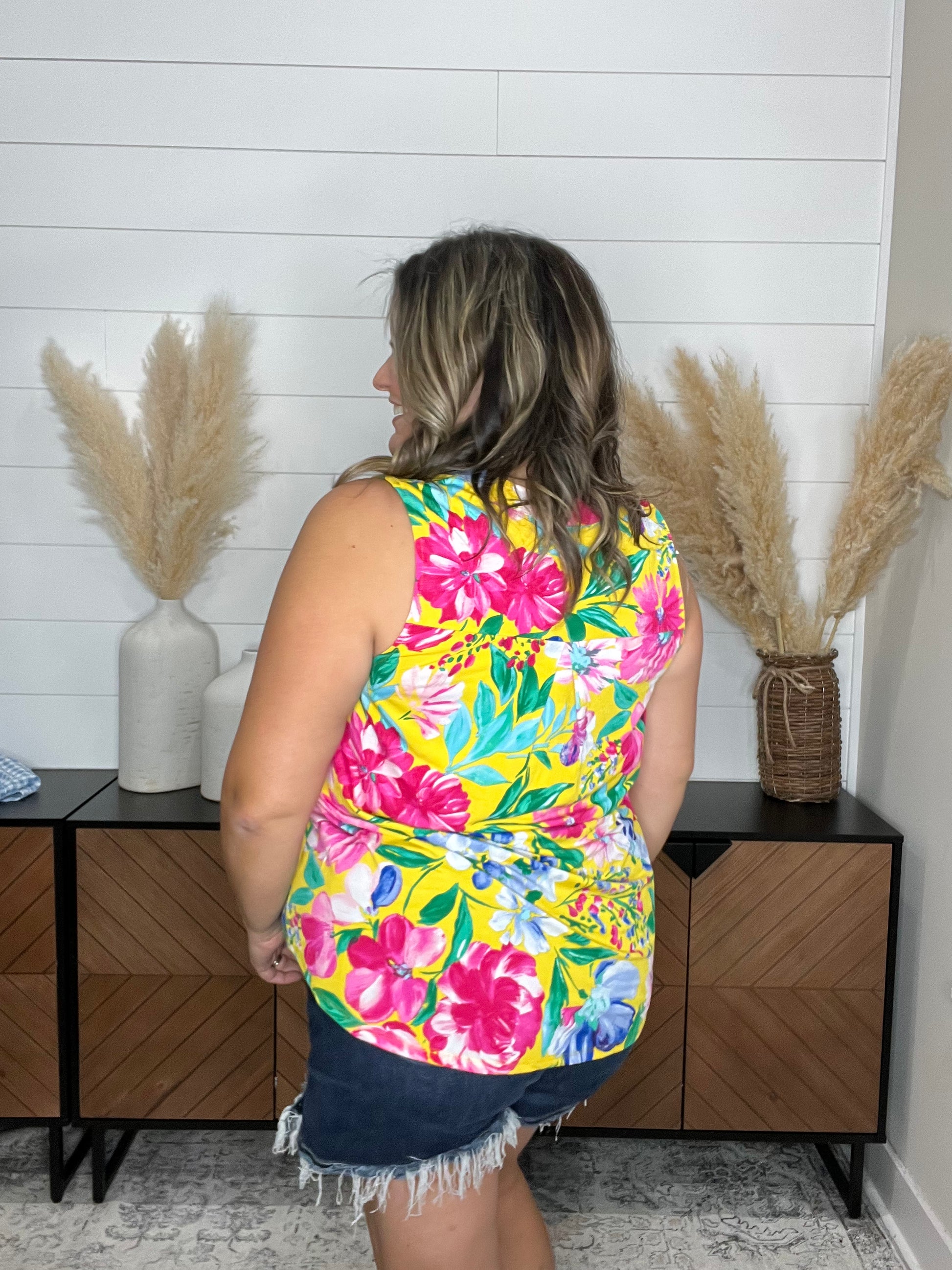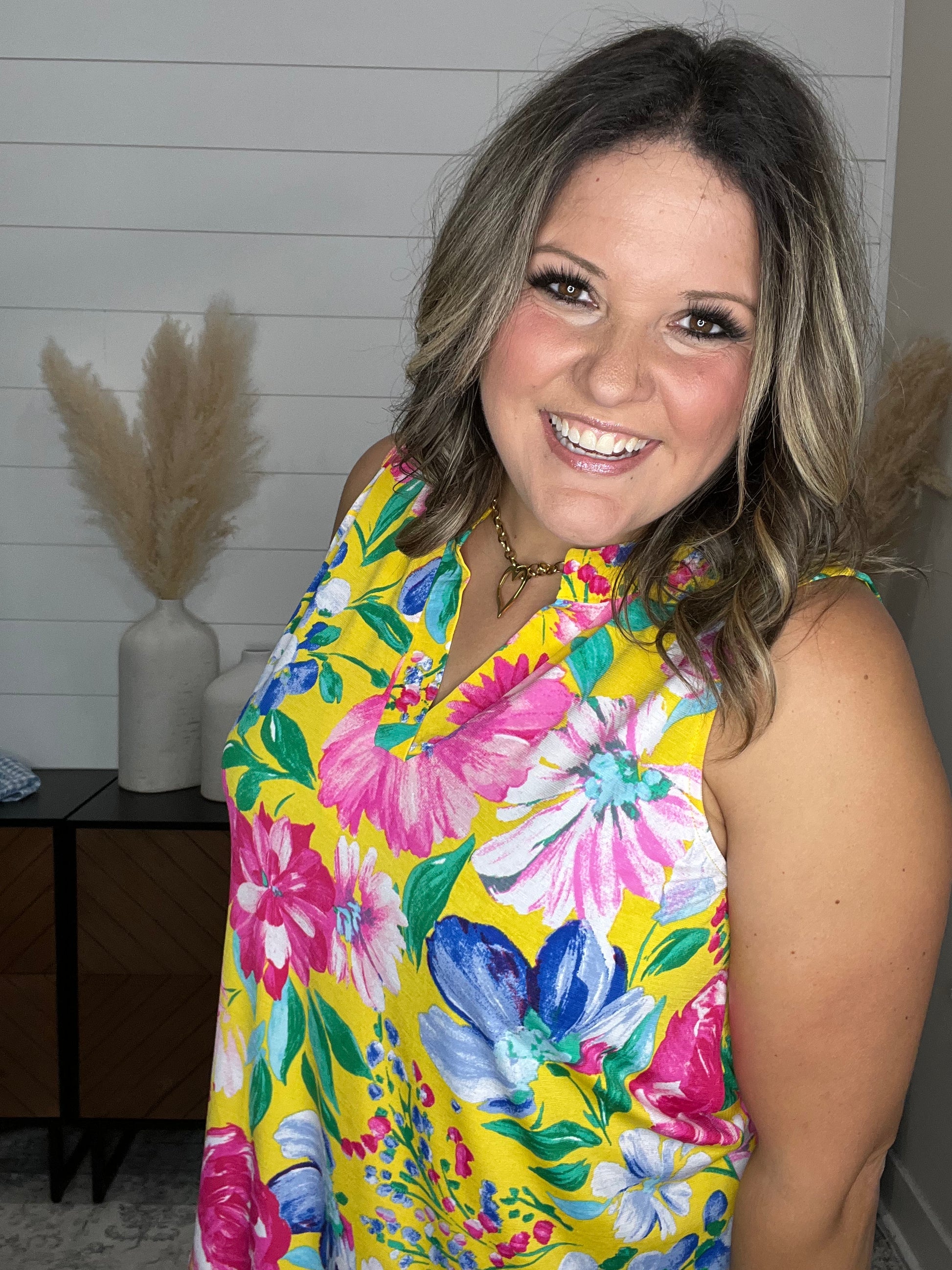 Add a splash of sunshine to your wardrobe with the "Brewster" Sleeveless Split Neck top. Featuring a bold floral pattern on a stunning yellow base, this slinky, stretchy piece moves with you for all-day comfort. Designed true to size, it’s perfect for playful days and bright nights.