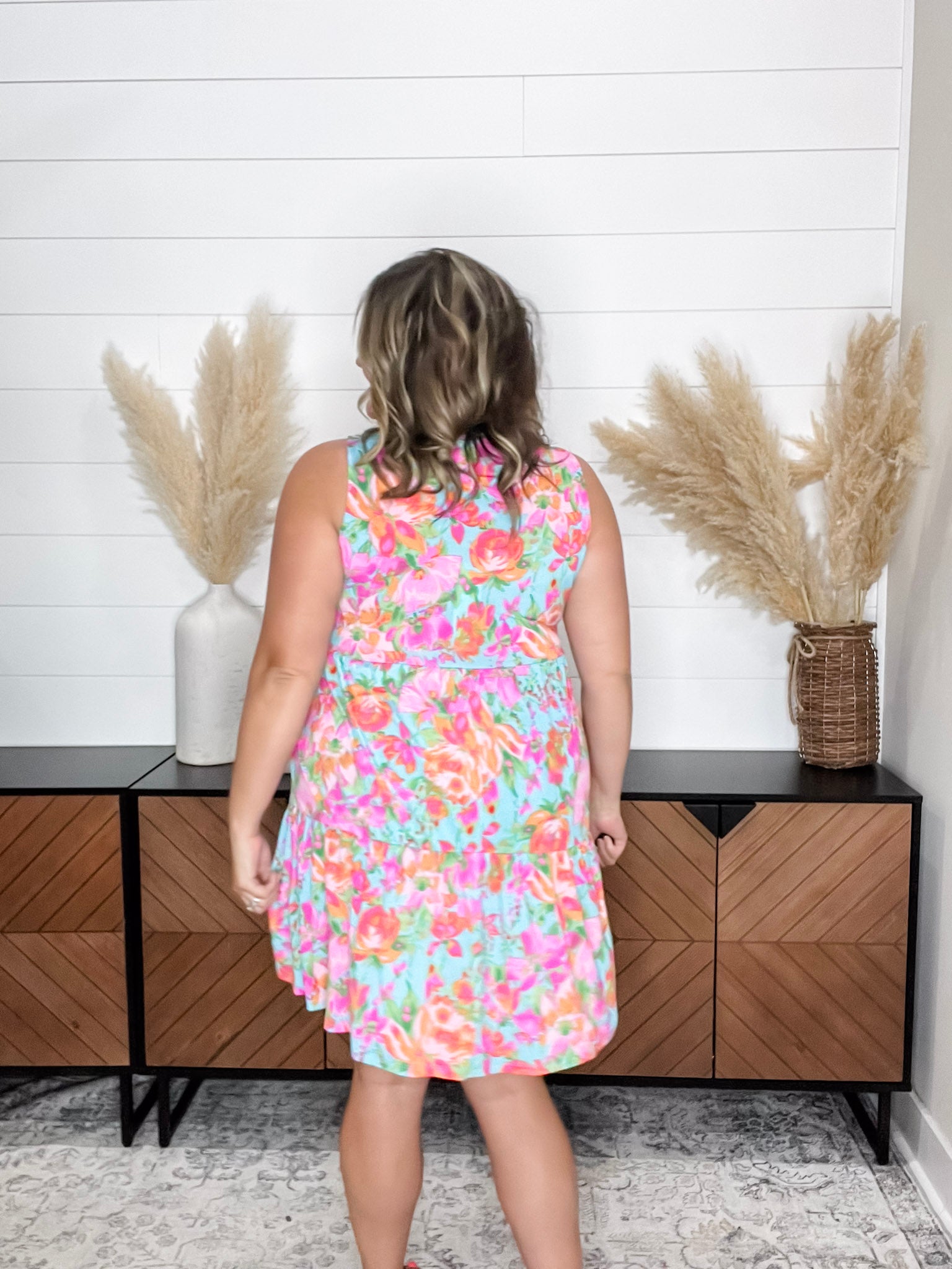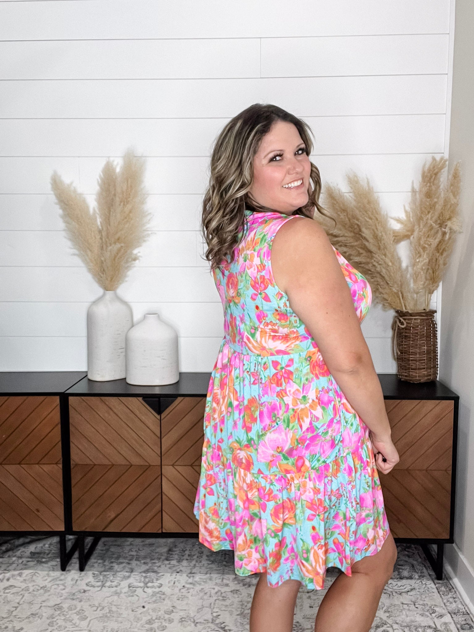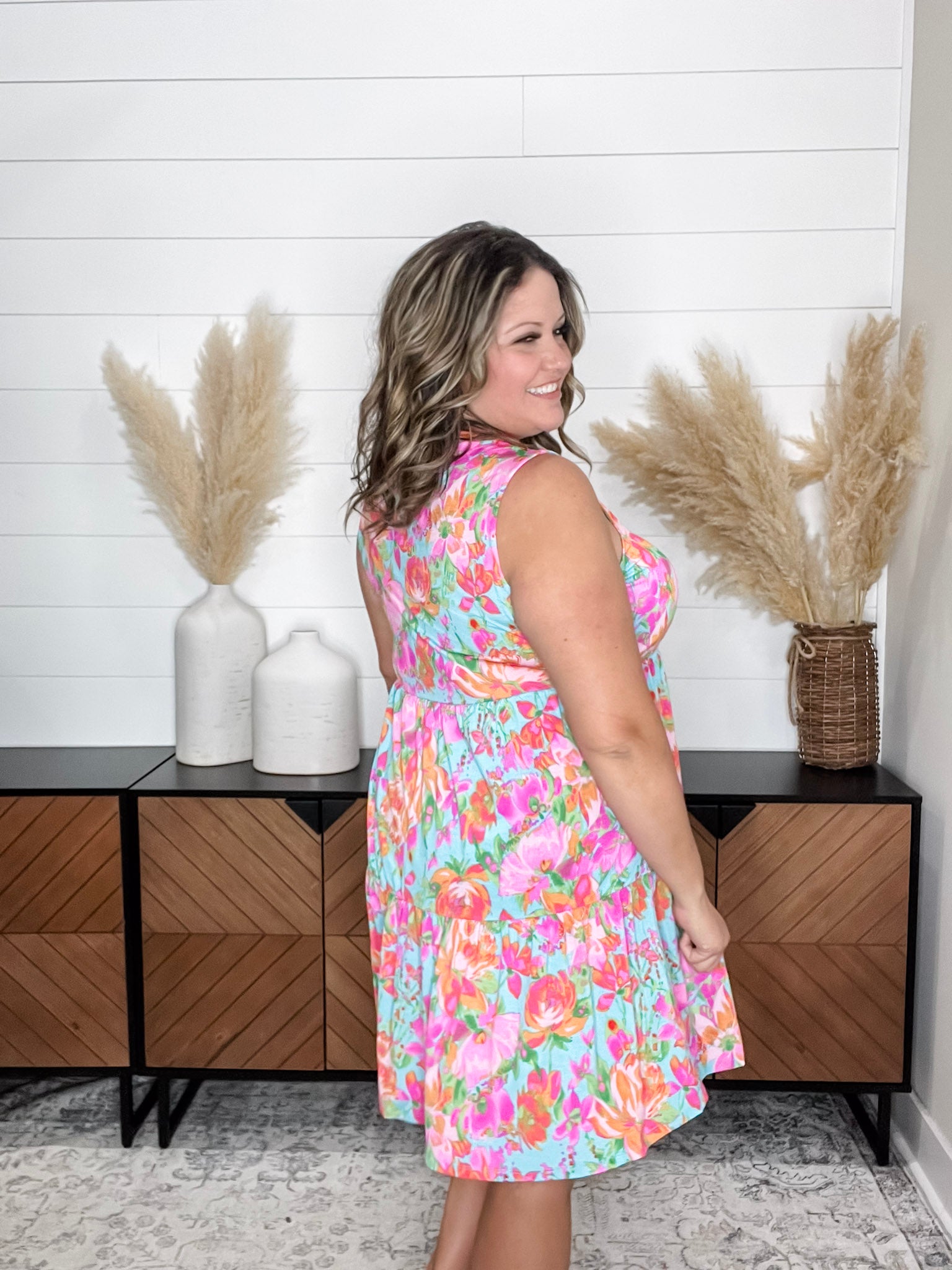 Experience effortless style with our "Bridgeport" Sleeveless Split Neck Tiered Dress by Dear Scarlett Brand. The Mandarin neckline and lapel lay flat to flatter large busts. Made with slinky stretch fabric, this dress is wrinkle-free and true to size with room to move. The mint base is adorned with vibrant pink and orange flowers for a striking look.