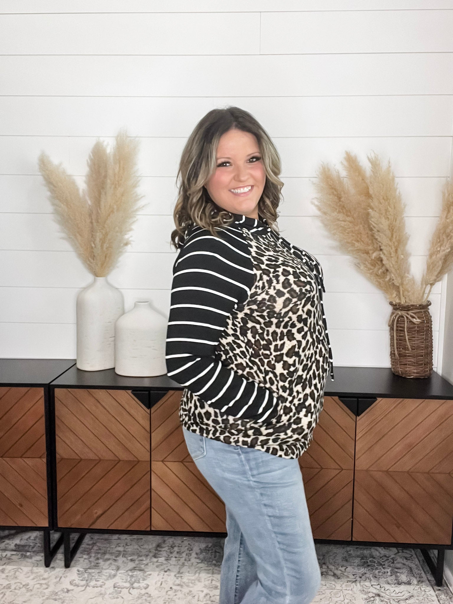 Color: Animal Print Body - Brown, Cream Black - Sleeve- Black and White Stripes