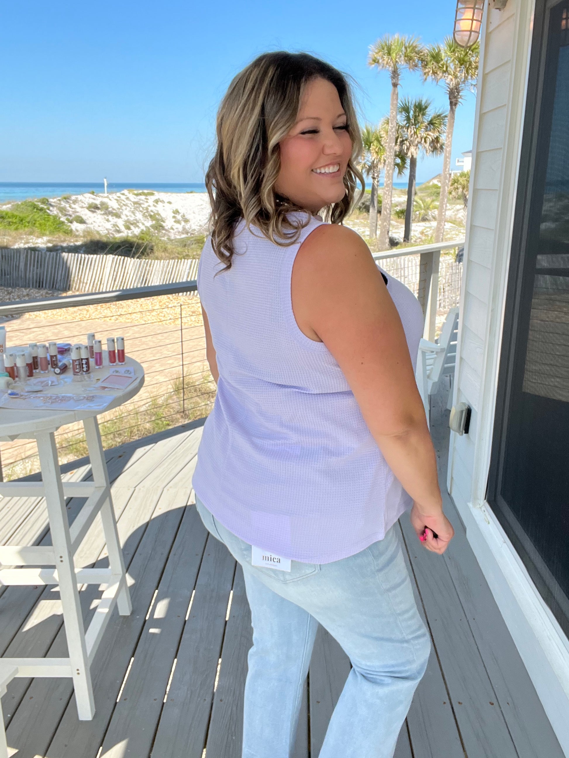 Elevate your style with our "Caldwell" Waffle Texture Tank. Made with a super soft and stretchy waffle knit, this sleeveless tank features a flattering v-neck and faux button details. For those with a larger bust, simply size up or wear a layered tank for a smooth, buttoned look. Expertly designed for a comfortable and stylish fit.