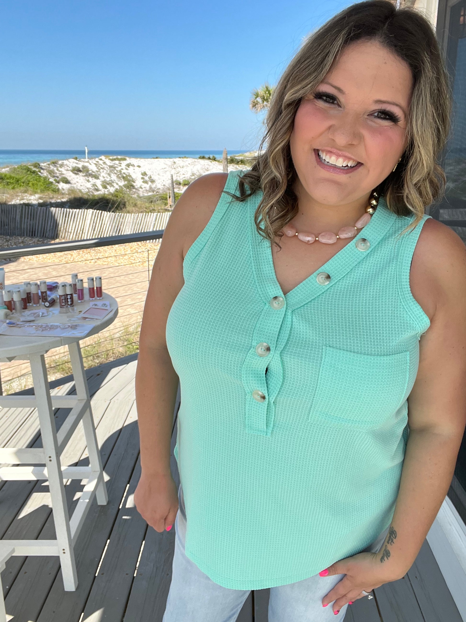 "Caldwell" Waffle Texture Tank with Chest Pockets and Faux Buttons (Mint)