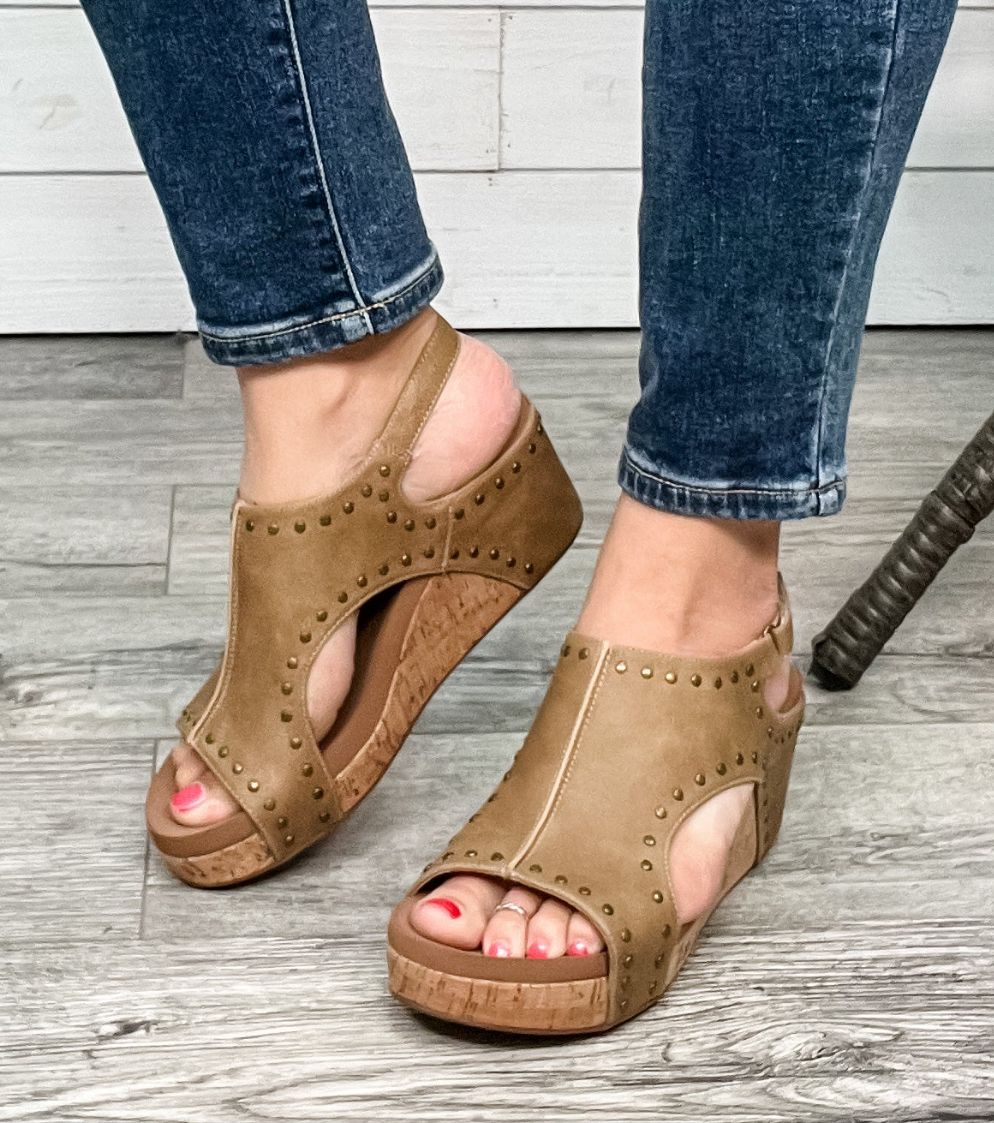Corkys "Carley" Wedge Sandal (Taupe Oil Studs)