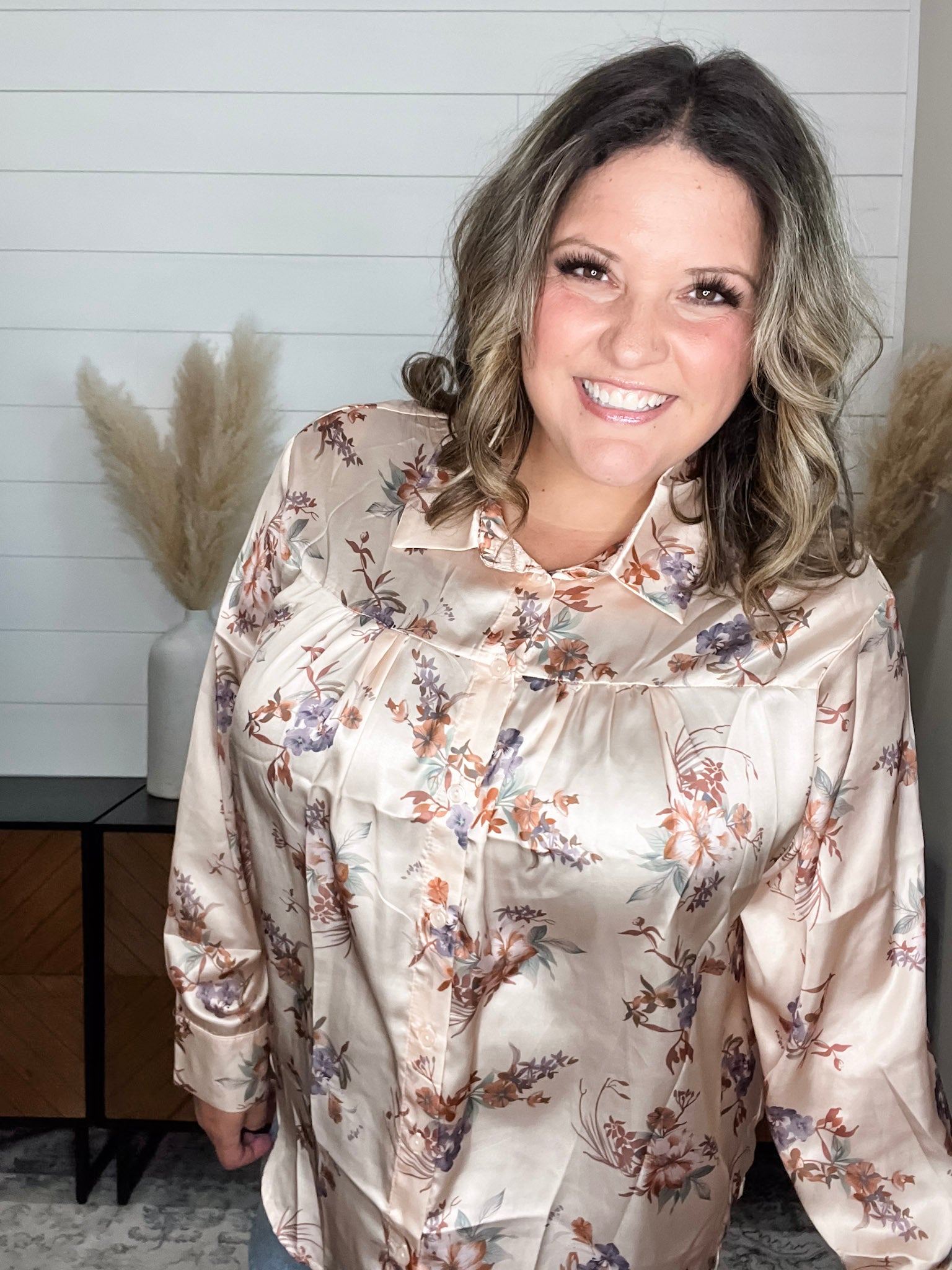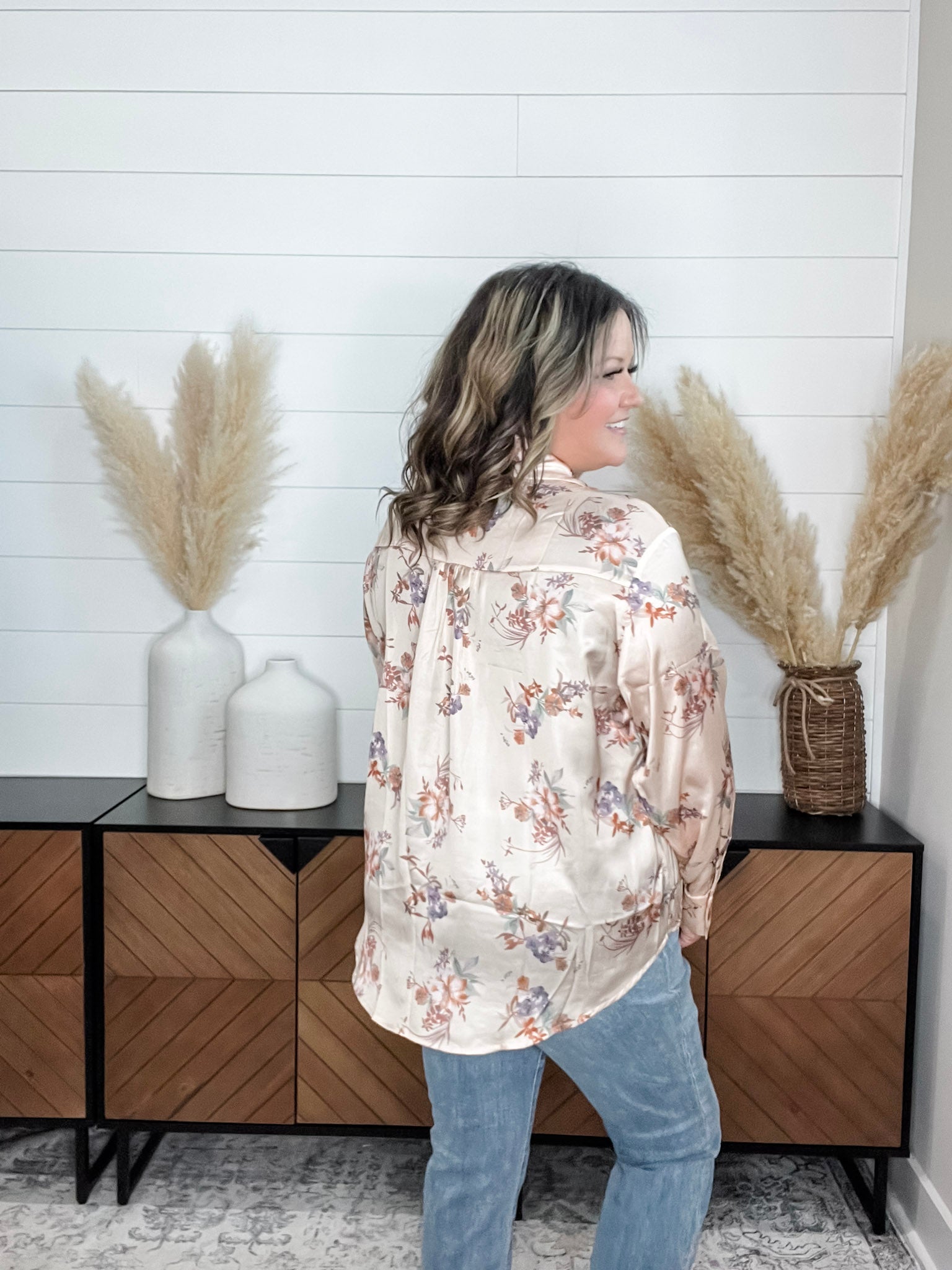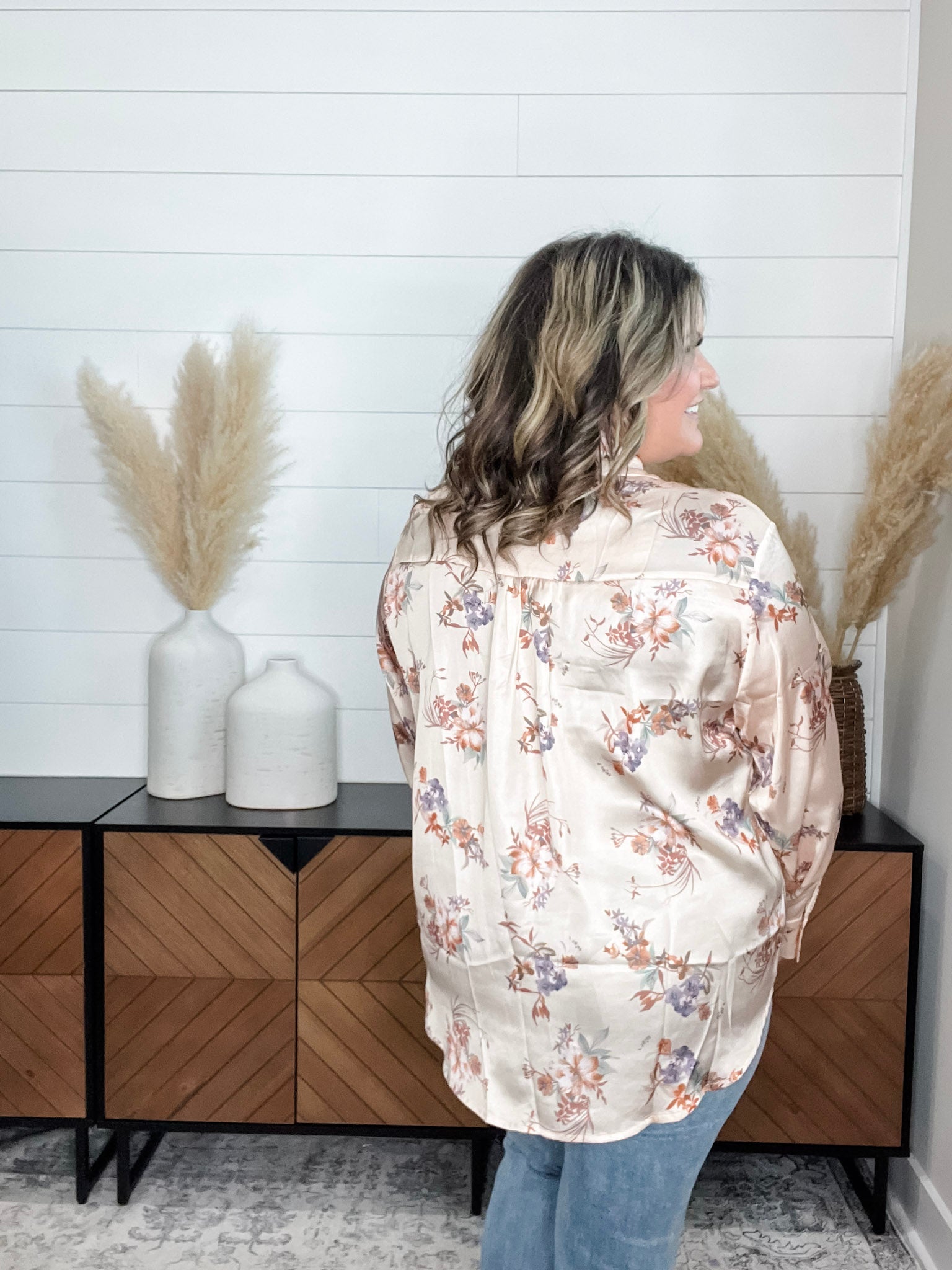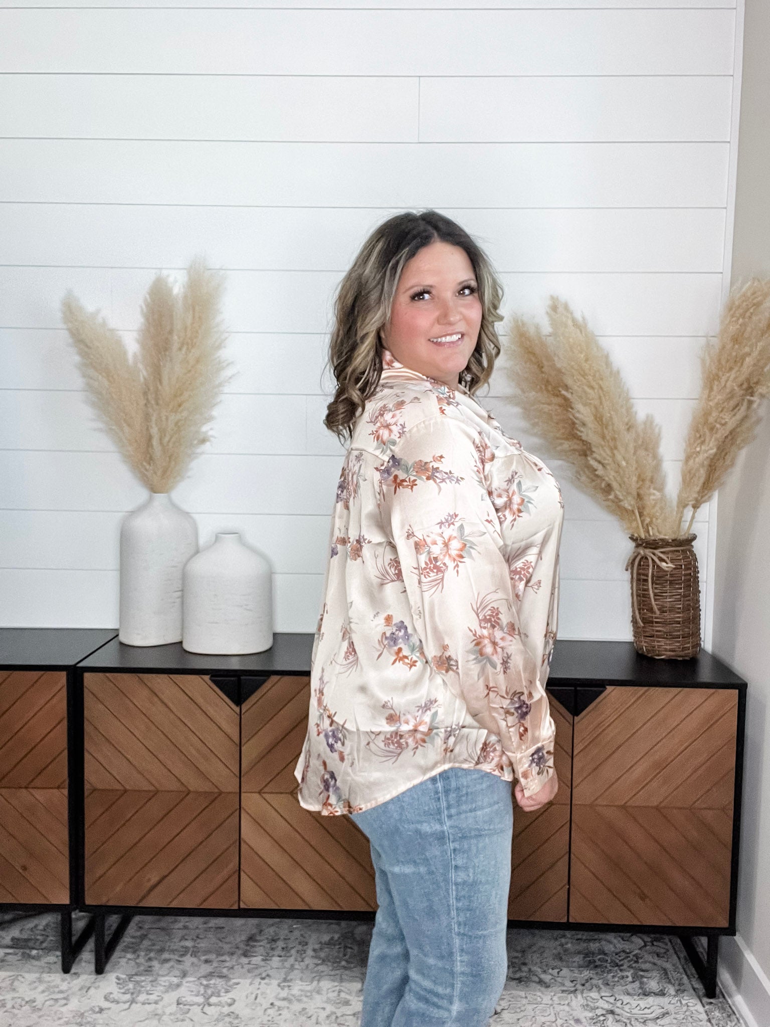 This "Corbine" Blouse features a beautiful satin floral design that will add a touch of elegance to any outfit. With a true-to-size fit, this button-down shirt is perfect for those with wider backs, shoulders, and larger busts as it lays flat. Look and feel great with "Corbine".