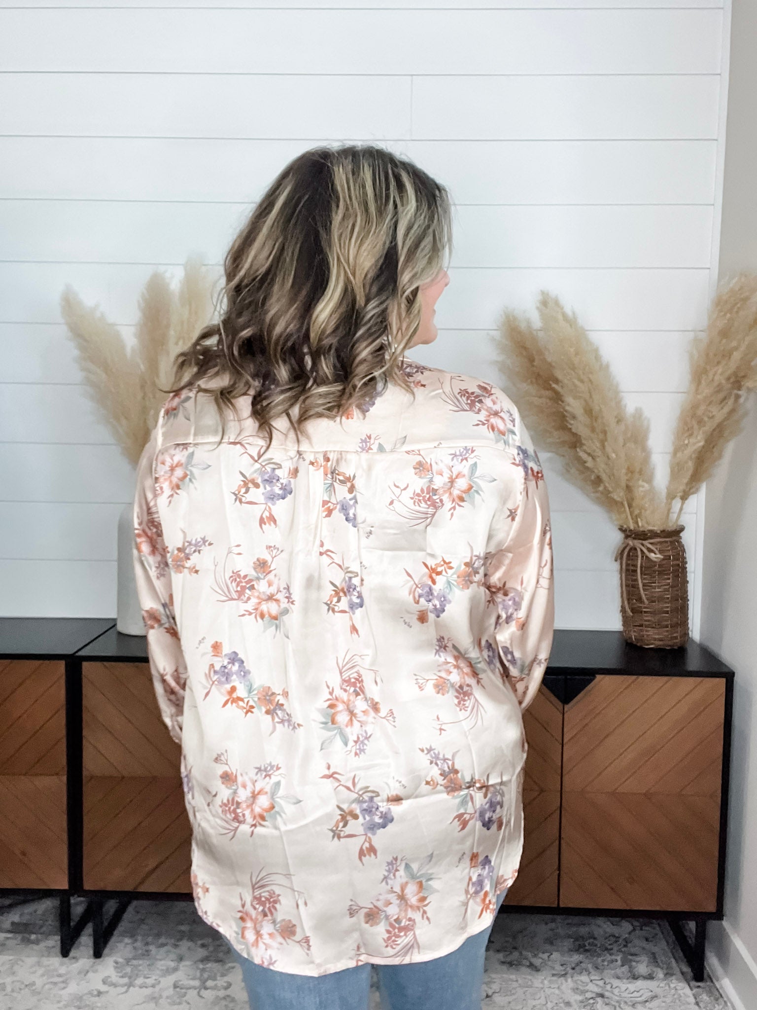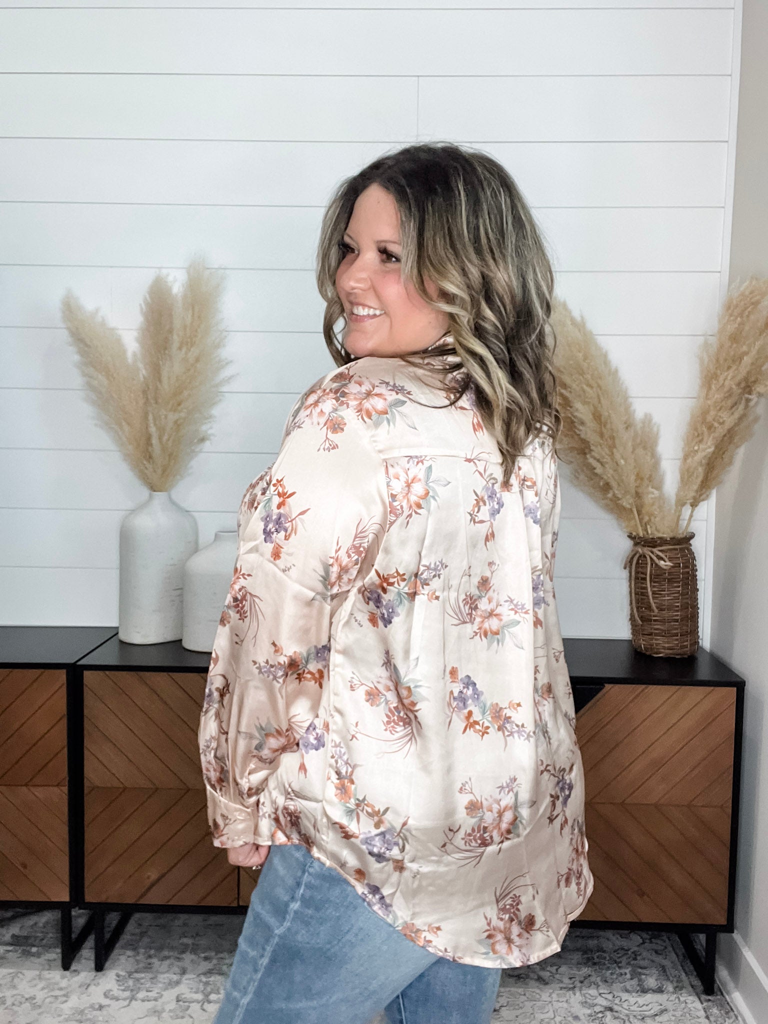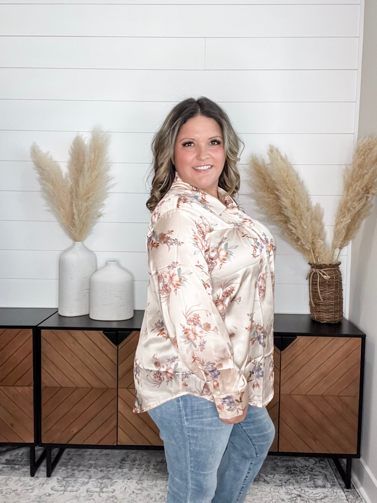 This "Corbine" Blouse features a beautiful satin floral design that will add a touch of elegance to any outfit. With a true-to-size fit, this button-down shirt is perfect for those with wider backs, shoulders, and larger busts as it lays flat. Look and feel great with "Corbine".