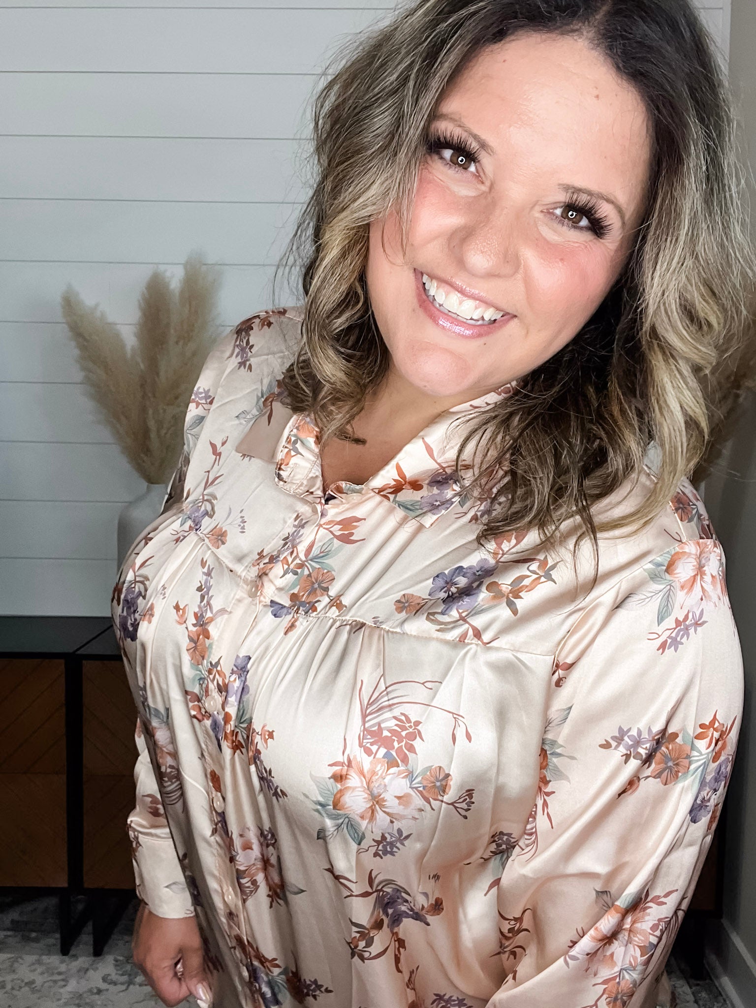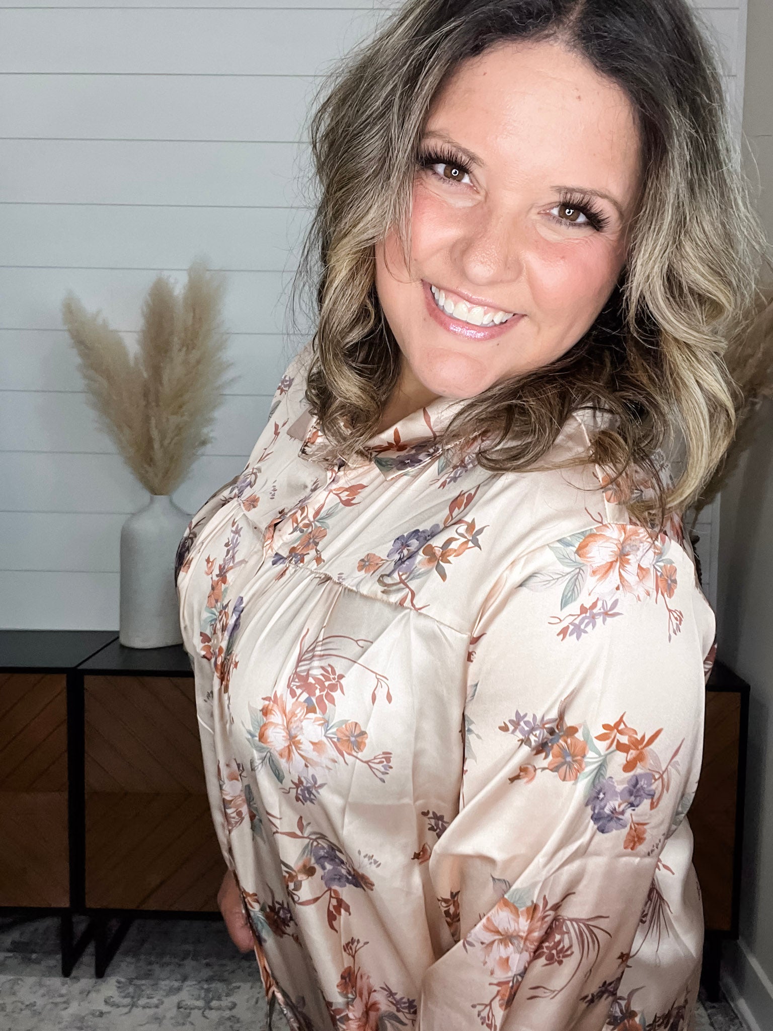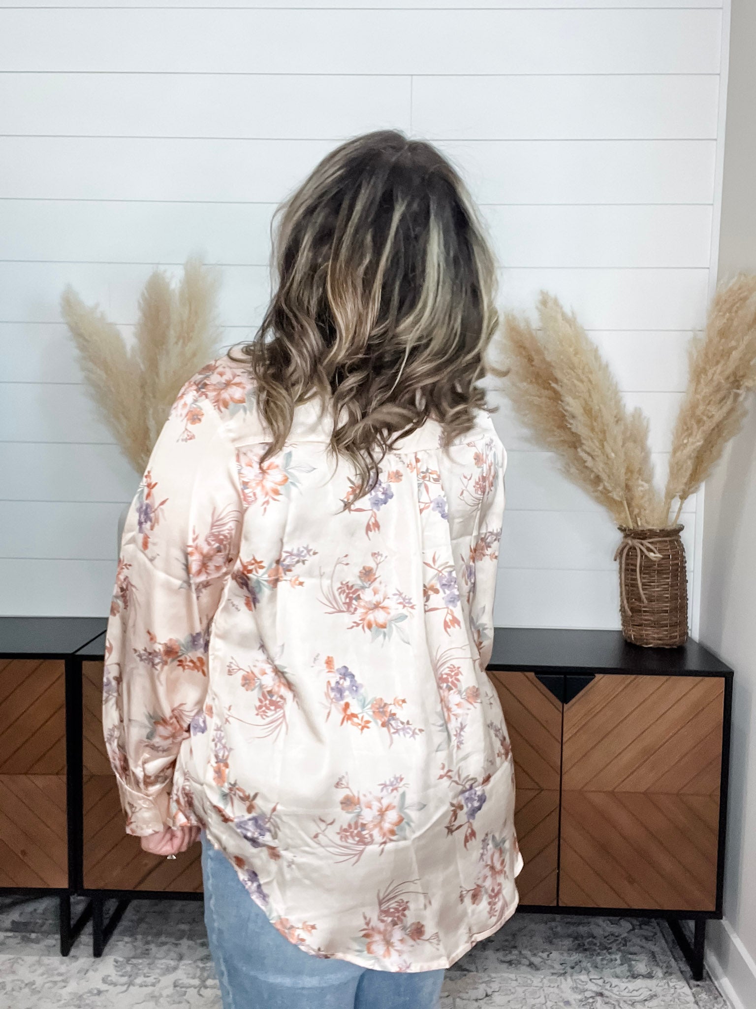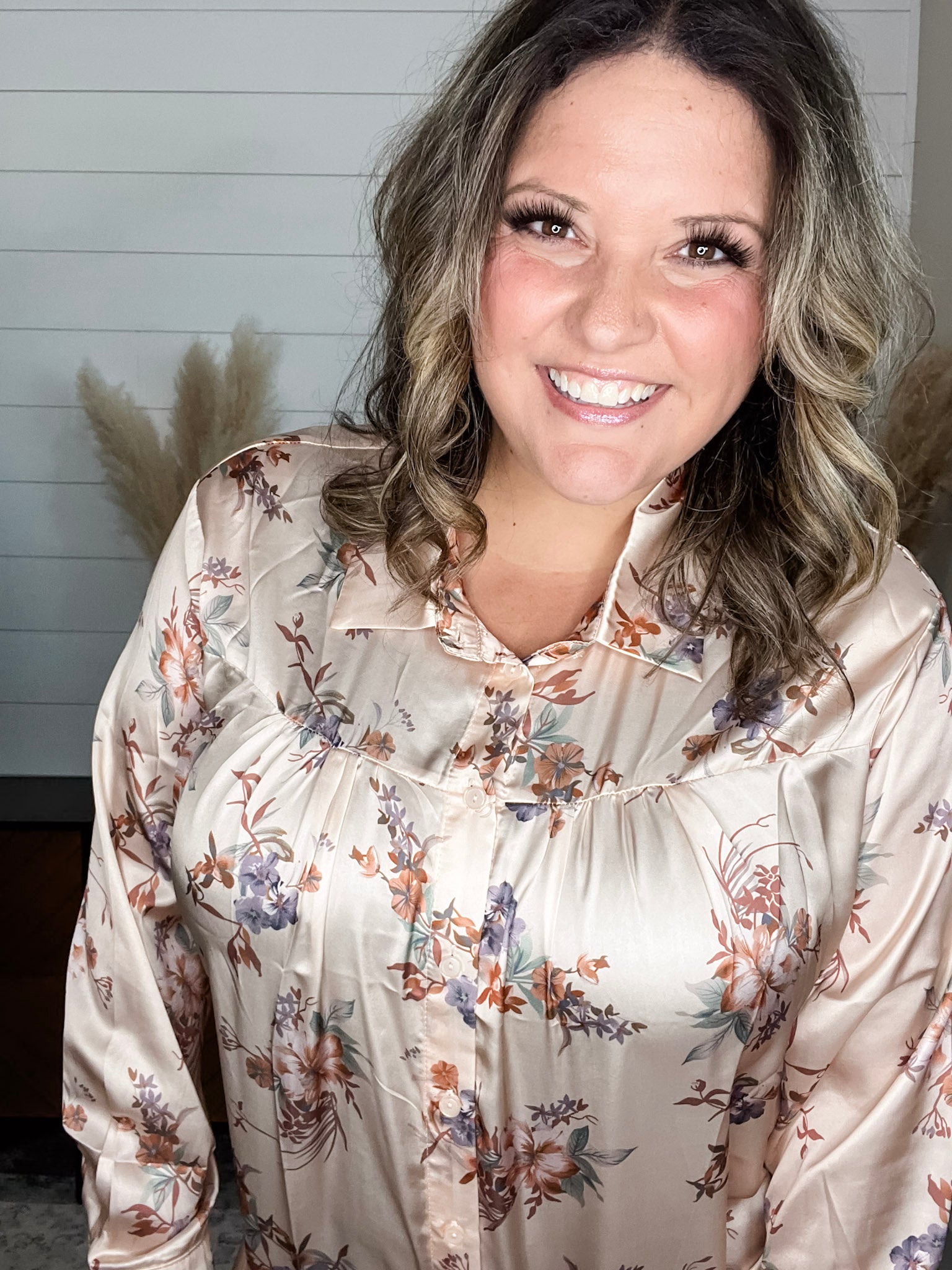 This "Corbine" Blouse features a beautiful satin floral design that will add a touch of elegance to any outfit. With a true-to-size fit, this button-down shirt is perfect for those with wider backs, shoulders, and larger busts as it lays flat. Look and feel great with "Corbine".