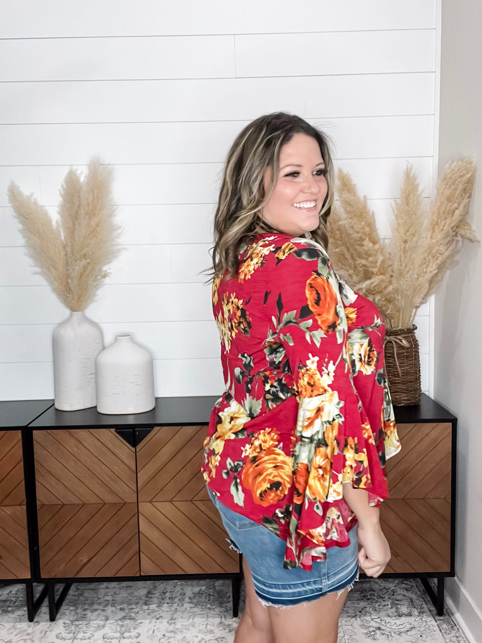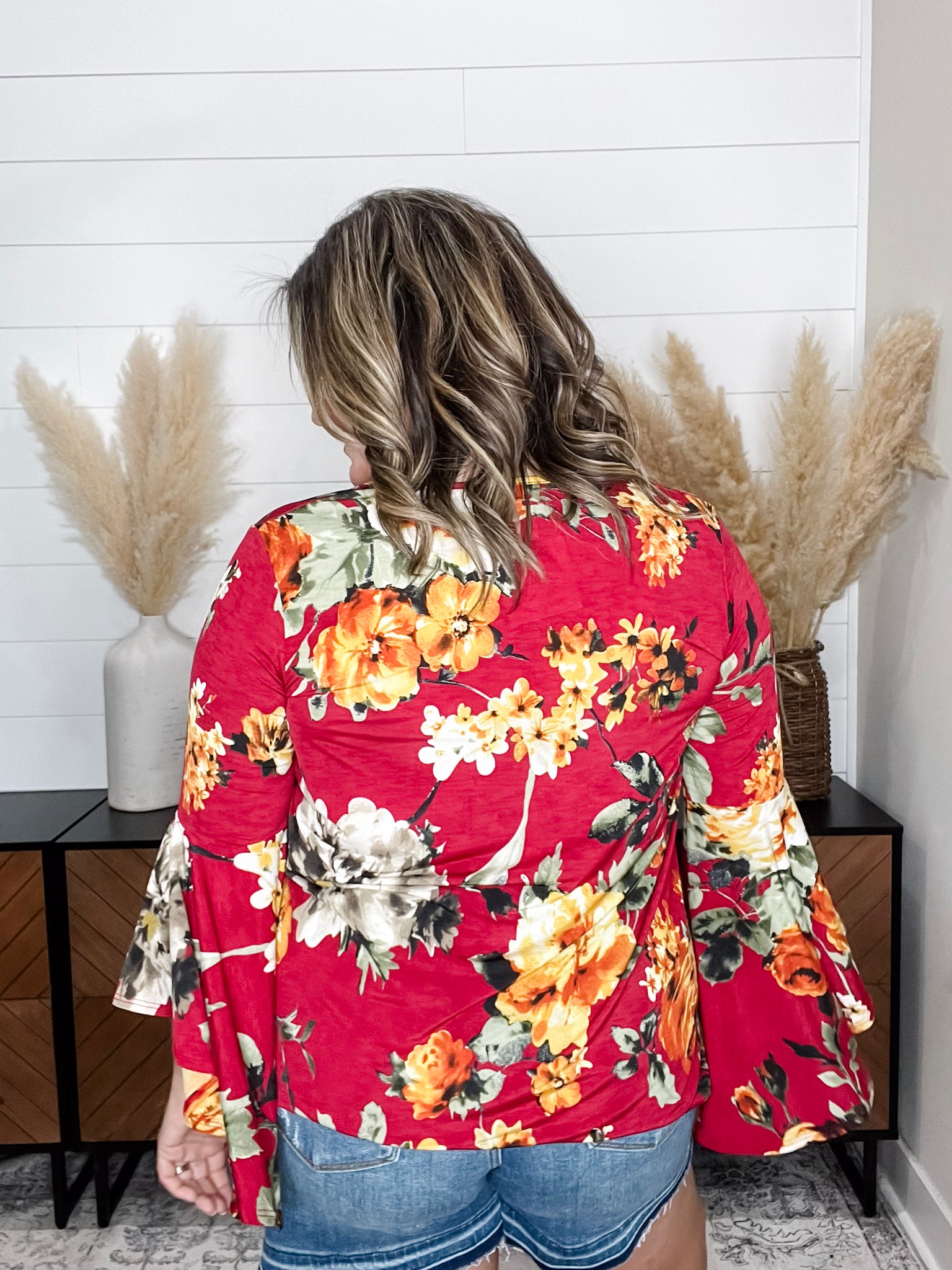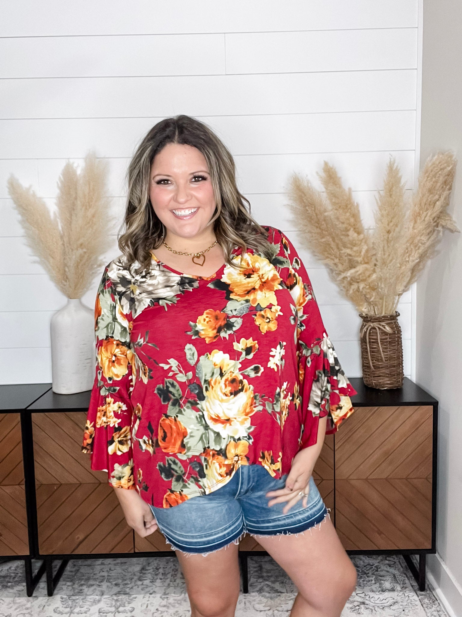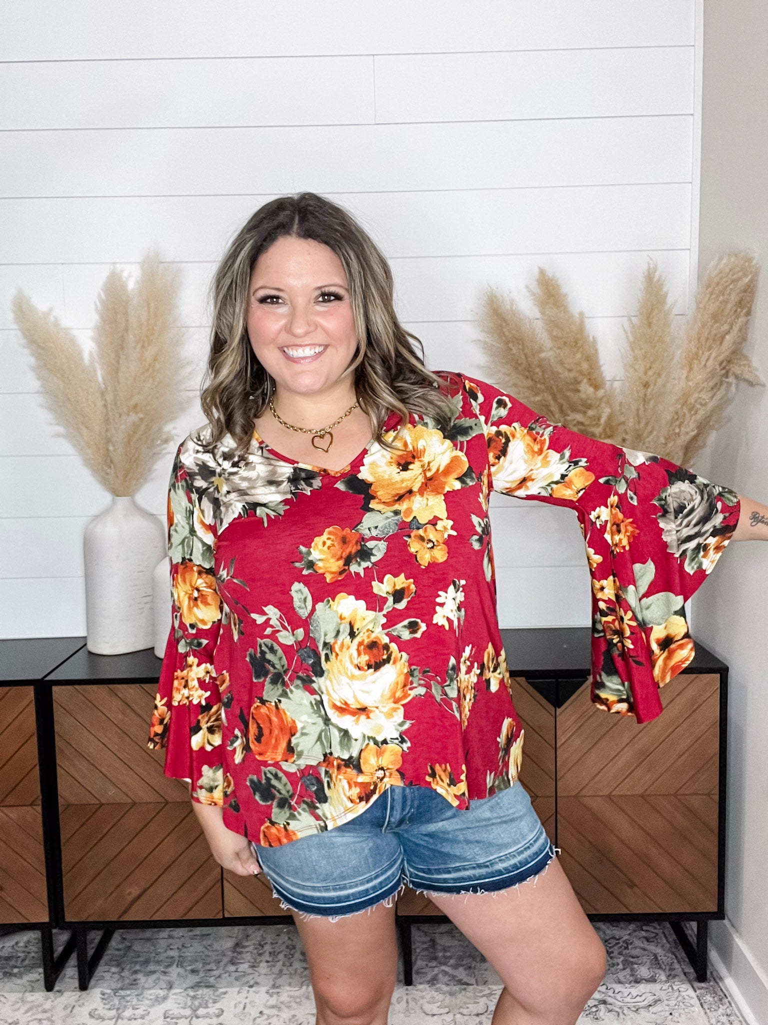 Expertly crafted with slinky, stretchy fabric on a rich burgundy base, this bell sleeve V-neck offers exceptional versatility. The distinctive reverse V at the front hem creates a flattering silhouette that elongates your frame. Size down for a tailored look with jeans, or choose your regular size for the perfect pairing with leggings.