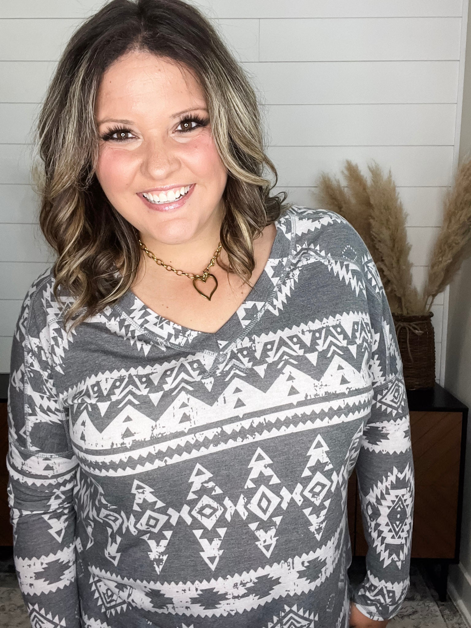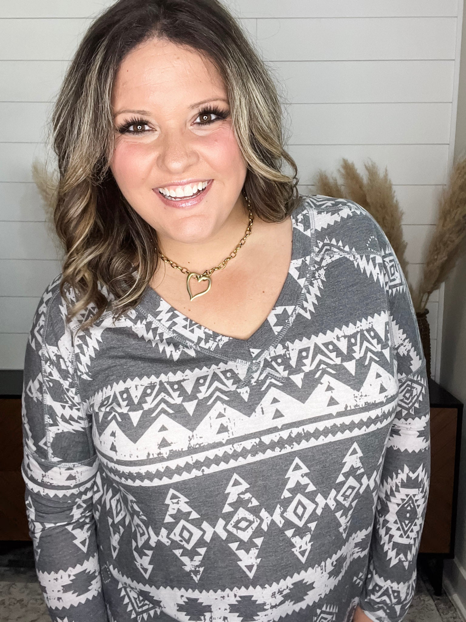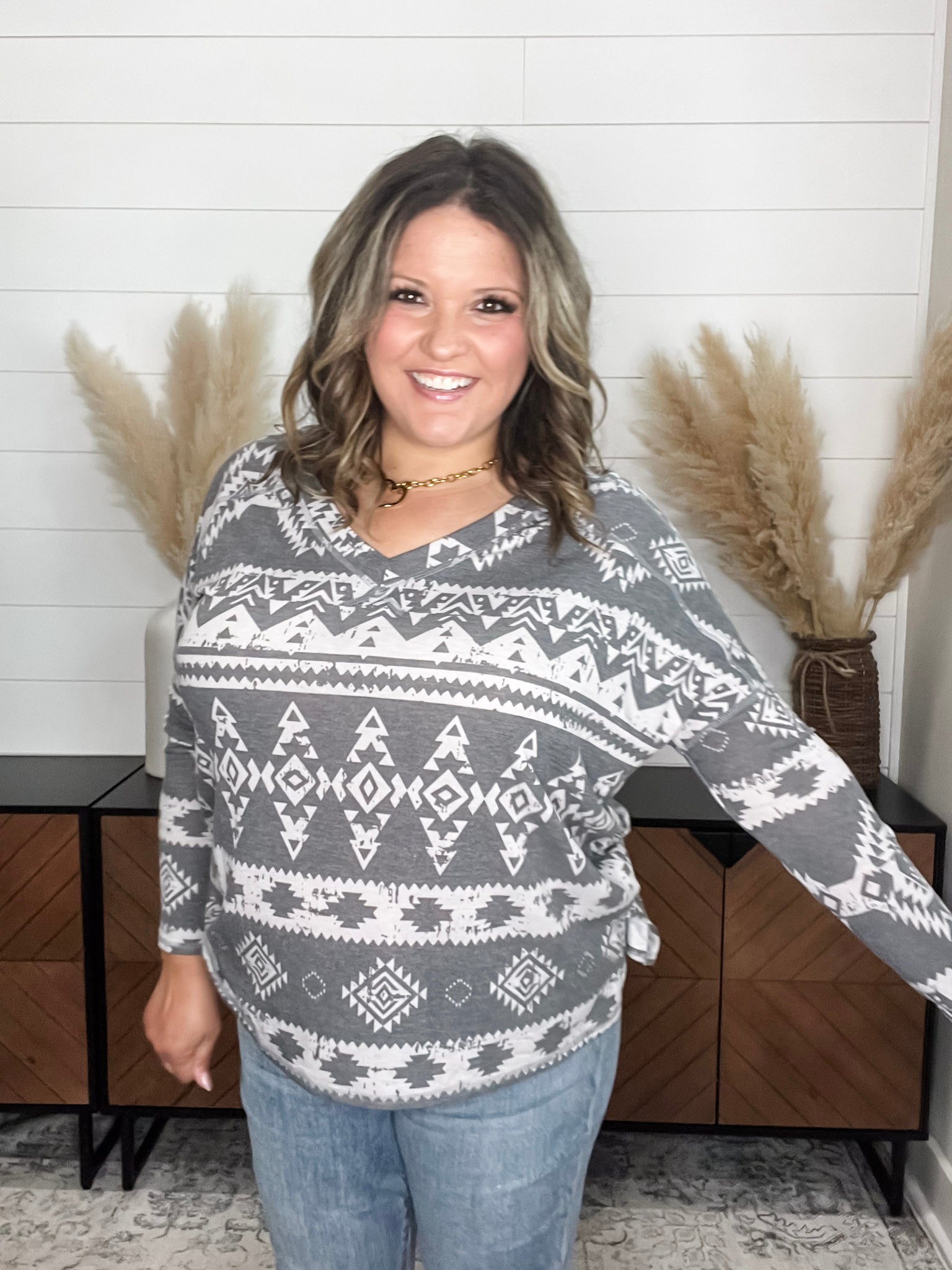 This playful "Cross That Bridge" top features an oversized fit with a wide V-neck that’s perfect for layering or wearing solo. Crafted from super soft fabric, it feels like a cozy hug all day long. The eye-catching Aztec print in grey adds a fun, vibrant touch to your wardrobe. Ash rocks this look in a size Large—get ready to turn heads with effortless style!