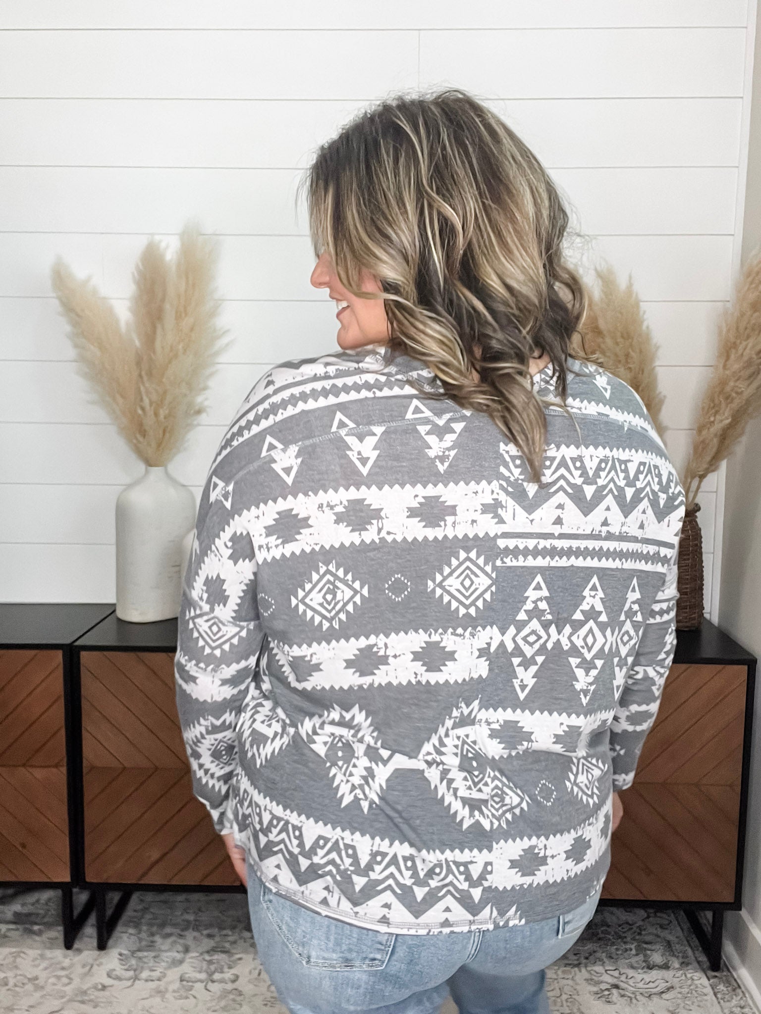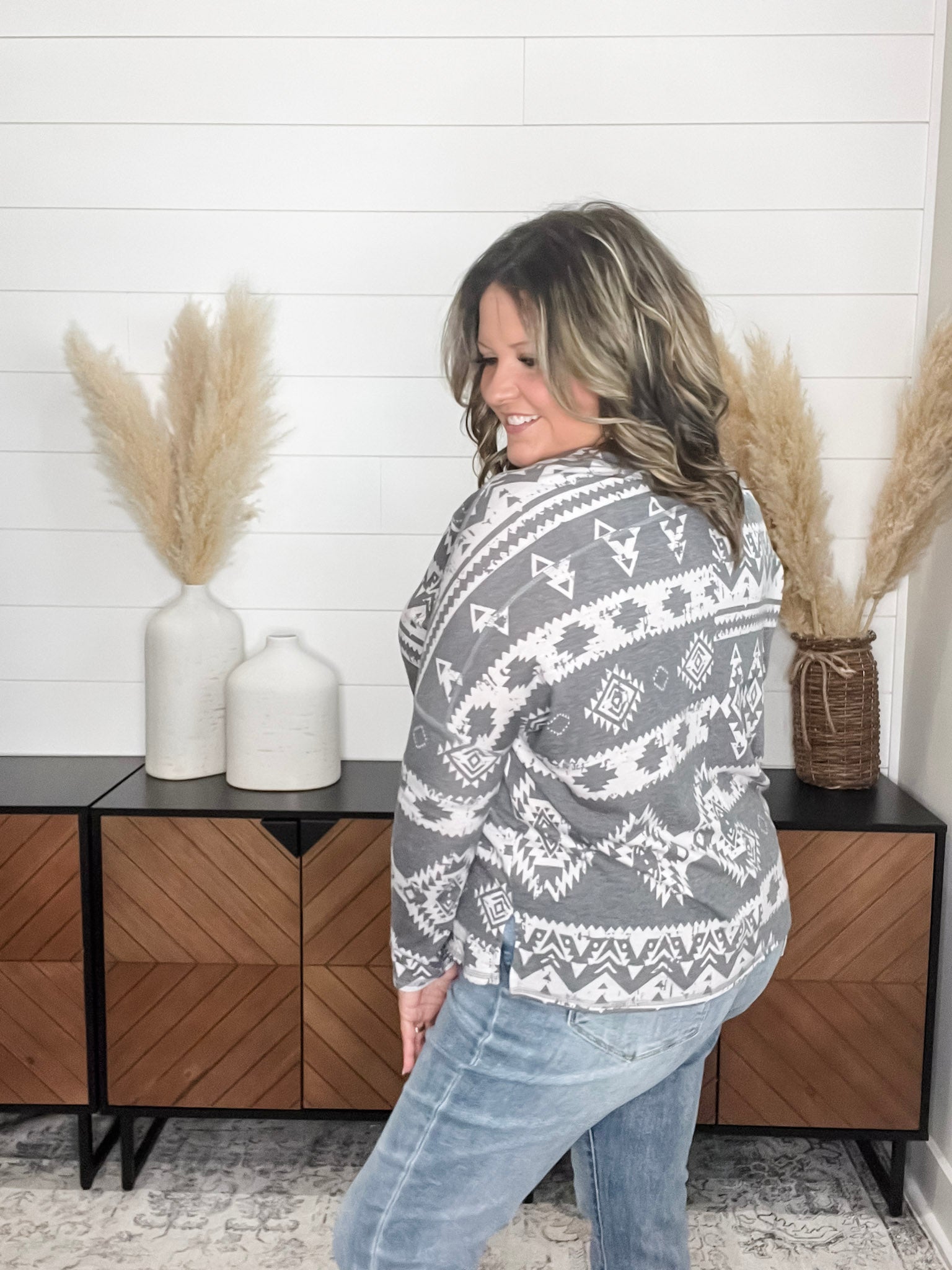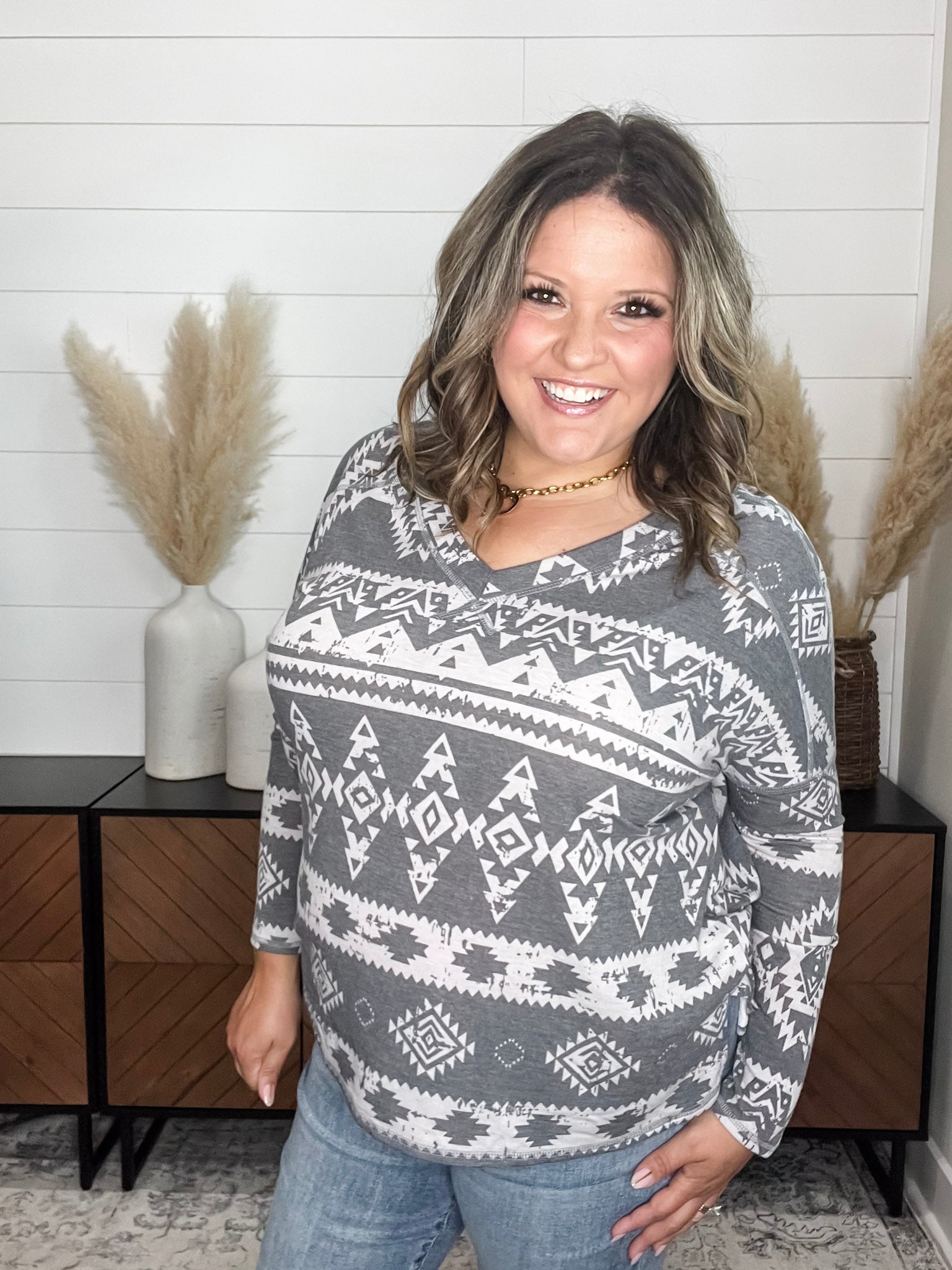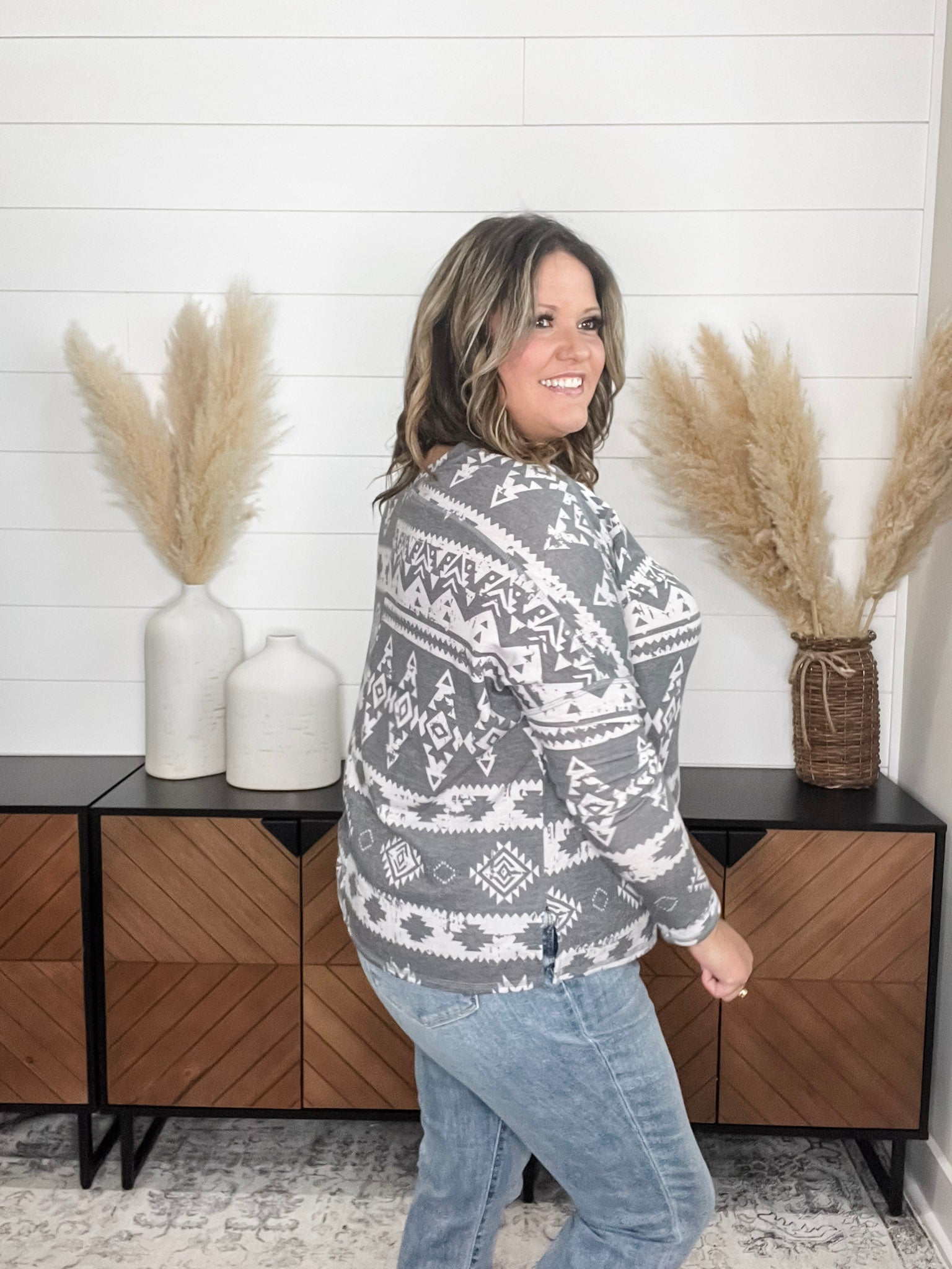 This playful "Cross That Bridge" top features an oversized fit with a wide V-neck that’s perfect for layering or wearing solo. Crafted from super soft fabric, it feels like a cozy hug all day long. The eye-catching Aztec print in grey adds a fun, vibrant touch to your wardrobe. Ash rocks this look in a size Large—get ready to turn heads with effortless style!