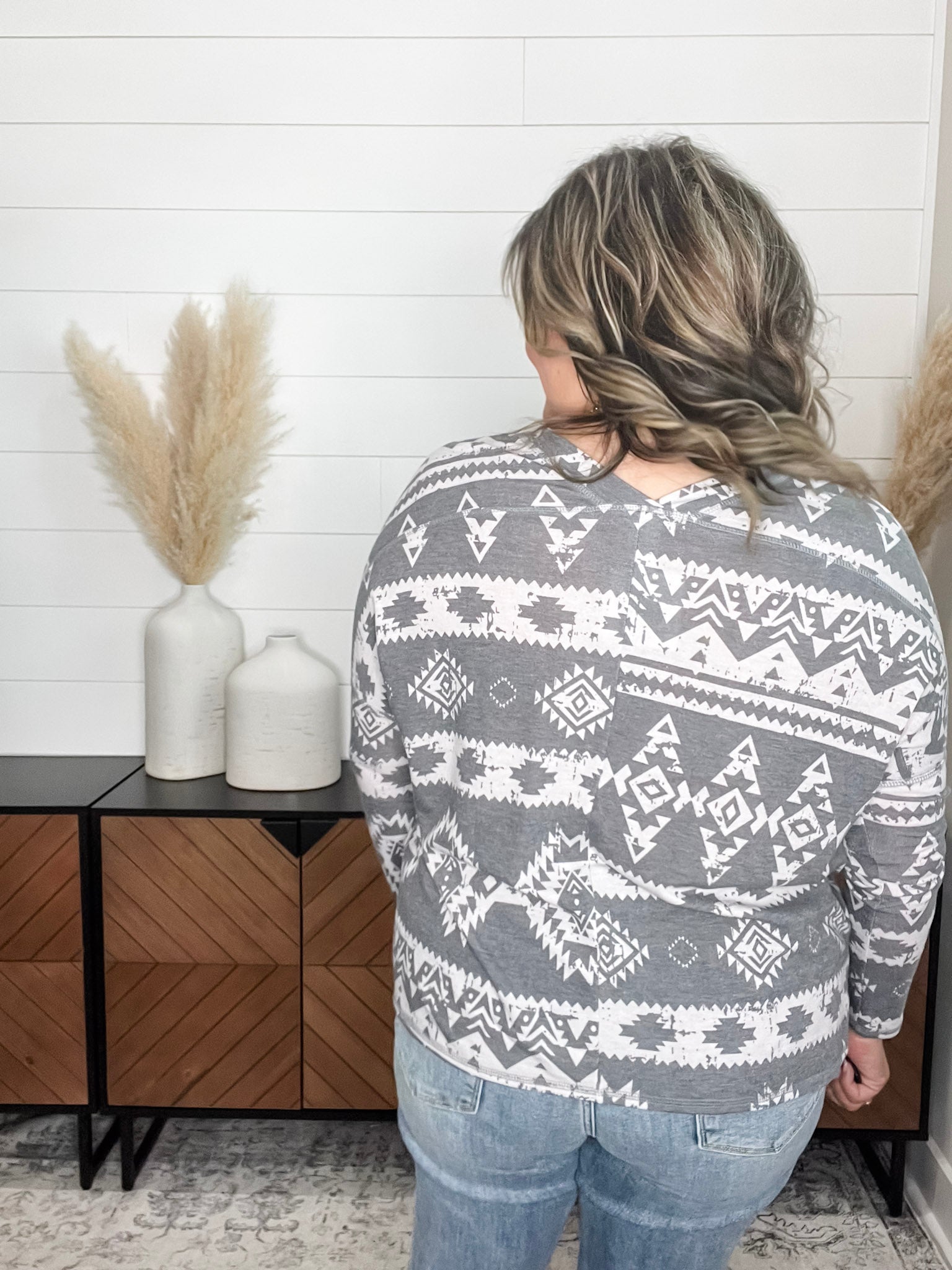 "Cross That Bridge" V Neck and Back Design Aztec Print (Grey)